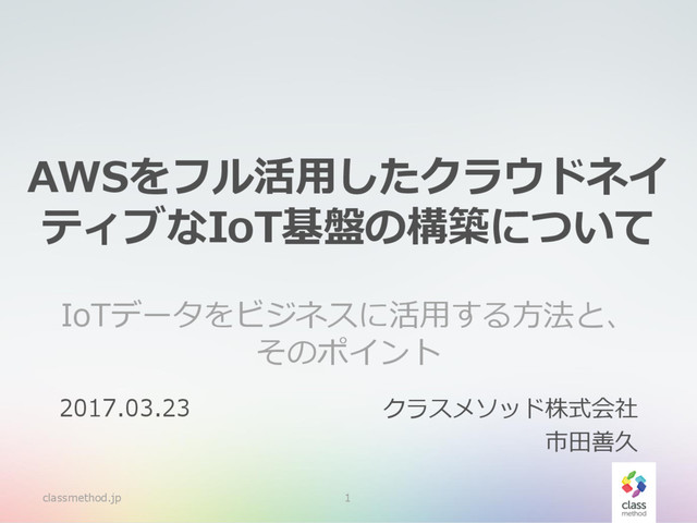 AWSをフル活用したクラウドネイ ティブなIoT基盤の構築について IoTデータをビジネスに活用する方法と、 そのポイント classmethod.jp 1 2017.03.23 クラスメソッド株式会社 市田善久