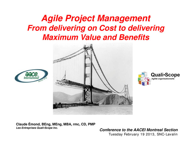 A COLLECTIVELY COMMITTED WHO (An ALIGNED WHO) realise successfully, meeting everyone's day-to-day expectations, SHOWING PROACTIVITY, CREATIVITY, GREAT REACTIVITY, FLEXIBILITY AND ADAPTABILITY (CONTINUOUS AGILITY OF THE HOW, WHEN, HOW MUCH) THE right things, meaning DELIVERABLES OPTIMISING VALUE FOR ALL (MAXIMUM BENEFITS «WHAT/WHY», FOR ALL) ALIGNED WHO= An integrated project team (P7) = All Stakeholders, who, thanks to: - shared values (V1,V2,V3,V4) - a shared vision of the project objectives (its WHY, its «raison d'être») - converging interests (V4) - Shared success criteria (P10) - required knowledge and sufficient resources (P2) - collaborative behaviour (V2) are committed to succeed together (P3) . realise successfully, using AGILE approaches and tools (HOW, WHEN, HOW MUCH), in particular: - openness and capacity to adapt to change (V3,P2) + a structure, an organisation, tools, technologies that are flexible and adaptable (P5, P6,O1,O2,O3,O4) and sufficient resources (P2) + responsible and autonomous human resources (P1, P2), reactive, flexible and adaptable + continuous change communication and management (P8,P9) + continuous learning and capitalisation of lessons learned (P10) - monitoring and innovation practices (P4) for optimal value (benefits) creation (V4, P10) - practices valuing HR and encouraging collaboration (V1,V2) THE right things, meaning THE DELIVERABLES ALLOWING MATERIALISATION OF THE PROJECT WHY (V4): - NEGOTIATED DELIVERABLES (WHAT) (P3) - ACCELERATING (P10) MATERIALISATION AND MAXIMISING PROJECT EXPECTED BENEFITS (O4) (WHY) - FOR ALL STAKEHOLDERS (V4) (FOR WHOM) . . . . . OPTIMAL STAKEHOLERS' ALIGNMENT (A1) OPTIMAL AGILITY IN PROJECT EXECUTION (A2) ACCELERATED BENEFITS (AB) AND OPTIMAL VALUE (V) RESULTS/OUTCOMES: «AGILE» Project Management is: In response to the global and turbulent business environment that characterises the 2010s, the only one that exists, (very complex, highly competitive, uncertain, permanently changing, requiring great velocity as well as a high level of creativity to constantly innovate and adapt) (WHERE) PRODUCTIVITY = A1 + A2 = AB + V = OPTIMAL MEASURABLE PROJECT PERFORMANCE/SUCCESS «Traditional» engineering-construction project management vs «Agile» project management