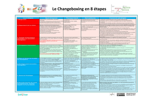 Les 8 étapes Quoi (moyens) Pourquoi (but) Qui (acteurs) Comment (stratégie) 1-Diagnostic 1-Rencontres «individuelles» de parties prenantes 2-Validation individuelle et collective des résultats du diagnostic et des priorités en découlant 3-Recommandations pour la marche à suivre 1-Confirmer et accroître le désir de changement 2-Augmenter le désir d'auto- organisation 1-Représentants de plus de groupes de parties prenantes possible 2-Choisis par leurs pairs, pas par la direction 1- Entrevues individuelles de 45-50 minutes confirmant les malaises/occasions, le désir de changement et les priorités d'action. 2- Confirmer par courriel les résultats/priorités et le désir individuel de s'impliquer 3- Présenter les résultats, priorités collectives et recommandations pour actions futures à la haute direction et à tous les participants aux entrevues 2-Alignement de la vision Session d'entraînement lancée par un directeur haut niveau (président, VP) pour: 1- Aligner la vision des volontaires de l'équipe de changeboxing sur le changement désiré, et promouvoir le besoin d'une approche collaborative du changement 2-Présenter le processus Changeboxing 3-Choisir les volontaires 4- S'entendre sur la date et le contenu de la première rencontre de Changebox 1- Fournir des ressources additionnelles 2- Stimuler le désir de changement 3- Stimuler l'auto-organisation 4- Stimuler l'émergence 1- T ous ceux qui ont été en entrevues à l'étape 1 et qui sont volontaires pour travailler au changement 2- T oute partie prenante intéressée à être volontaire 3-Généralement entre 15 et 40 personnes Généralement intitulé quelque chose comme «NOTRE amélioration collective de NOTRE processus/structure/outil XXX au bénéfice de NOUS TOUS»: 1- Commencer avec un mot de bienvenue de la haute direction 2- Poursuivre avec un partage d'information sur le diagnostic, les enjeux, les approches, les meilleures pratiques en lien avec le changement envisagé, approches collaboratives de changement 3- Expliquer sommairement le processus de Changeboxing 4- Discuter et s'entendre sur les premiers élément du plan d'action possible 5- Finaliser la liste des membres de l'équipe des volontaires du Changeboxing (généralement 10 à 20 personnes représentant tous les groupes de parties prenantes) 6- S'entendre sur le moment et la durée de la première rencontre Changebox 3- Partage d'information préalable à la rencontre Changebox 1- Assembler le matériel de support, de sources externe et interne, pour aider l'atteinte du résultat de la rencontre 2- Le matériel NE DOIT PAS être transmis aux participants avant la rencontre de Changebox 1-Favoriser l'auto-organisation collaborative pendant la rencontre changebox 2- Accélérer par la suite l'émergence d'un élément de changement collectif 1- Organisateurs internes de la rencontre changebox 2- Facilitateur/coach de la rencontre Rassembler/préparer le matériel de support suivant: 1- Ordre du jour de la rencontre (incluant le temps prévu pour chaque partie de la rencontre) 2- Exemples d'outils, formulaires, gabarits, parties de processus, organigrammes, propositions de changement documentées, perrtinents au changement désiré 3-Gabarit de travail pour aider le développement de l'élément de changement (MindMap-liste-matrice de R&R générique, etc) 4-Changebox (rencontre) 1-Rencontre visant la production d'un livrable, sous forme d'un «prototype» facilement utilisable 2- Équivalent d'un «timebox» de 3 à 7 heures, tel que défini en Gestion de projet agile; aussi appelé «changebox» 3- Prototype à produire, par négociations de sous- groupe et de groupe (pas de travail individuel permis), à l'intérieur de la durée pré-déterminée du changebox 4- Livraison de ce «prototype-livrable» à la fin de la rencontre EST OBLIGATOIRE 1- Contraintes de temps rigides et négociations collectives (par groupes)favorisent l'auto- organisation accélérée et l'émergence des éléments de changement 2- Le livrable «obligatoire» résultant est une nouvelle ressource favorisant l'évolution de l'élément de changement, comme le fait sa nature de «prototype» 3- Créer un bénéfice tangible stimulant le désir de pousser plus loin la démarche de changement 1- Accompagnateur externe ou ressource interne perçue par les parties prenantes comme un facilitateur légitime, transparent et digne de confiance 2- Un membre de la haute direction pour la partie introduction du chanbebox 3- TOUS les membres de l'équipe de volontaires, parce que des liens initiaux de collaboration précieux émergeront de ce premier changebox Ordre du jour type du PREMIER changebox: 1- Mot de bienvenue d'un membre de la haute direction 2- Présentation de l'ordre du jour 3- Présentation des documents de support à l'équipe, incluant le gabarit MindMap/liste 4- Division des participants en sous-groups de 3 à 6 personnes pour élaborer les propositions de livrables des sous-groupes 5- Remue-méninges et négociation entre les sous-groupes pour une proposition unique de contenu du livrable 6- Entente finale sur le prototype-livrable tel que reflété dans le gabarit 7- Conclusions et décision sur la période de test du livrable, ainsi que sur le sujet et la date du prochain changebox 5-Mise en forme du livrable du Changebox 1- Formatage du livrable en «forme utilisable», dans les 48h suivant la fin de la rencontre 2- Formater pour refléter EXACTEMENT ce qui a été décidé collectivement sur le contenu et le format du livrable, pendant les négociations du changebox Produre une ressource utilisable additionnelle aussi vite que possible, conforme au contenu négocié: 1- Accélérer l'évolution 2- Stimuler davantage le désir de changement 1- Coach/accompagnateur externe ou représentants internes de l'organisation en changement (parties prenantes directes) 2- Formatage par les parties prenantes directes est l'option privilégiée pour encourager et 1- Pr