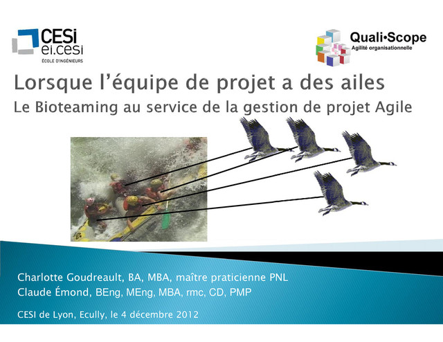 Novembre & Décembre 2012 Page 22/28 « Lorsque l'équipe de projet a des ailes : le Bioteaming au service de la gestion de projet Agile » Cette conférence animée en duo par Charlotte Goudreault et Claude Emond, organisée par le CESI en partenariat avec le PMI® Pôle Lyonnais, s’est déroulée le 4 décembre, a encore fait salle comble (plus de 100 participants) et a permis au Pôle Lyonnais de clore 2012 « en fanfare » avec une production inégalée de 8 évènements sur l’année. Une thématique… (pas si) décalée ! Si le thème des projets agiles commence à être assez couvert aujourd'hui, les deux conférenciers se sont donnés comme mission de nous faire découvrir les liens entre l’organisation des équipes de projets agiles et les stratégies d’organisation/de communication du règne animal… Pris pour exemple : l’auto-organisation efficace chez les fourmis, la communication des « bons plans » par phéromones chez les abeilles, le passage de relais et l’entraide des membres en difficulté chez les oies sauvages… Au-delà des techniques et des outils, les deux conférenciers ont bien fait passer le message que l’agilité repose en premier lieu sur des valeurs. Pas si bête… A découvrir dans le support de présentation. Un format original et des intervenants chevronnés Les deux conférenciers québécois ne sont pas des inconnus, puisqu’il s’agissait de Charlotte Goudreault et Claude Emond. La nouveauté de cette année a été cette co- animation de choc ! Un duo bien rôdé depuis quelques décennies… Bien qu’apportant des concepts avant-gardistes ils ont, comme à l’habitude, illustré par l’image, l’exemple, l’expérience et les histoires racontées. Avant la séance d’échange avec les participants, la conférence s’est achevée par l’interprétation à deux voix d’une chanson au titre opportun "Les oies sauvages" du groupe québécois "Mes aïeux". Une conférence unanimement plébiscitée par les participants. L'ensemble des participants a exprimé sa satisfaction (100%, dont 98% avec la note maximale), Les professionnels du management ont autant apprécié la grande qualité des présentations, le pragmatisme des réponses aux nombreuses questions, ainsi que les nombreuses notes d'originalité. Parmi les participants, nous avons eu le plaisir d’accueillir Christophe Samard, Président du Pôle Loire et Christine Rieu, représentante du Pôle Savoie. Pour découvrir la présentation : Cliquer ici Rédacteur : Cyril Docquin, Président du Pôle Lyonnais Le comité de rédaction tient à féliciter Cyril pour sa toute nouvelle élection en tant que président du Pôle Lyonnais et a le plaisir d’accueillir 2 nouveaux bénévoles au sein du pôle Lyonnais : Eric Alnet et Antoine Delahaye. Responsable de la publication pour la Branche Rhône Alpes : Monique Bonilauri, Chef de Projet, PMP®,