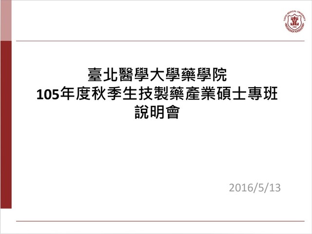 臺北醫學大學藥學院 105年度秋季生技製藥產業碩士專班 說明會 2016/5/13