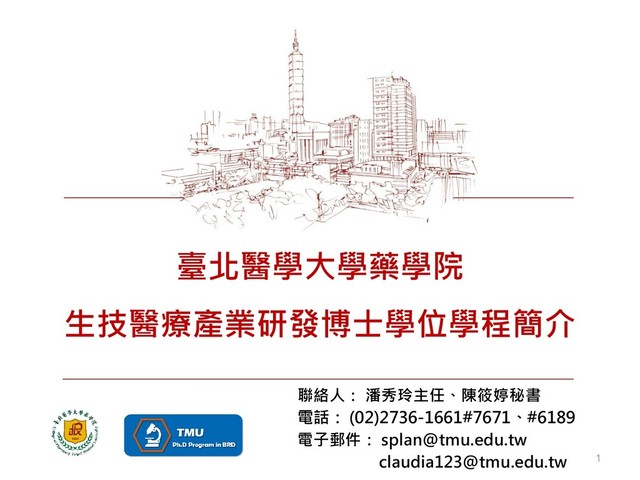 臺北醫學大學藥學院 生技醫療產業研發博士學位學程簡介 聯絡人: 潘秀玲主任、陳筱婷秘書 電話: (02)2736-1661#7671、#6189 電子郵件: