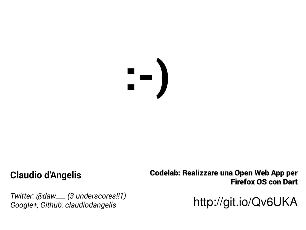 Codelab: Building an Open Web App for Firefox OS with Dart https://github.com/claudiodangelis/dartdemo-appdays2014