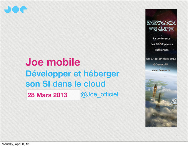 Cloud : à quel prix? Service Prix /mois Détail Cloudbees (PaaS) 190 $ 12 applis Tomcat, actives ou non 3 instances MySQL dont une de 1Go SVN, Jenkins 10K mn de build en small Qq heures de build en Large SendGrid (Mail) < 1 $ Alerting mail et Newsletter Atlassian (Jira/Confluence) 300 $ 50 utilisateurs TOTAL ~ 400 € Monday, April 8, 13