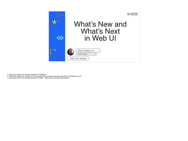 JavaScript Cleyra Uzcategui she/her Software Engineer • Raise your hand if you consider yourself a JS developer… • My mission today is to convince you to move away from Javascript and start using CSS and HTML for your UI • Raise your hand if you consider yourself a JS hater… Well, you’re in the right place today ;)
