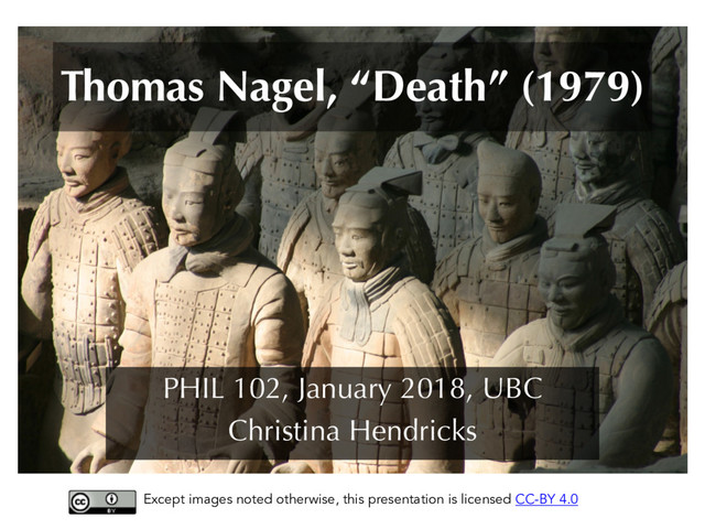 Slides for an Introduction to Philosophy course at the University of British Columbia in Vancouver, BC, Canada. The slides are about an article by Thomas Nagel called "Death" (from his book Mortal Questions).