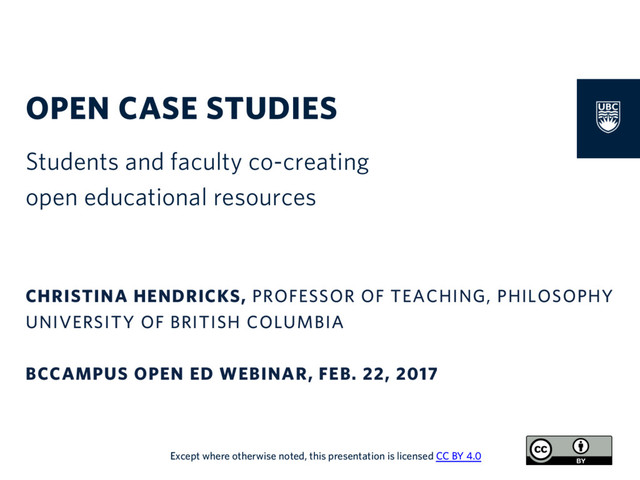 A set of slides for a webinar I did with BCcampus in February 2017. They talk about an open educational resource called Open Case Studies that students and faculty are writing together.
