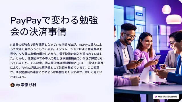コード決済の普及 により、PayPay が新たな解決策として注⽬を集めています。この変⾰ が、IT 系勉強会の運営にどのような影響をもたらすのか、詳しく⾒てい きましょう。 by 宗徳 杉村