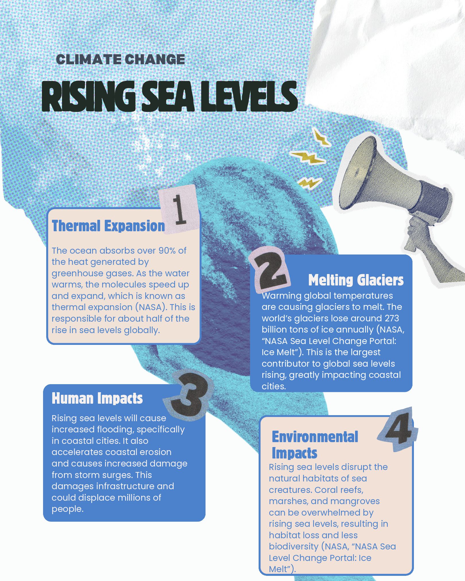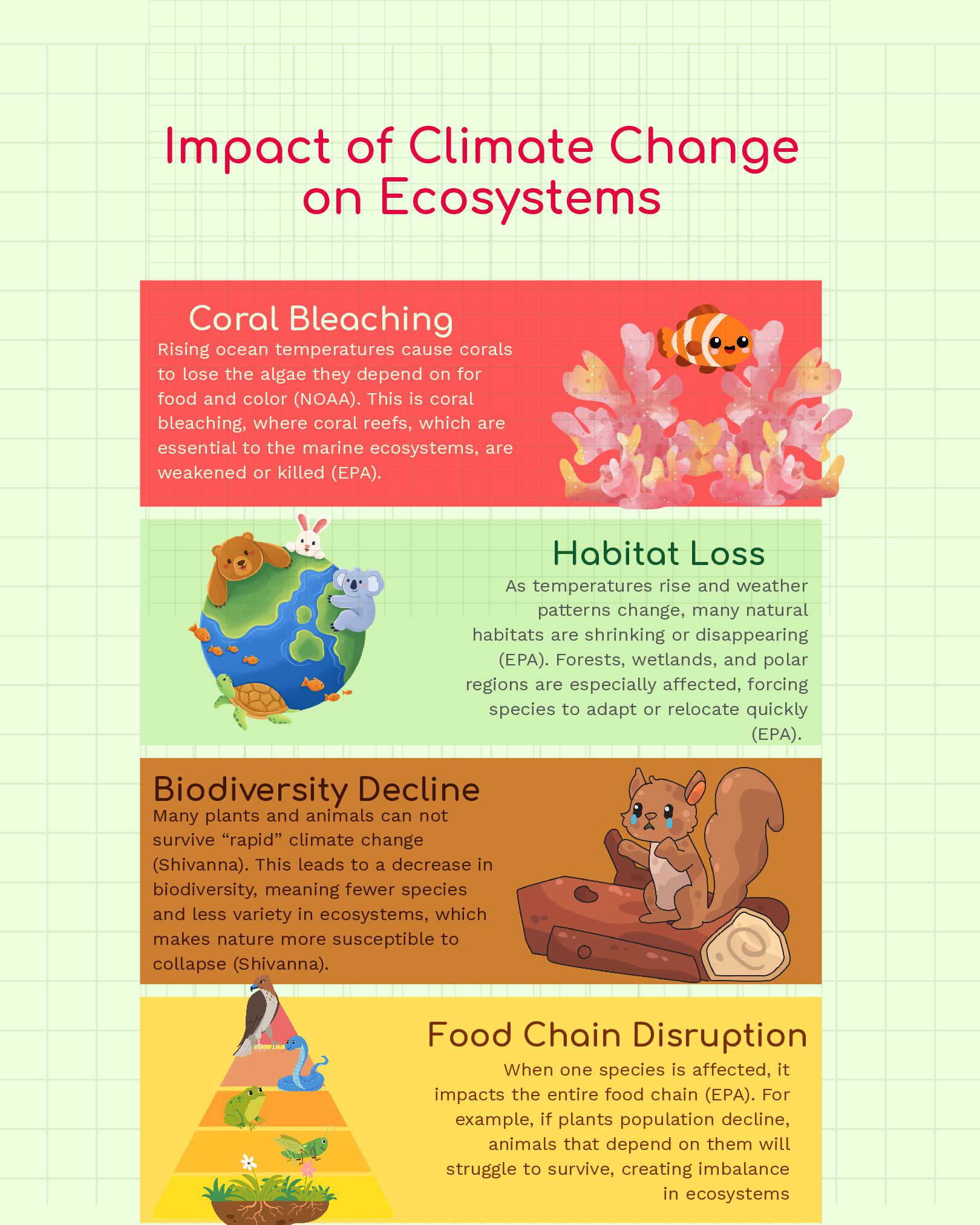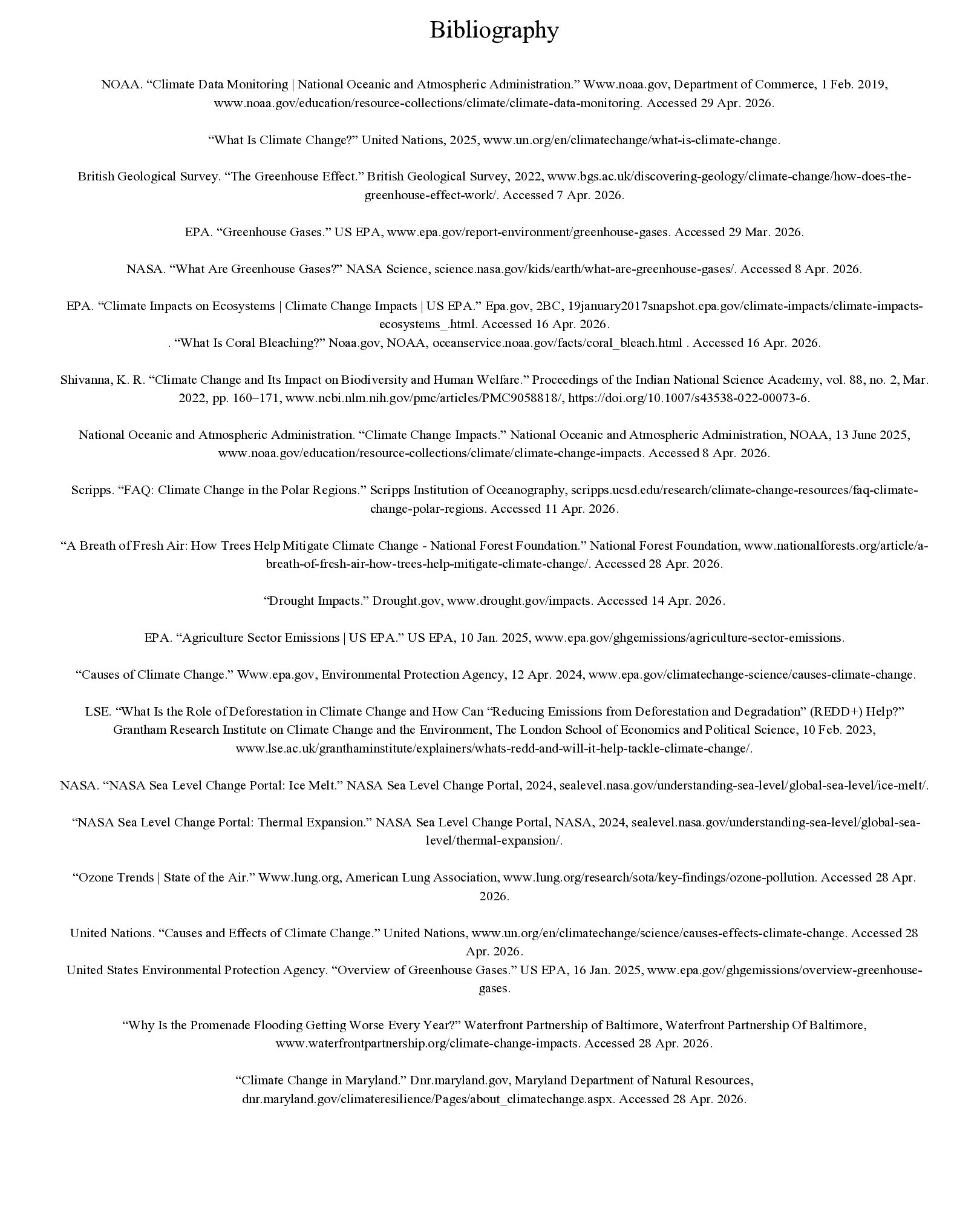 Administration.” Www.noaa.gov, Department of Commerce, 1 Feb. 2019, www.noaa.gov/education/resource-collections/climate/climate-data-monitoring. Accessed 29 Apr. 2026. “What Is Climate Change?” United Nations, 2025, www.un.org/en/climatechange/what-is-climate-change. British Geological Survey. “The Greenhouse Effect.” British Geological Survey, 2022, www.bgs.ac.uk/discovering-geology/climate-change/how-does-the- greenhouse-effect-work/. Accessed 7 Apr. 2026. EPA. “Greenhouse Gases.” US EPA, www.epa.gov/report-environment/greenhouse-gases. Accessed 29 Mar. 2026. NASA. “What Are Greenhouse Gases?” NASA Science, science.nasa.gov/kids/earth/what-are-greenhouse-gases/. Accessed 8 Apr. 2026. EPA. “Climate Impacts on Ecosystems | Climate Change Impacts | US EPA.” Epa.gov, 2BC, 19january2017snapshot.epa.gov/climate-impacts/climate-impacts- ecosystems_.html. Accessed 16 Apr. 2026. . “What Is Coral Bleaching?” Noaa.gov, NOAA, oceanservice.noaa.gov/facts/coral_bleach.html . Accessed 16 Apr. 2026. Shivanna, K. R. “Climate Change and Its Impact on Biodiversity and Human Welfare.” Proceedings of the Indian National Science Academy, vol. 88, no. 2, Mar. 2022, pp. 160–171, www.ncbi.nlm.nih.gov/pmc/articles/PMC9058818/, https://doi.org/10.1007/s43538-022-00073-6. National Oceanic and Atmospheric Administration. “Climate Change Impacts.” National Oceanic and Atmospheric Administration, NOAA, 13 June 2025, www.noaa.gov/education/resource-collections/climate/climate-change-impacts. Accessed 8 Apr. 2026. Scripps. “FAQ: Climate Change in the Polar Regions.” Scripps Institution of Oceanography, scripps.ucsd.edu/research/climate-change-resources/faq-climate- change-polar-regions. Accessed 11 Apr. 2026. “A Breath of Fresh Air: How Trees Help Mitigate Climate Change - National Forest Foundation.” National Forest Foundation, www.nationalforests.org/article/a- breath-of-fresh-air-how-trees-help-mitigate-climate-change/. Accessed 28 Apr. 2026. “Drought Impacts.” Drought.gov, www.drought.gov/impacts. Accessed 14 Apr. 2026. EPA. “Agriculture Sector Emissions | US EPA.” US EPA, 10 Jan. 2025, www.epa.gov/ghgemissions/agriculture-sector-emissions. “Causes of Climate Change.” Www.epa.gov, Environmental Protection Agency, 12 Apr. 2024, www.epa.gov/climatechange-science/causes-climate-change. LSE. “What Is the Role of Deforestation in Climate Change and How Can “Reducing Emissions from Deforestation and Degradation” (REDD+) Help?” Grantham Research Institute on Climate Change and the Environment, The London School of Economics and Political Science, 10 Feb. 2023, www.lse.ac.uk/granthaminstitute/explainers/whats-redd-and-will-it-help-tackle-climate-change/. NASA. “NASA Sea Level Change Portal: Ice Melt.” NASA Sea Level Change Portal, 2024, sealevel.nasa.gov/understanding-sea-level/global-sea-level/ice-melt/. “NASA Sea Level Change Portal: Thermal Expansion.” NASA Sea Level Change Portal, NASA, 2024, sealevel.nasa.gov/understanding-sea-level/global-sea- level/thermal-expansion/. “Ozone Trends | State of the Air.” Www.lung.org, American Lung Association, www.lung.org/research/sota/key-findings/ozone-pollution. Accessed 28 Apr. 2026. United Nations. “Causes and Effects of Climate Change.” United Nations, www.un.org/en/climatechange/science/causes-effects-climate-change. Accessed 28 Apr. 2026. United States Environmental Protection Agency. “Overview of Greenhouse Gases.” US EPA, 16 Jan. 2025, www.epa.gov/ghgemissions/overview-greenhouse- gases. “Why Is the Promenade Flooding Getting Worse Every Year?” Waterfront Partnership of Baltimore, Waterfront Partnership Of Baltimore, www.waterfrontpartnership.org/climate-change-impacts. Accessed 28 Apr. 2026. “Climate Change in Maryland.” Dnr.maryland.gov, Maryland Department of Natural Resources, dnr.maryland.gov/climateresilience/Pages/about_climatechange.aspx. Accessed 28 Apr. 2026.