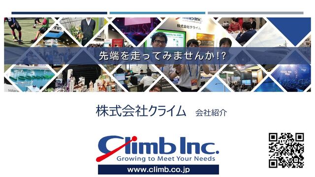 社名の由来 クライムのロゴにかかる赤い線は、社員の「情熱・熱い心」を表現しています。 社会のニーズに応えるべく成長を続ける、を基本に 「情熱・熱い心」をもって、力強く登るという決意を表しています。 Growing to Meet Your Needs 何事にも情熱をもって、失敗を恐れずにチャレンジできる人材を求めています!!