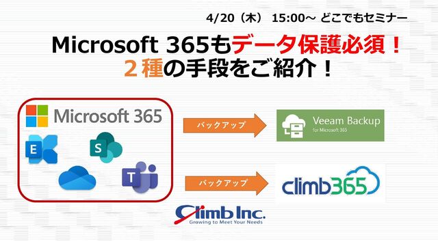 本セミナーでは、Microsoft 365のデータ保護手法として「Veeam Backup for Microsoft 365」と「Climb Cloud Backup for Microsoft 365」の2つのソフトウェアを使用したソリューションを、デモを交えながらご紹介いたします。