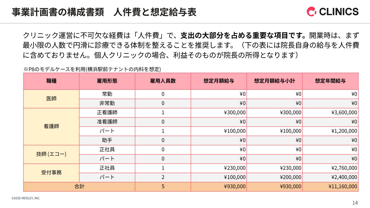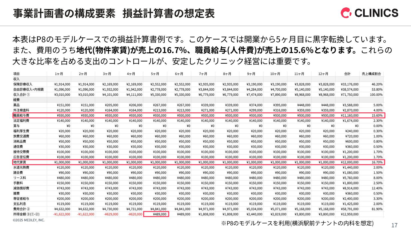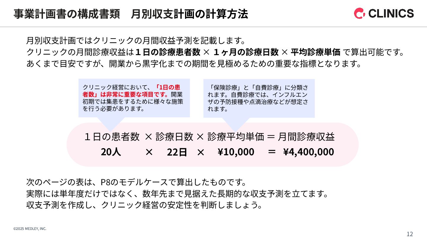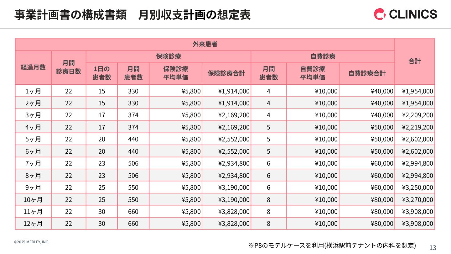 保険診療 ⾃費診療 1⽇の 患者数 ⽉間 患者数 保険診療 平均単価 保険診療合計 ⽉間 患者数 ⾃費診療 平均単価 ⾃費診療合計 1ヶ⽉ 22 15 330 ¥5,800 ¥1,914,000 4 ¥10,000 ¥40,000 ¥1,954,000 2ヶ⽉ 22 15 330 ¥5,800 ¥1,914,000 4 ¥10,000 ¥40,000 ¥1,954,000 3ヶ⽉ 22 17 374 ¥5,800 ¥2,169,200 4 ¥10,000 ¥40,000 ¥2,209,200 4ヶ⽉ 22 17 374 ¥5,800 ¥2,169,200 5 ¥10,000 ¥50,000 ¥2,219,200 5ヶ⽉ 22 20 440 ¥5,800 ¥2,552,000 5 ¥10,000 ¥50,000 ¥2,602,000 6ヶ⽉ 22 20 440 ¥5,800 ¥2,552,000 5 ¥10,000 ¥50,000 ¥2,602,000 7ヶ⽉ 22 23 506 ¥5,800 ¥2,934,800 6 ¥10,000 ¥60,000 ¥2,994,800 8ヶ⽉ 22 23 506 ¥5,800 ¥2,934,800 6 ¥10,000 ¥60,000 ¥2,994,800 9ヶ⽉ 22 25 550 ¥5,800 ¥3,190,000 6 ¥10,000 ¥60,000 ¥3,250,000 10ヶ⽉ 22 25 550 ¥5,800 ¥3,190,000 8 ¥10,000 ¥80,000 ¥3,270,000 11ヶ⽉ 22 30 660 ¥5,800 ¥3,828,000 8 ¥10,000 ¥80,000 ¥3,908,000 12ヶ⽉ 22 30 660 ¥5,800 ¥3,828,000 8 ¥10,000 ¥80,000 ¥3,908,000 ※P8のモデルケースを利⽤(横浜駅前テナントの内科を想定)