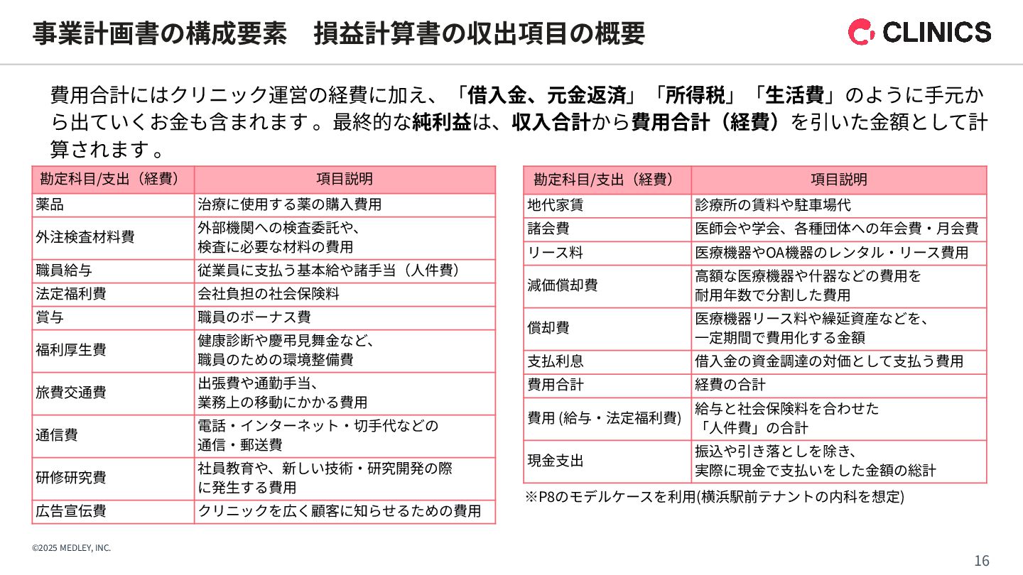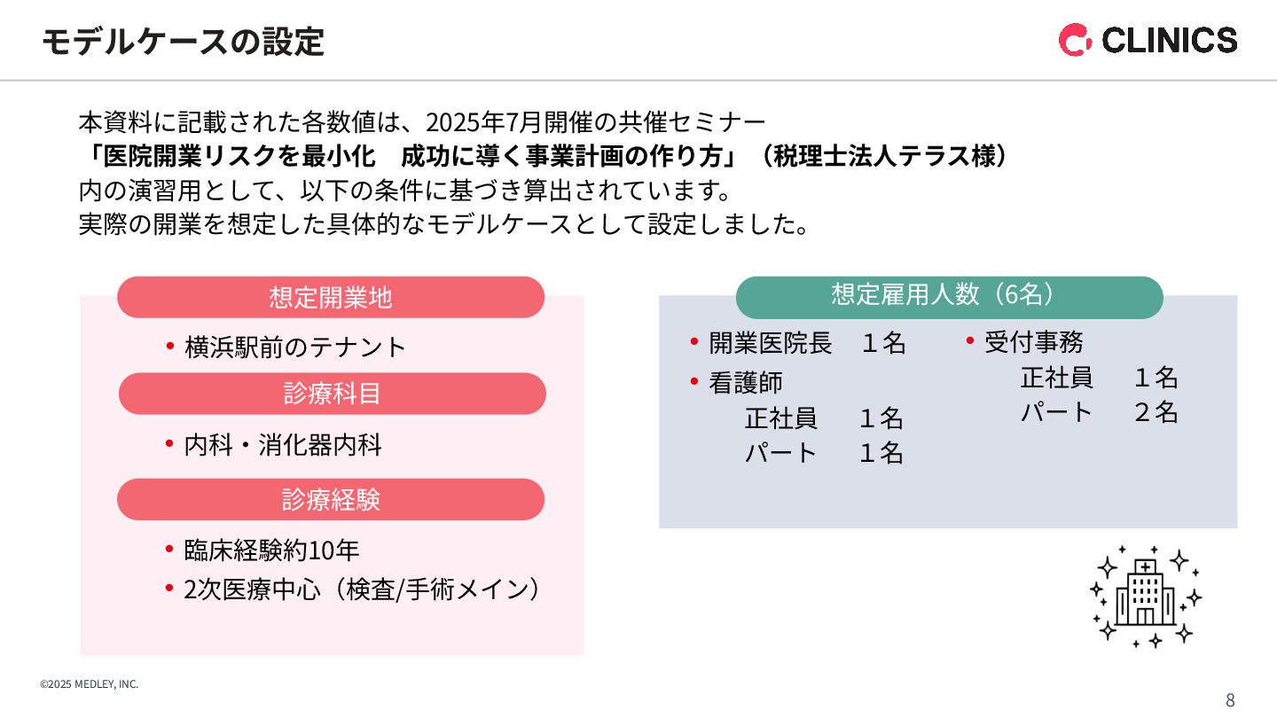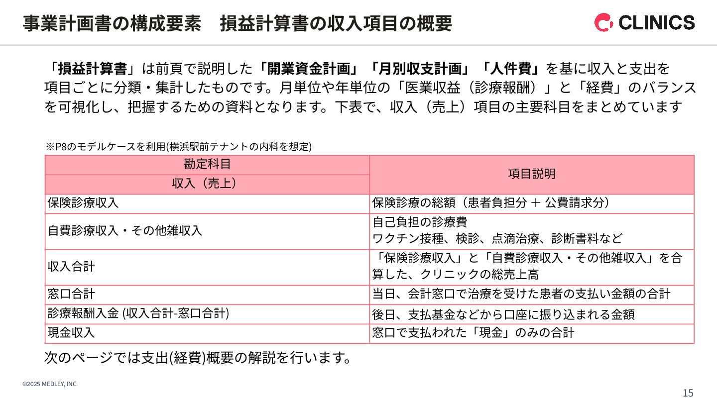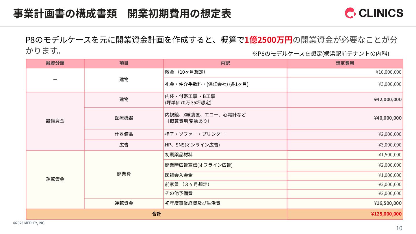 保険診療 ⾃費診療 1⽇の 患者数 ⽉間 患者数 保険診療 平均単価 保険診療合計 ⽉間 患者数 ⾃費診療 平均単価 ⾃費診療合計 1ヶ⽉ 22 15 330 ¥5,800 ¥1,914,000 4 ¥10,000 ¥40,000 ¥1,954,000 2ヶ⽉ 22 15 330 ¥5,800 ¥1,914,000 4 ¥10,000 ¥40,000 ¥1,954,000 3ヶ⽉ 22 17 374 ¥5,800 ¥2,169,200 4 ¥10,000 ¥40,000 ¥2,209,200 4ヶ⽉ 22 17 374 ¥5,800 ¥2,169,200 5 ¥10,000 ¥50,000 ¥2,219,200 5ヶ⽉ 22 20 440 ¥5,800 ¥2,552,000 5 ¥10,000 ¥50,000 ¥2,602,000 6ヶ⽉ 22 20 440 ¥5,800 ¥2,552,000 5 ¥10,000 ¥50,000 ¥2,602,000 7ヶ⽉ 22 23 506 ¥5,800 ¥2,934,800 6 ¥10,000 ¥60,000 ¥2,994,800 8ヶ⽉ 22 23 506 ¥5,800 ¥2,934,800 6 ¥10,000 ¥60,000 ¥2,994,800 9ヶ⽉ 22 25 550 ¥5,800 ¥3,190,000 6 ¥10,000 ¥60,000 ¥3,250,000 10ヶ⽉ 22 25 550 ¥5,800 ¥3,190,000 8 ¥10,000 ¥80,000 ¥3,270,000 11ヶ⽉ 22 30 660 ¥5,800 ¥3,828,000 8 ¥10,000 ¥80,000 ¥3,908,000 12ヶ⽉ 22 30 660 ¥5,800 ¥3,828,000 8 ¥10,000 ¥80,000 ¥3,908,000 ※P8のモデルケースを利⽤(横浜駅前テナントの内科を想定)