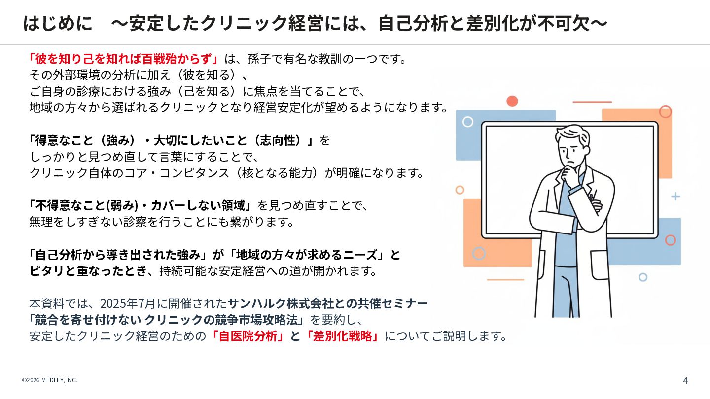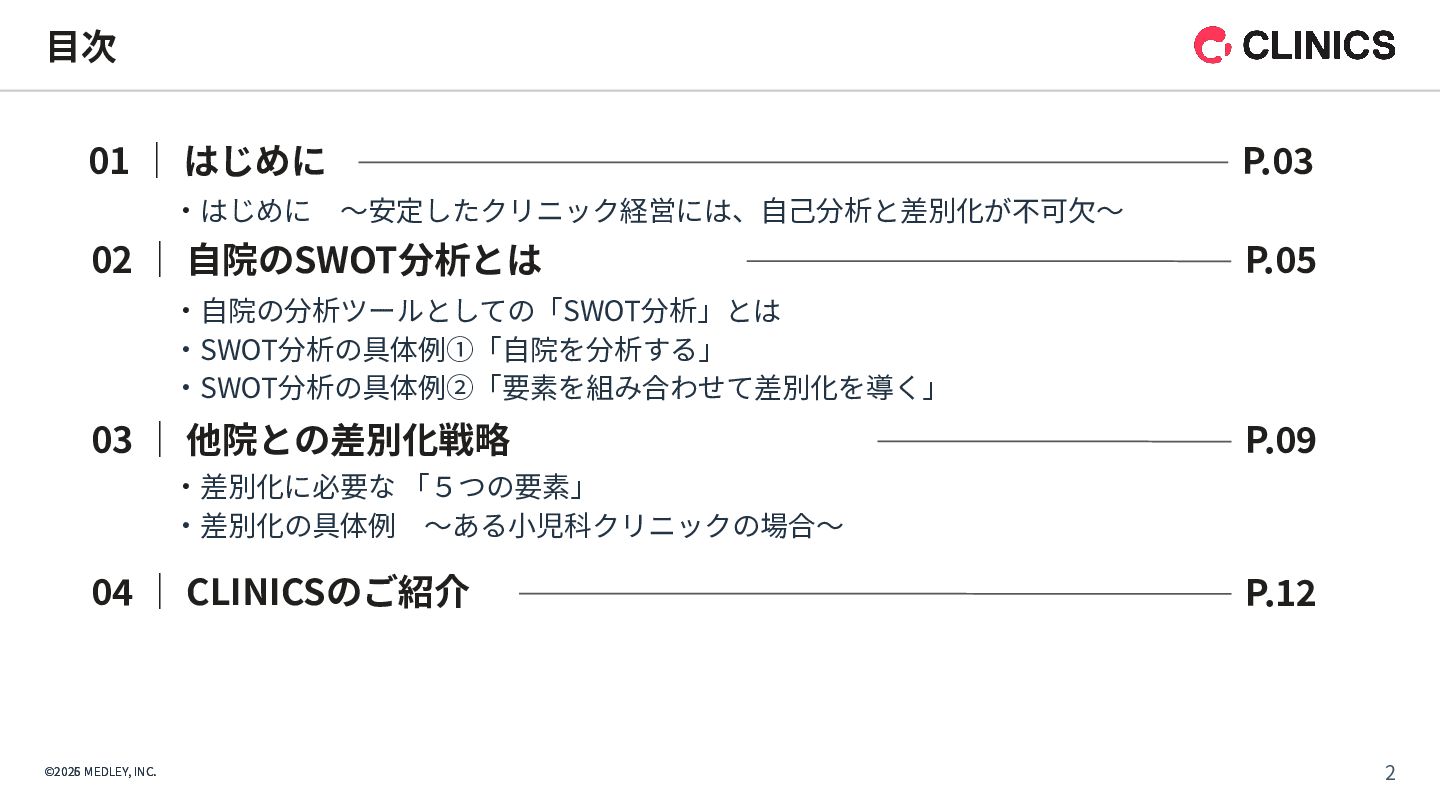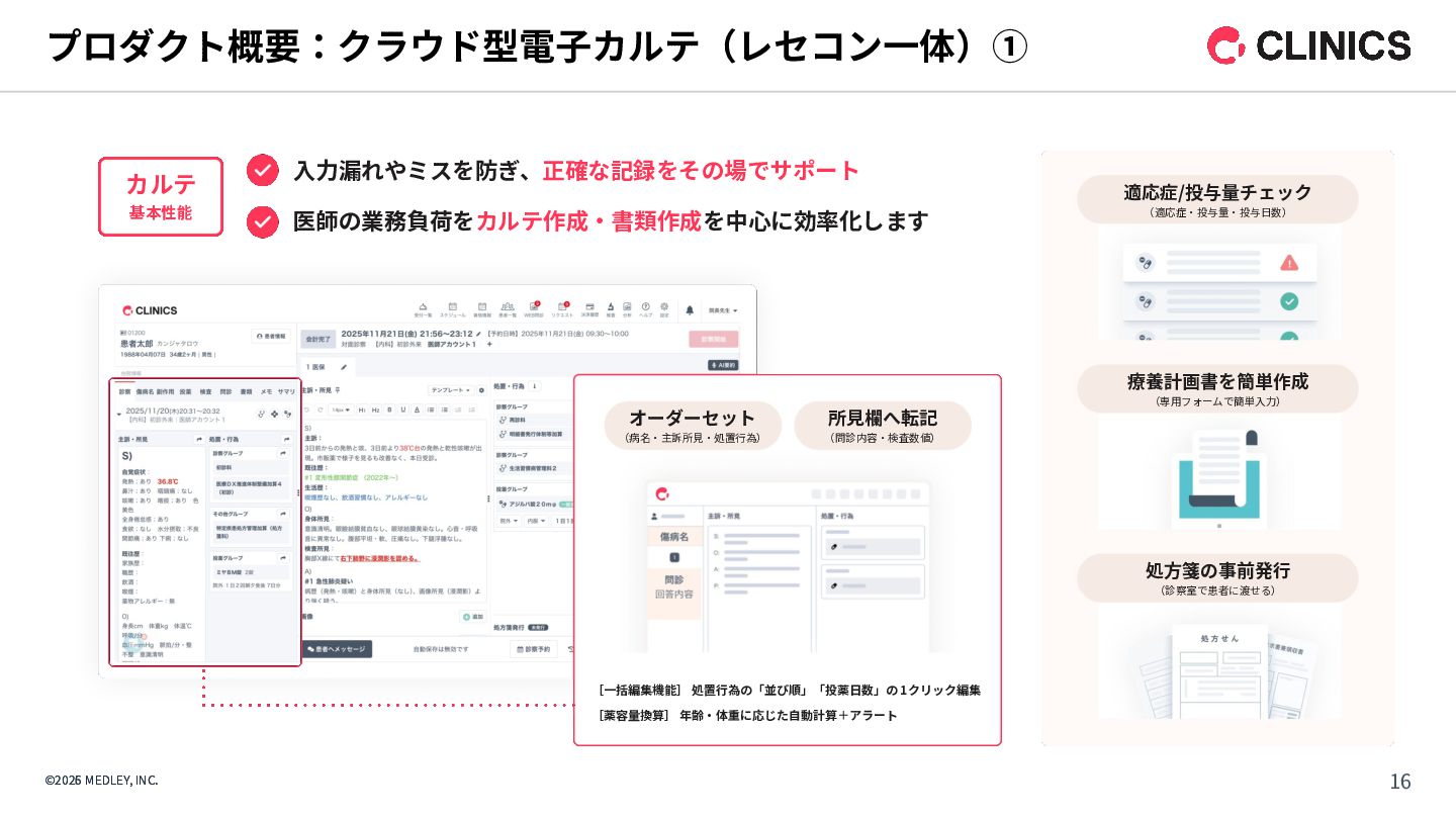 CLINICS 予約 問診 経営分 析 受付 チェック イン レセ チェック 集患 受診導 線 診察 対⾯ オンライン診療 会計 医療DX対応 資格確認/電子処方箋等の連携基盤/ DX加算の算定/制度更新への即応 AI要約アシスト AI⽂書アシスト ITトレンド 2024上半期 電子カルテ部門 No.1 ※1 オンライン診療 導入実績 No.1 ※2 CLINICS 利用医療機関数 約 件 3,500 ※3 ※1出典元: トレンド上半期ランキング2024」(株式会社innovation & Co.、2024年6⽉) ※2出典元:富⼠キメラ総研「ウェアラブル∕ヘルスケアビジネス総調査2024」(2023年実績) ※3 2025年12⽉末時点。オンライン診療と電⼦カルテの合計数 ©2026 MEDLEY, INC.