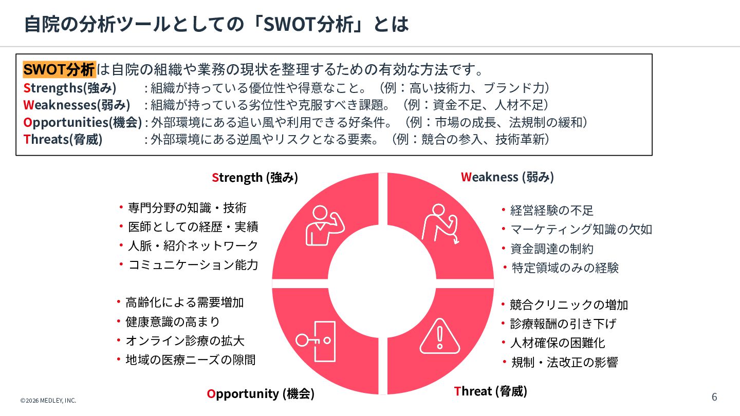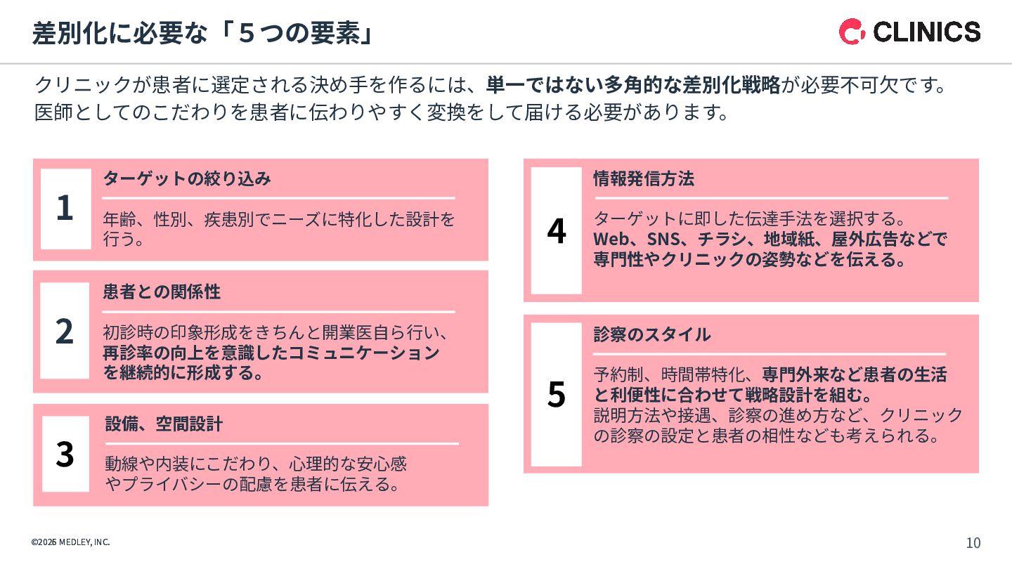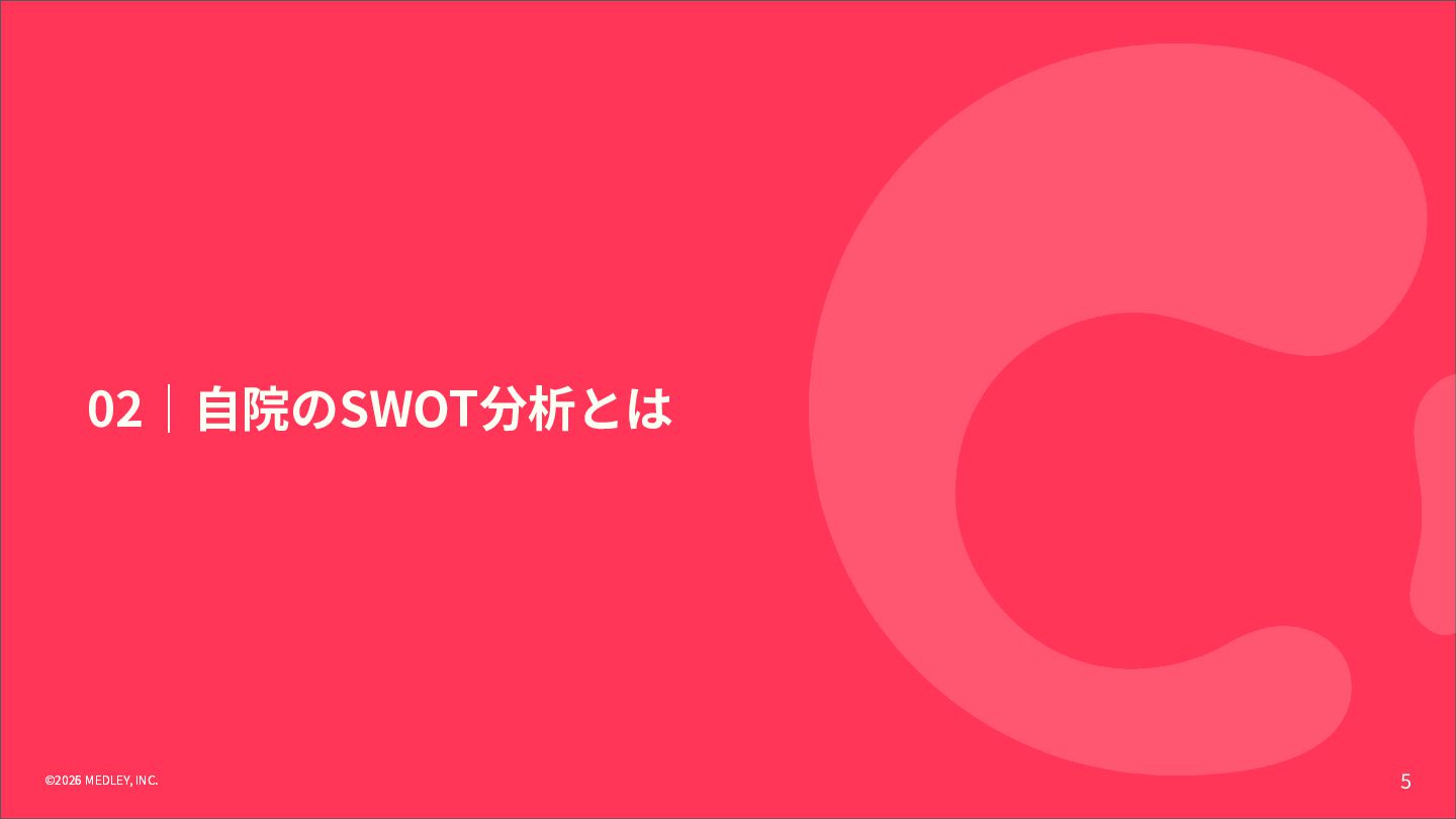 CLINICS 予約 問診 経営分 析 受付 チェック イン レセ チェック 集患 受診導 線 診察 対⾯ オンライン診療 会計 医療DX対応 資格確認/電子処方箋等の連携基盤/ DX加算の算定/制度更新への即応 AI要約アシスト AI⽂書アシスト ITトレンド 2024上半期 電子カルテ部門 No.1 ※1 オンライン診療 導入実績 No.1 ※2 CLINICS 利用医療機関数 約 件 3,500 ※3 ※1出典元: トレンド上半期ランキング2024」(株式会社innovation & Co.、2024年6⽉) ※2出典元:富⼠キメラ総研「ウェアラブル∕ヘルスケアビジネス総調査2024」(2023年実績) ※3 2025年12⽉末時点。オンライン診療と電⼦カルテの合計数 ©2026 MEDLEY, INC.