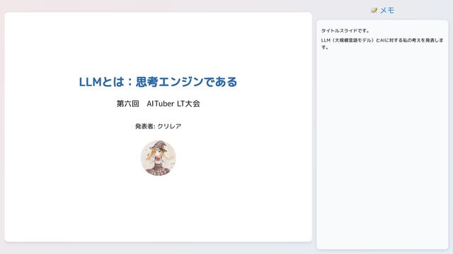 📝 メモ タイトルスライドです。 LLM(大規模言語モデル)とAIに対する私の考えを発表しま す。 LLMとは:思考エンジンである 第六回 AITuber LT大会 発表者: クリレア