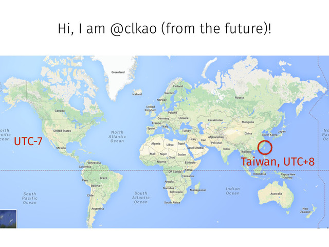 Hi, I am @clkao (from the future)! UTC-7 Taiwan, UTC+8