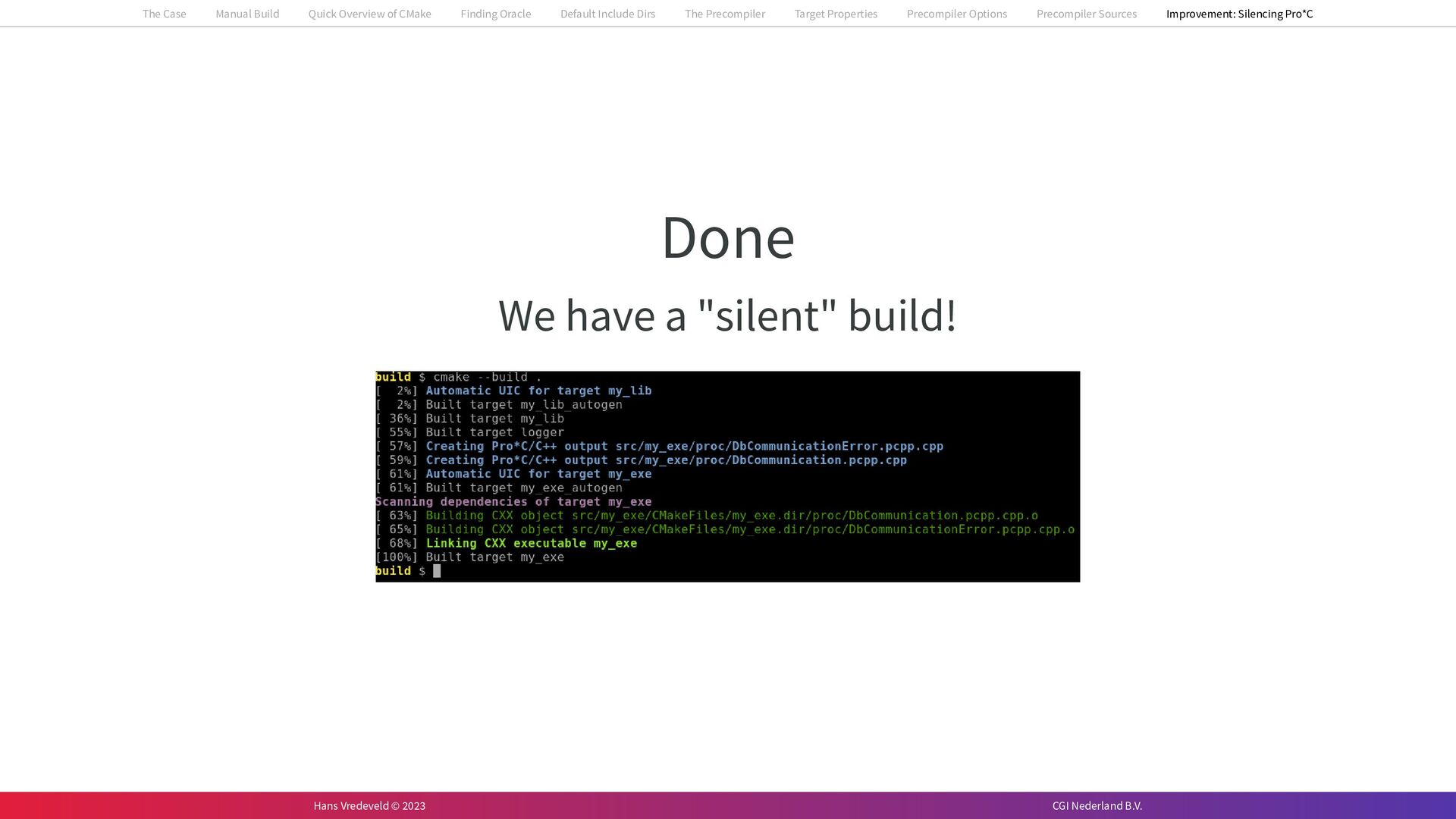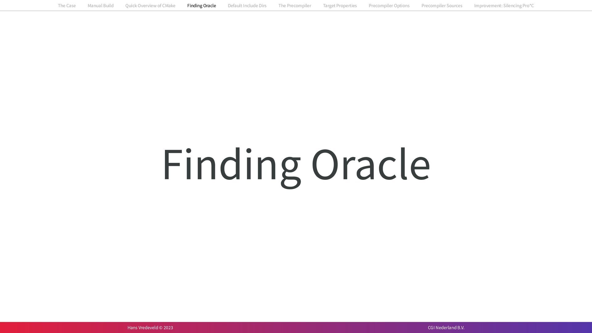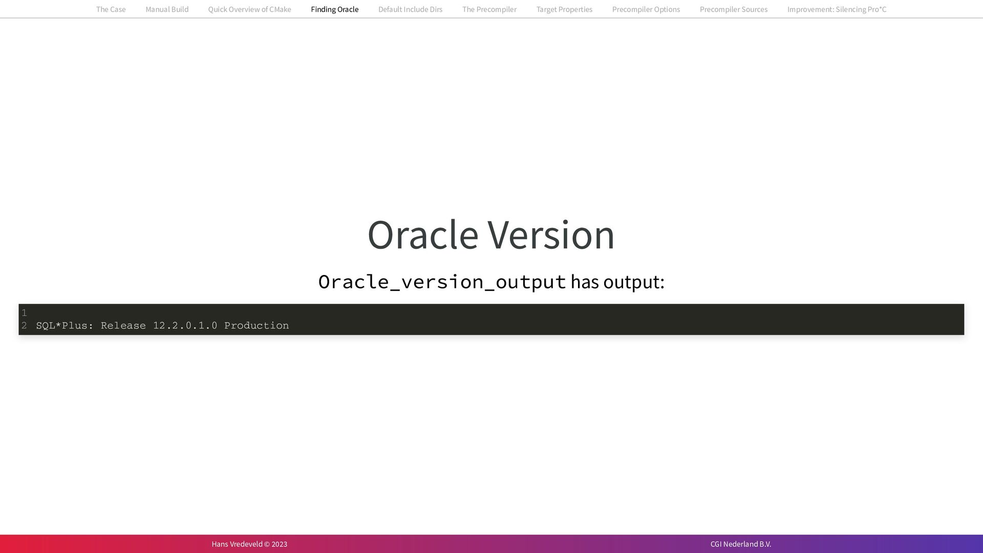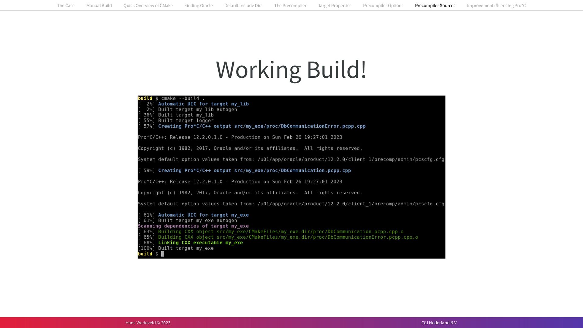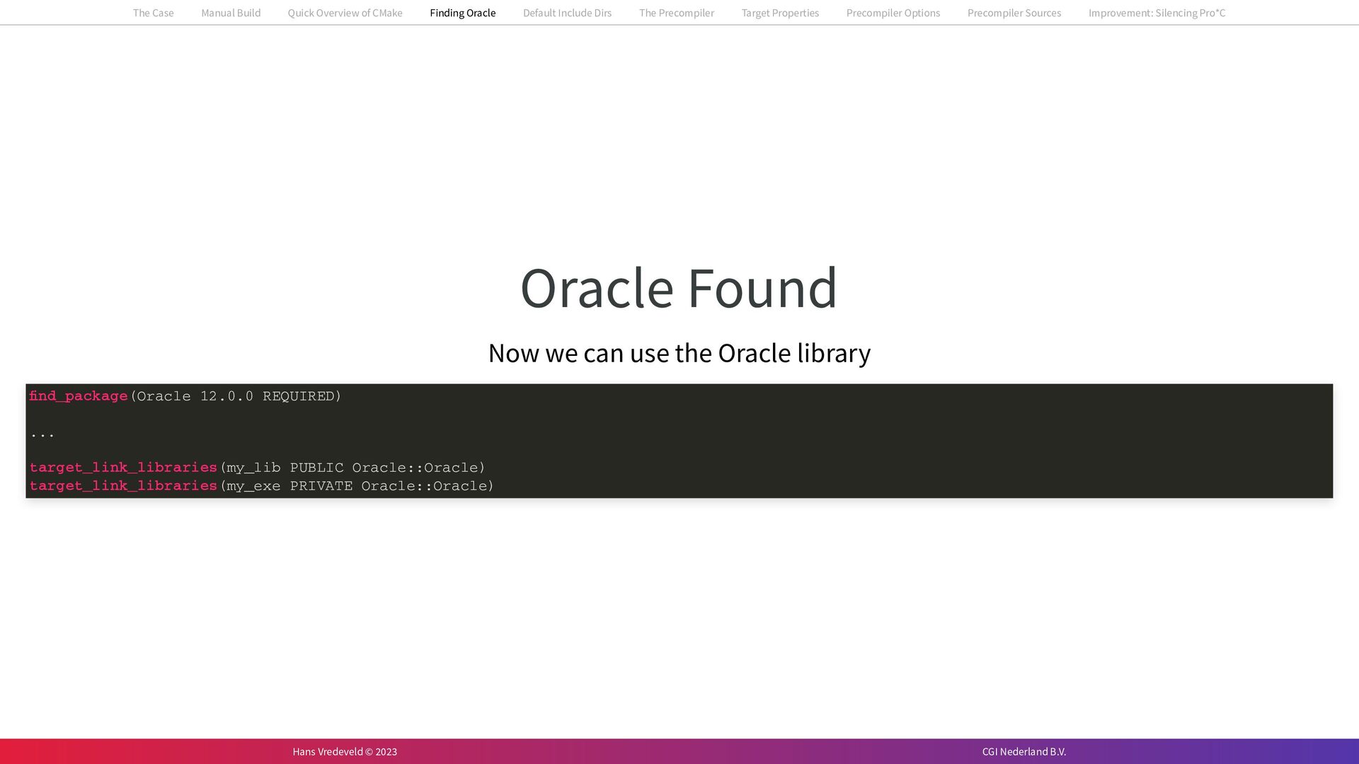 In the case study, we will look at a C++-application that uses embedded SQL to talk to an Oracle SQL-database. To build the application, it needs to link against Oracle’s client library and the files with embedded SQL need to be converted to pure C++ before they can be compiled. How can we find that library when there is no CMake module for it yet? (We write our own!) How can we execute Oracle’s preprocessor to convert files with embedded SQL in a structured way when there are tens, or hundreds, of those files, possibly spread over different CMake targets? Come to my talk and I will tell you.