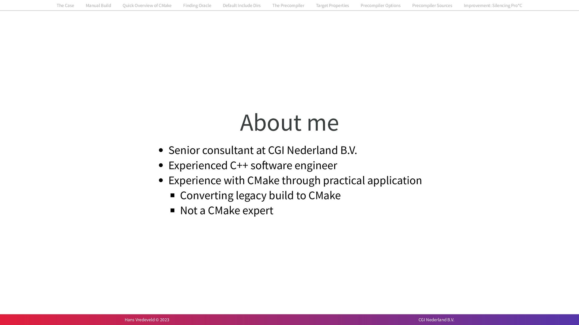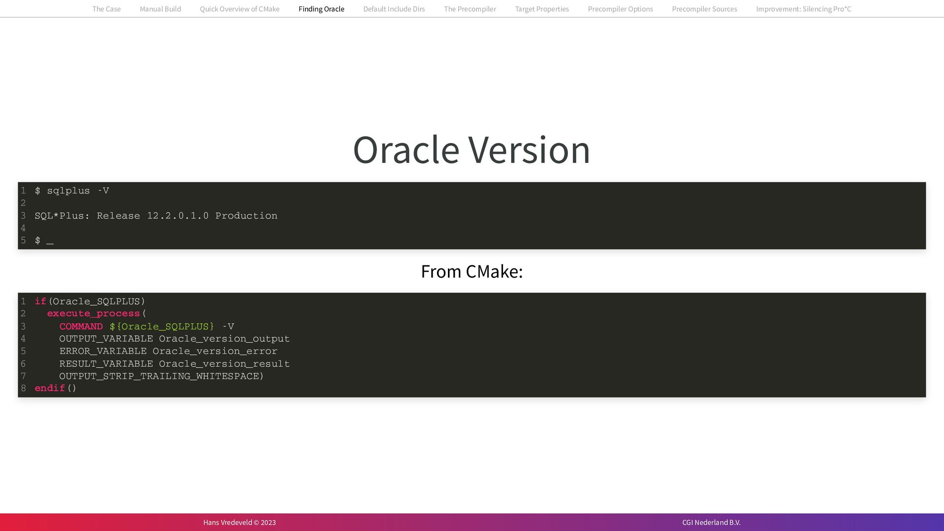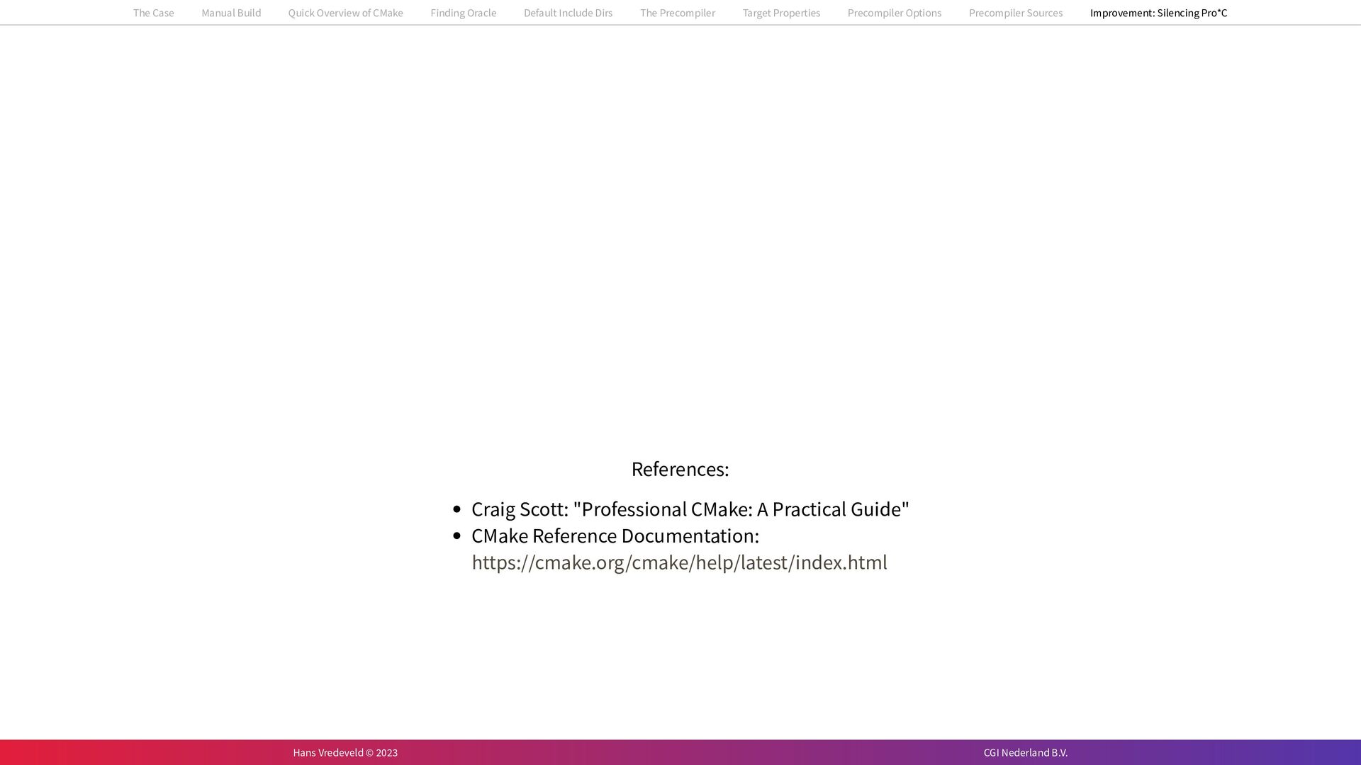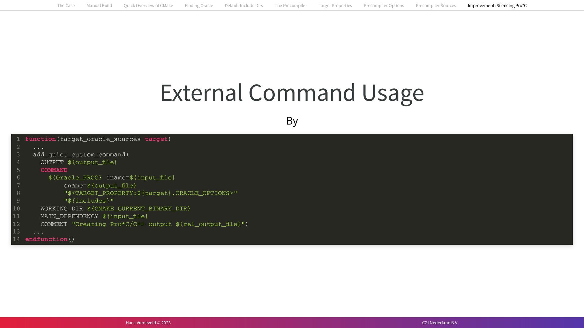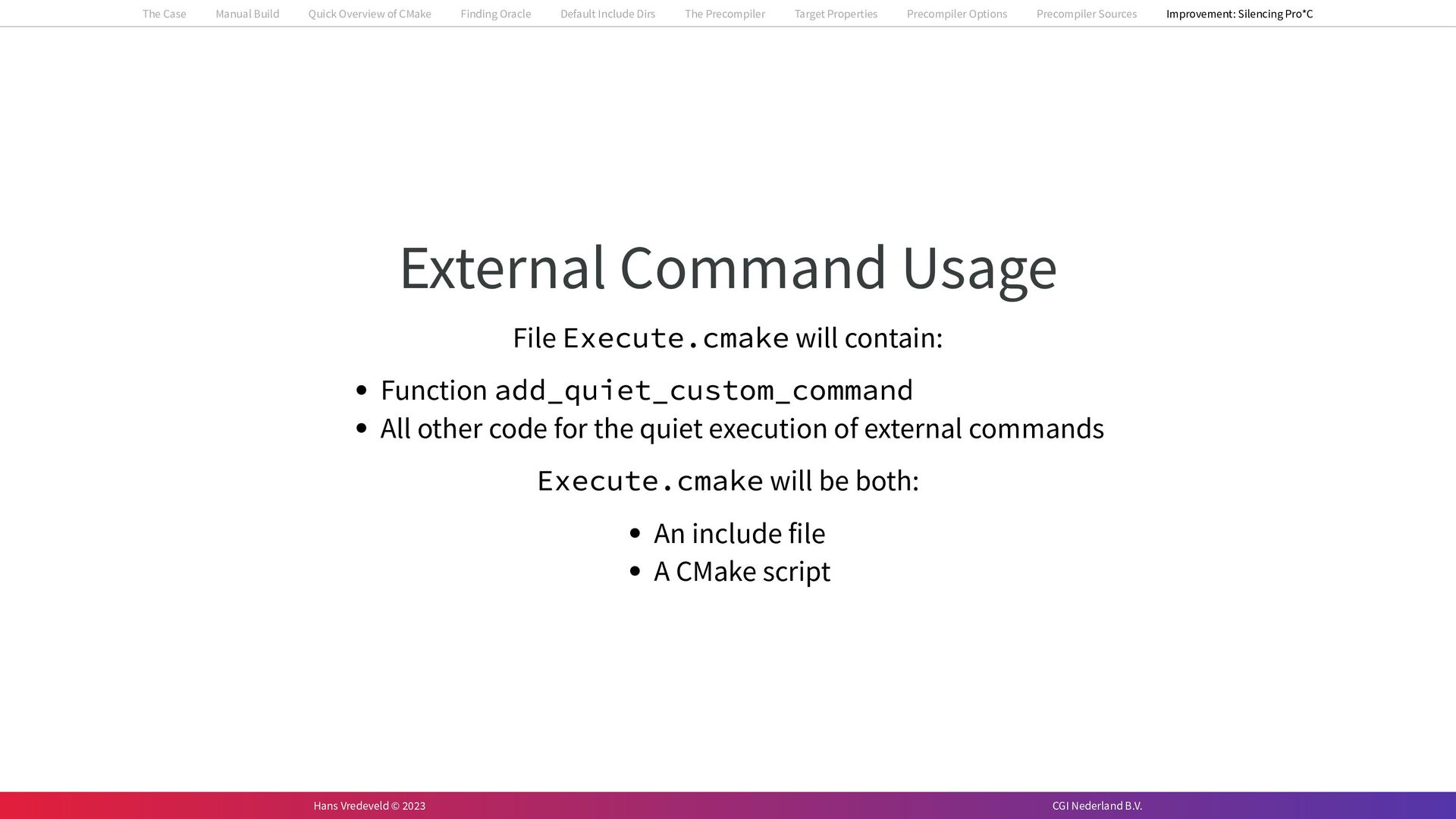 In the case study, we will look at a C++-application that uses embedded SQL to talk to an Oracle SQL-database. To build the application, it needs to link against Oracle’s client library and the files with embedded SQL need to be converted to pure C++ before they can be compiled. How can we find that library when there is no CMake module for it yet? (We write our own!) How can we execute Oracle’s preprocessor to convert files with embedded SQL in a structured way when there are tens, or hundreds, of those files, possibly spread over different CMake targets? Come to my talk and I will tell you.