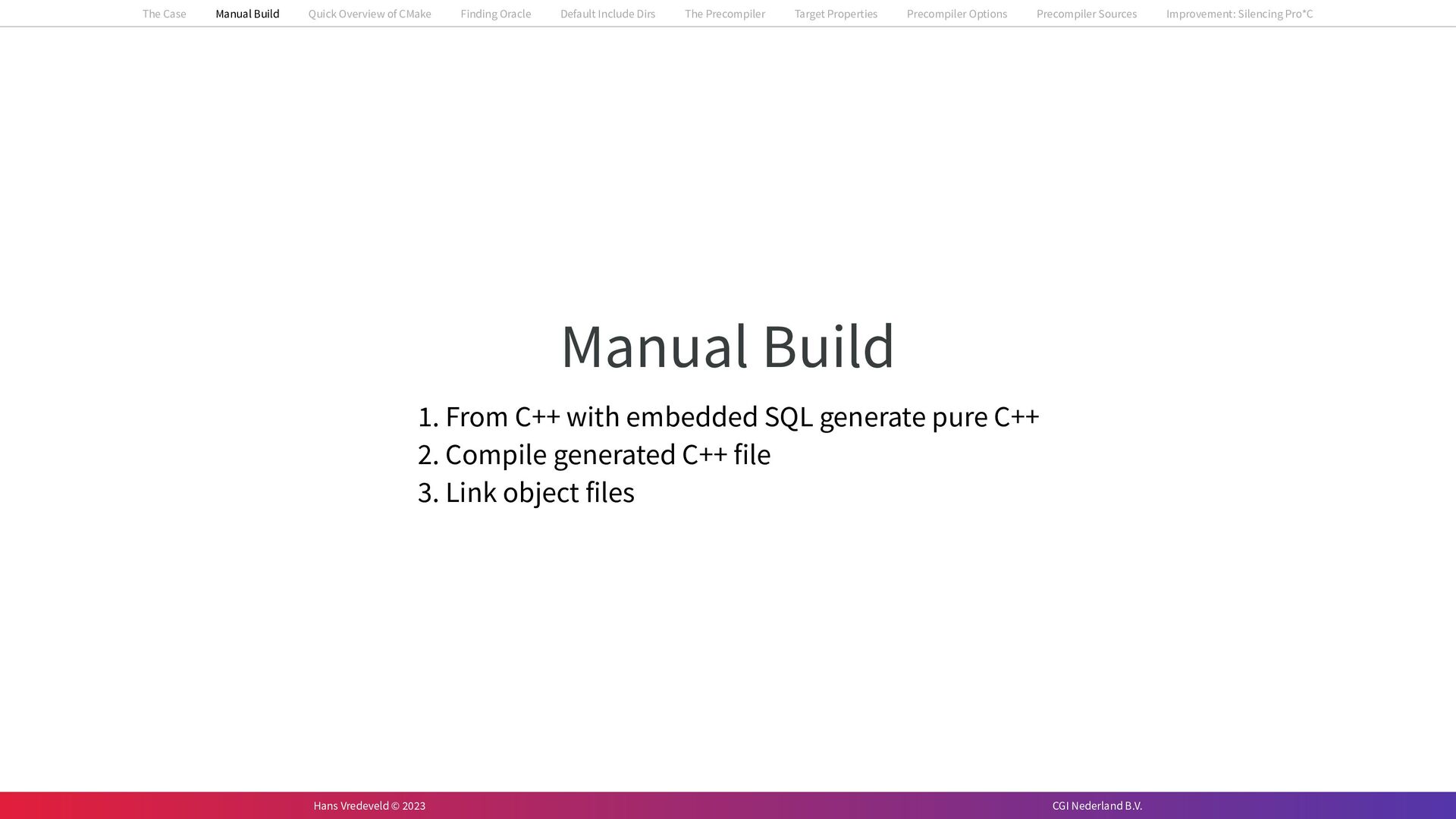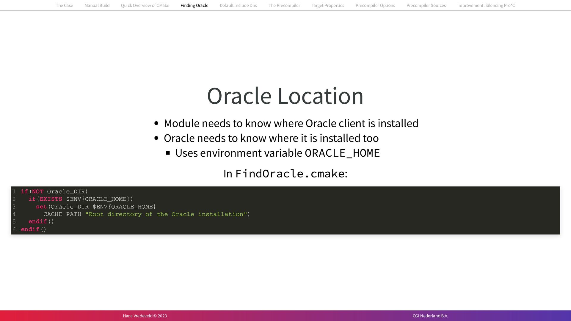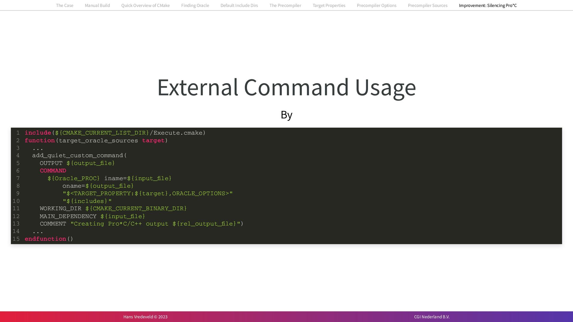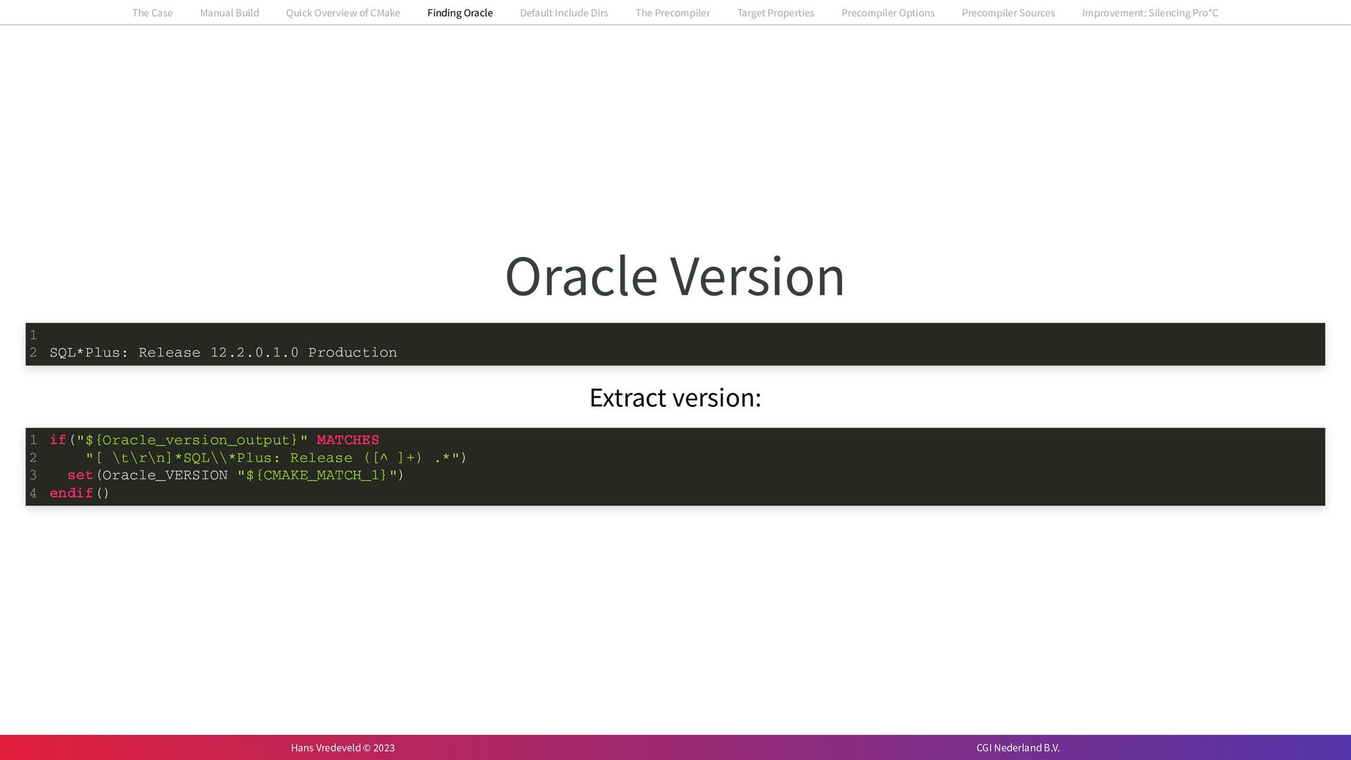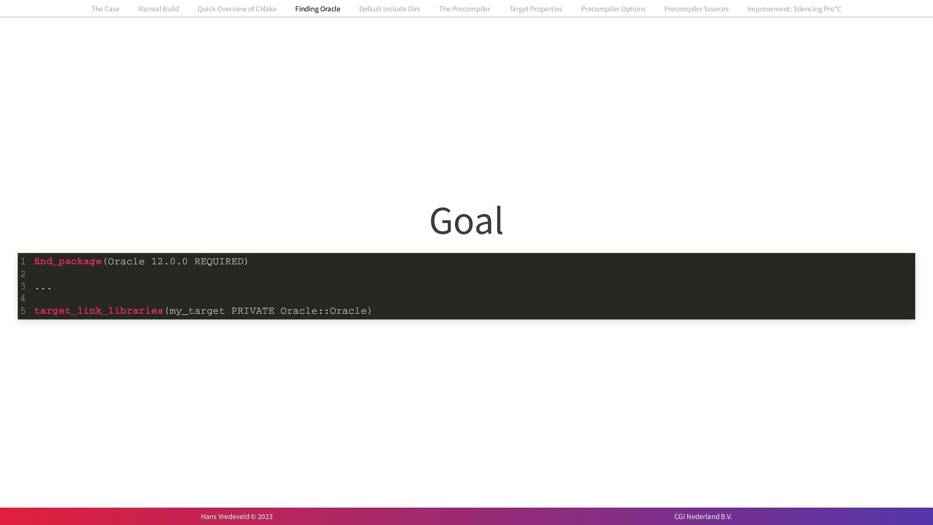 In the case study, we will look at a C++-application that uses embedded SQL to talk to an Oracle SQL-database. To build the application, it needs to link against Oracle’s client library and the files with embedded SQL need to be converted to pure C++ before they can be compiled. How can we find that library when there is no CMake module for it yet? (We write our own!) How can we execute Oracle’s preprocessor to convert files with embedded SQL in a structured way when there are tens, or hundreds, of those files, possibly spread over different CMake targets? Come to my talk and I will tell you.