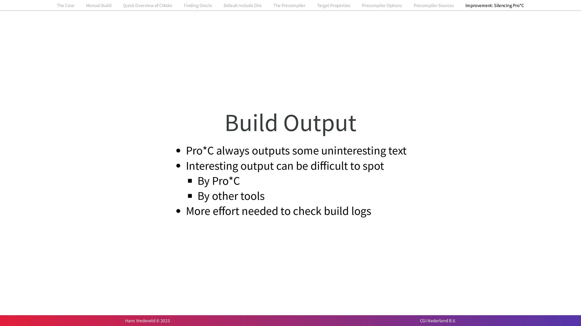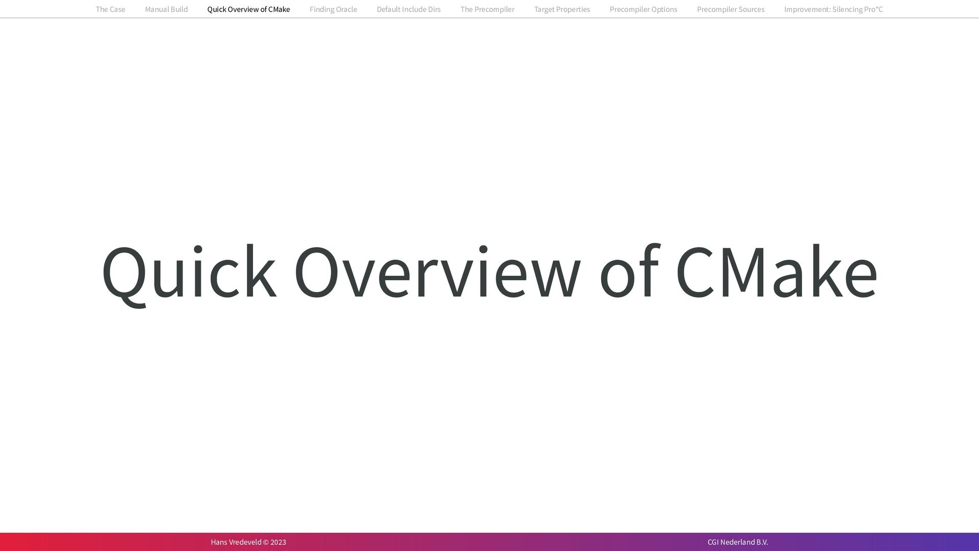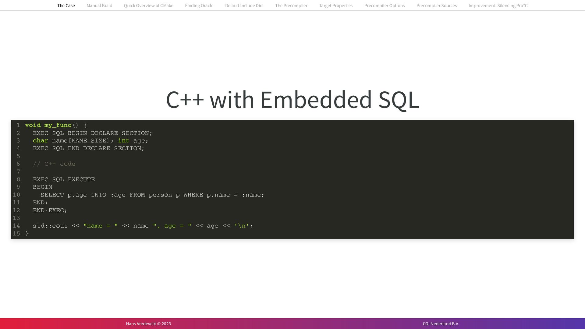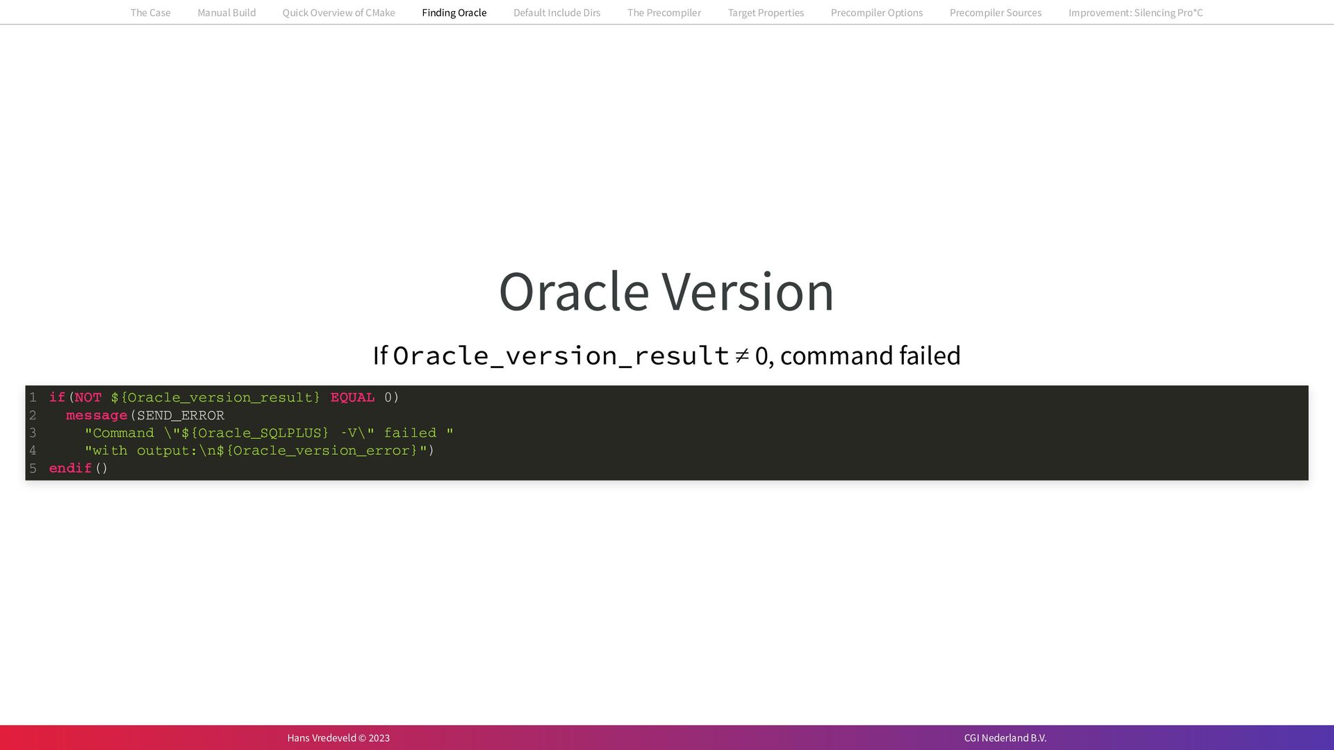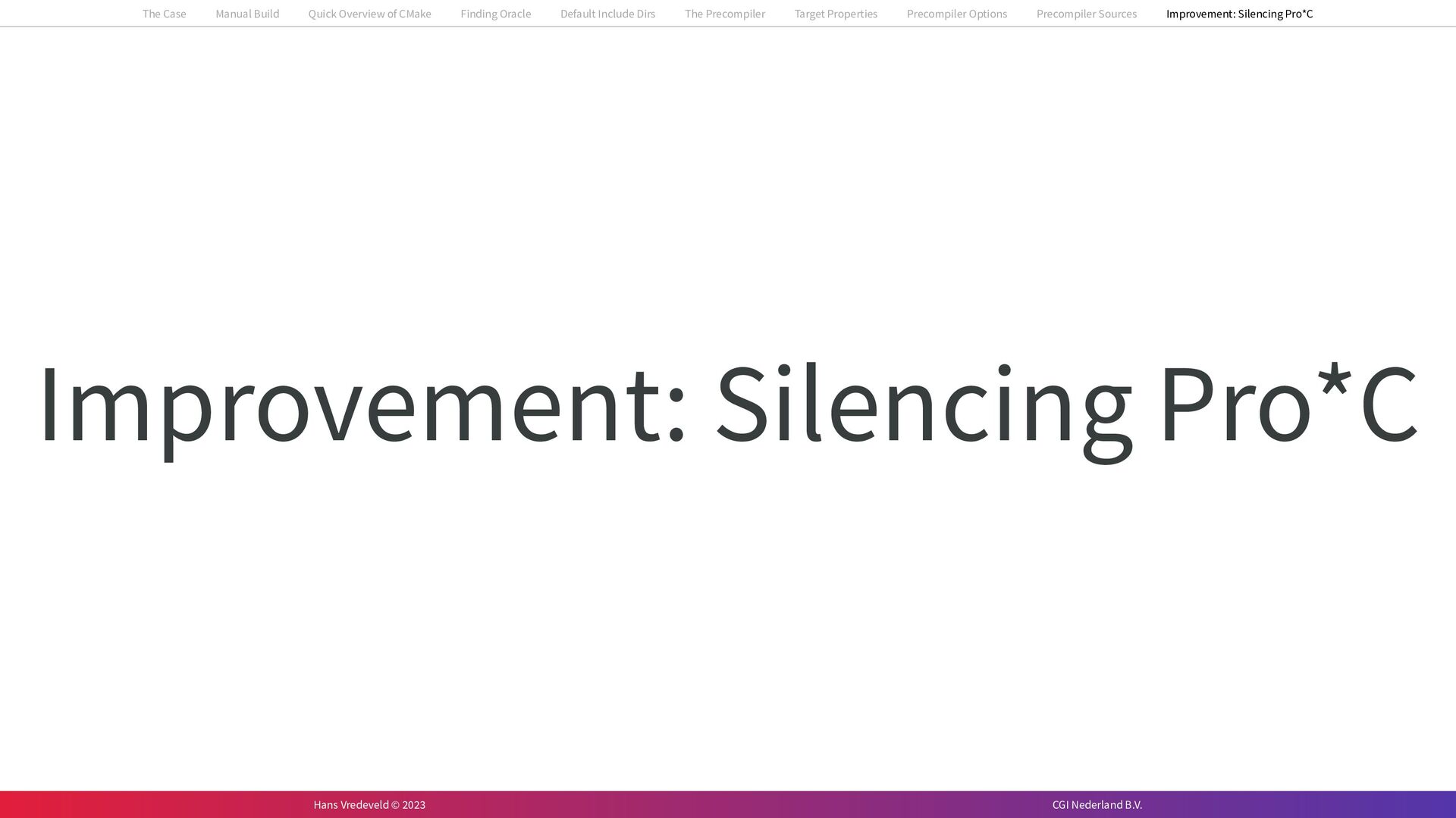 In the case study, we will look at a C++-application that uses embedded SQL to talk to an Oracle SQL-database. To build the application, it needs to link against Oracle’s client library and the files with embedded SQL need to be converted to pure C++ before they can be compiled. How can we find that library when there is no CMake module for it yet? (We write our own!) How can we execute Oracle’s preprocessor to convert files with embedded SQL in a structured way when there are tens, or hundreds, of those files, possibly spread over different CMake targets? Come to my talk and I will tell you.
