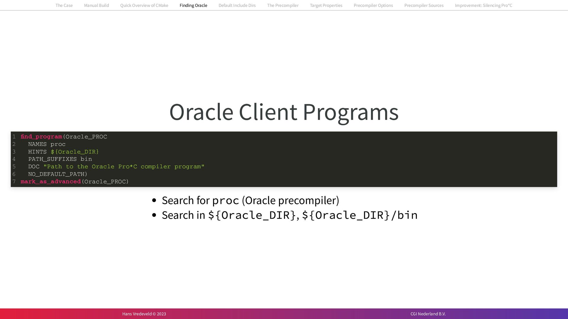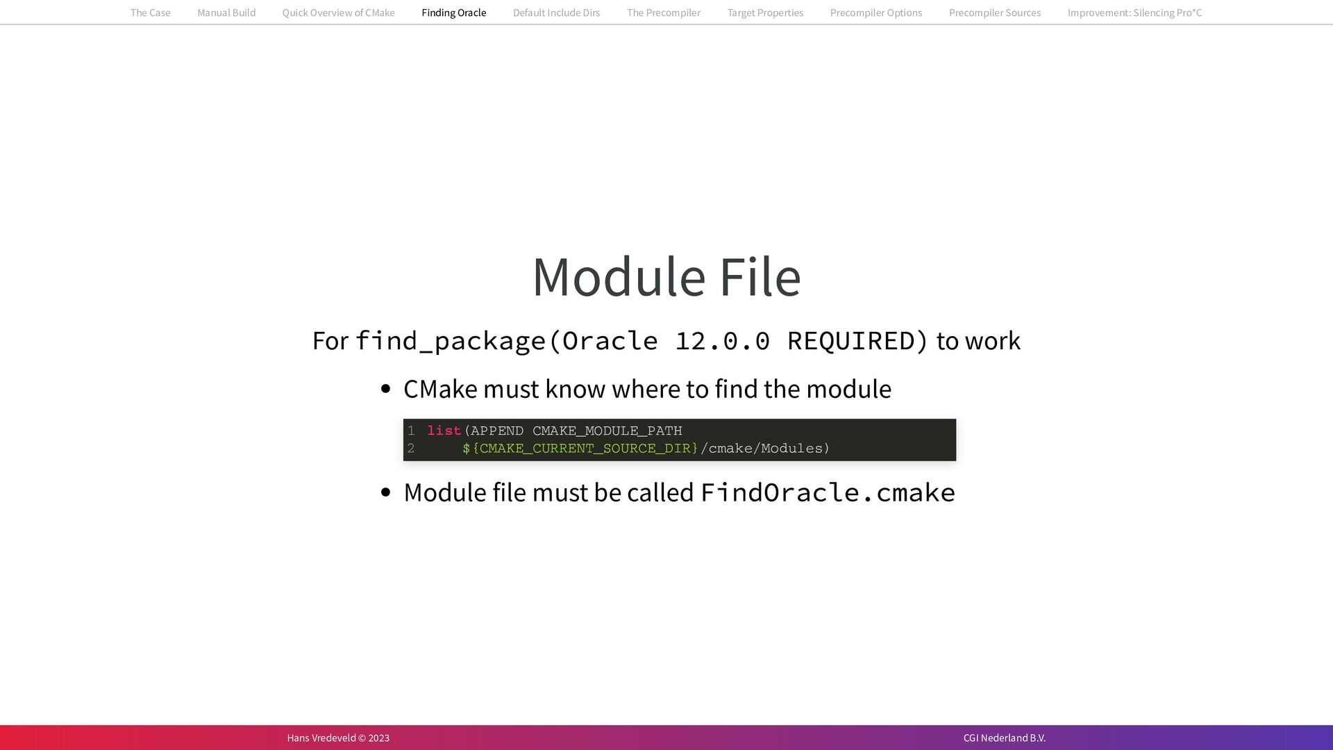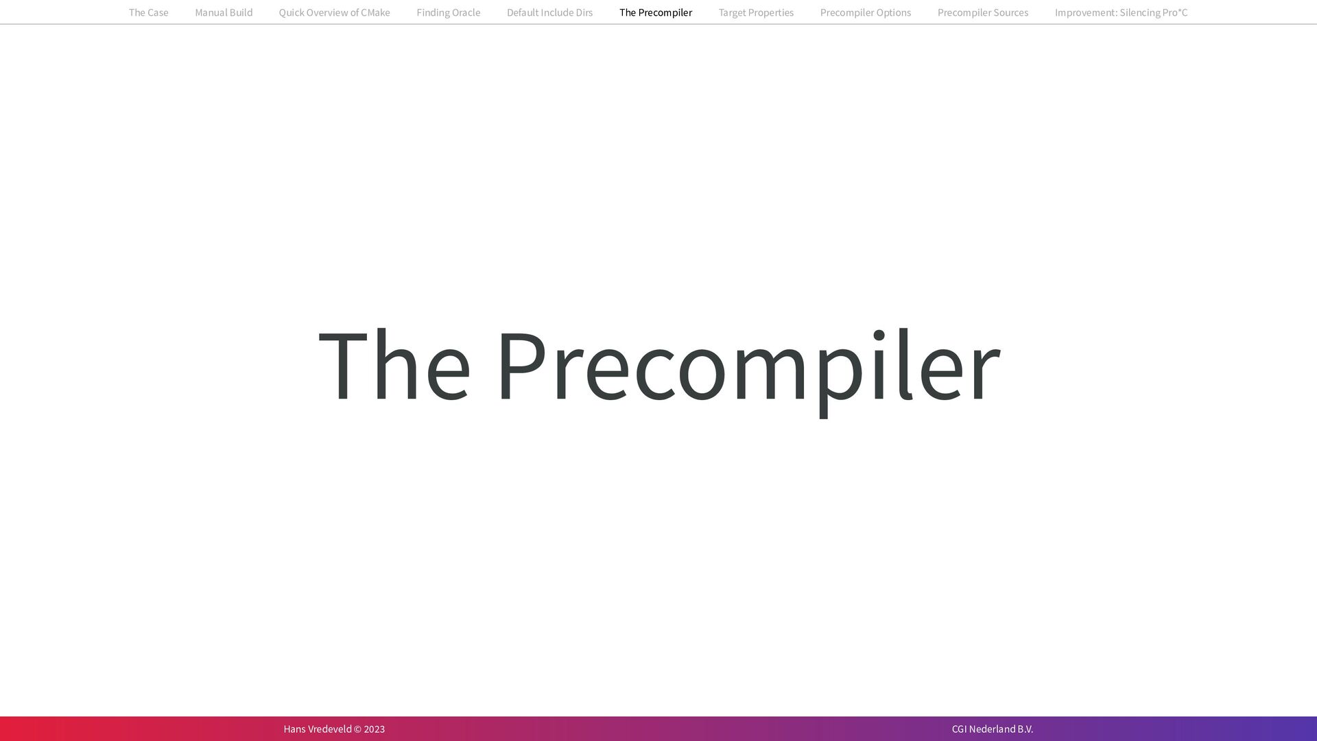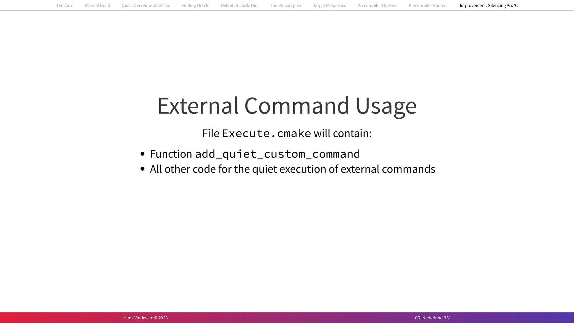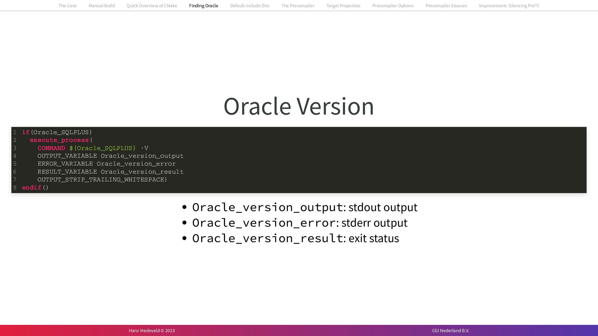 In the case study, we will look at a C++-application that uses embedded SQL to talk to an Oracle SQL-database. To build the application, it needs to link against Oracle’s client library and the files with embedded SQL need to be converted to pure C++ before they can be compiled. How can we find that library when there is no CMake module for it yet? (We write our own!) How can we execute Oracle’s preprocessor to convert files with embedded SQL in a structured way when there are tens, or hundreds, of those files, possibly spread over different CMake targets? Come to my talk and I will tell you.