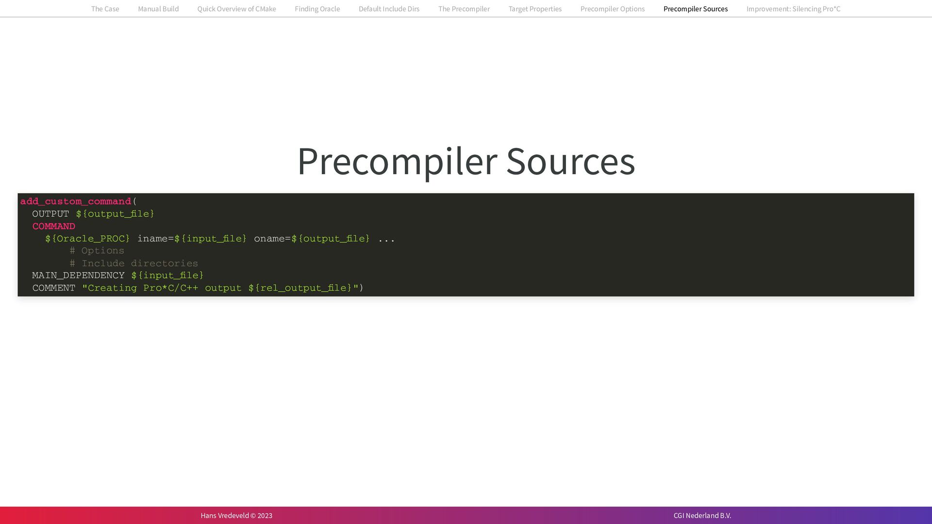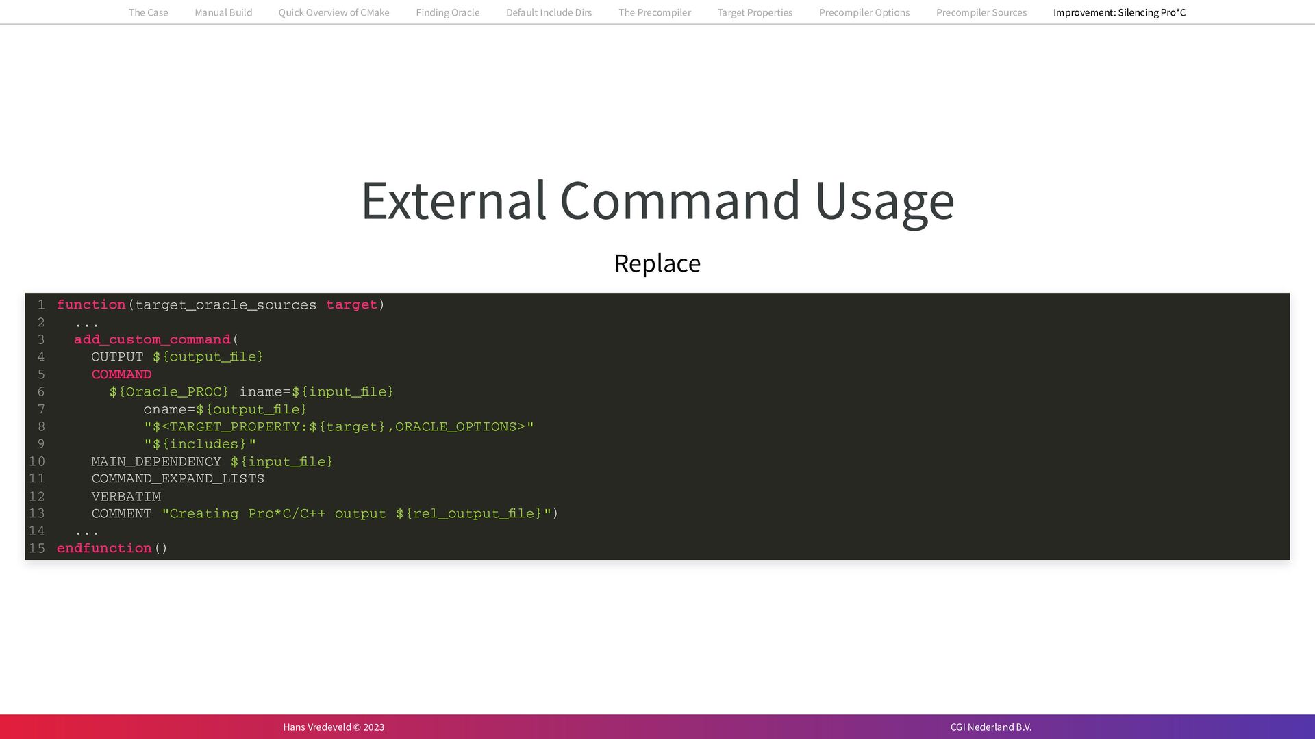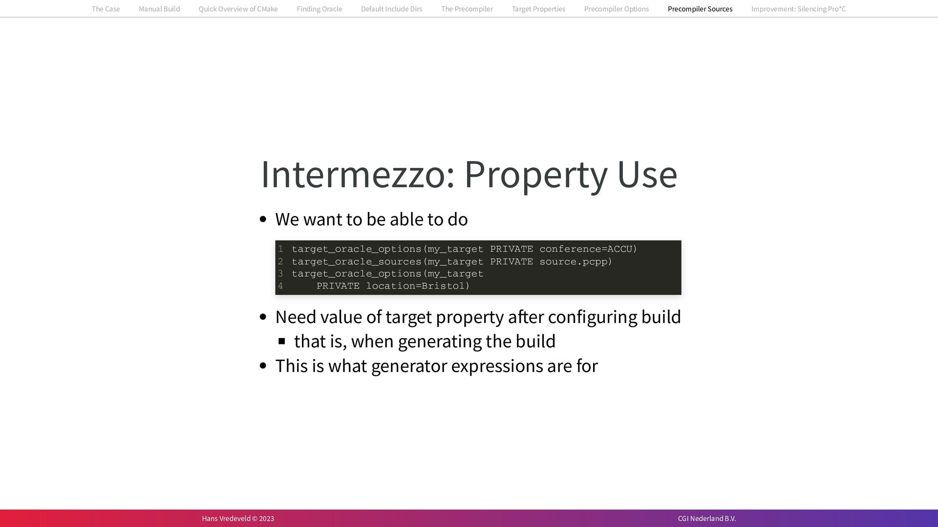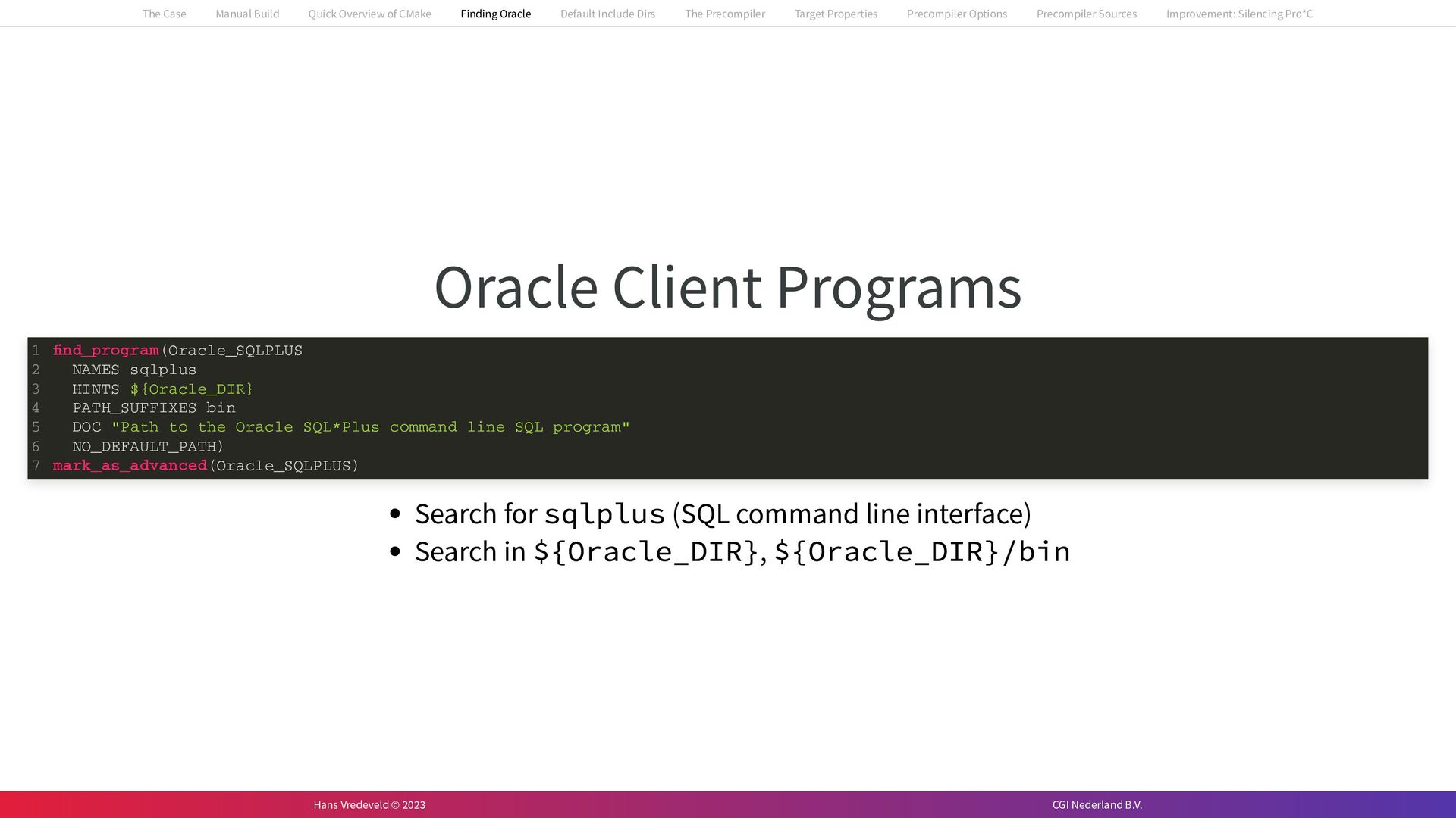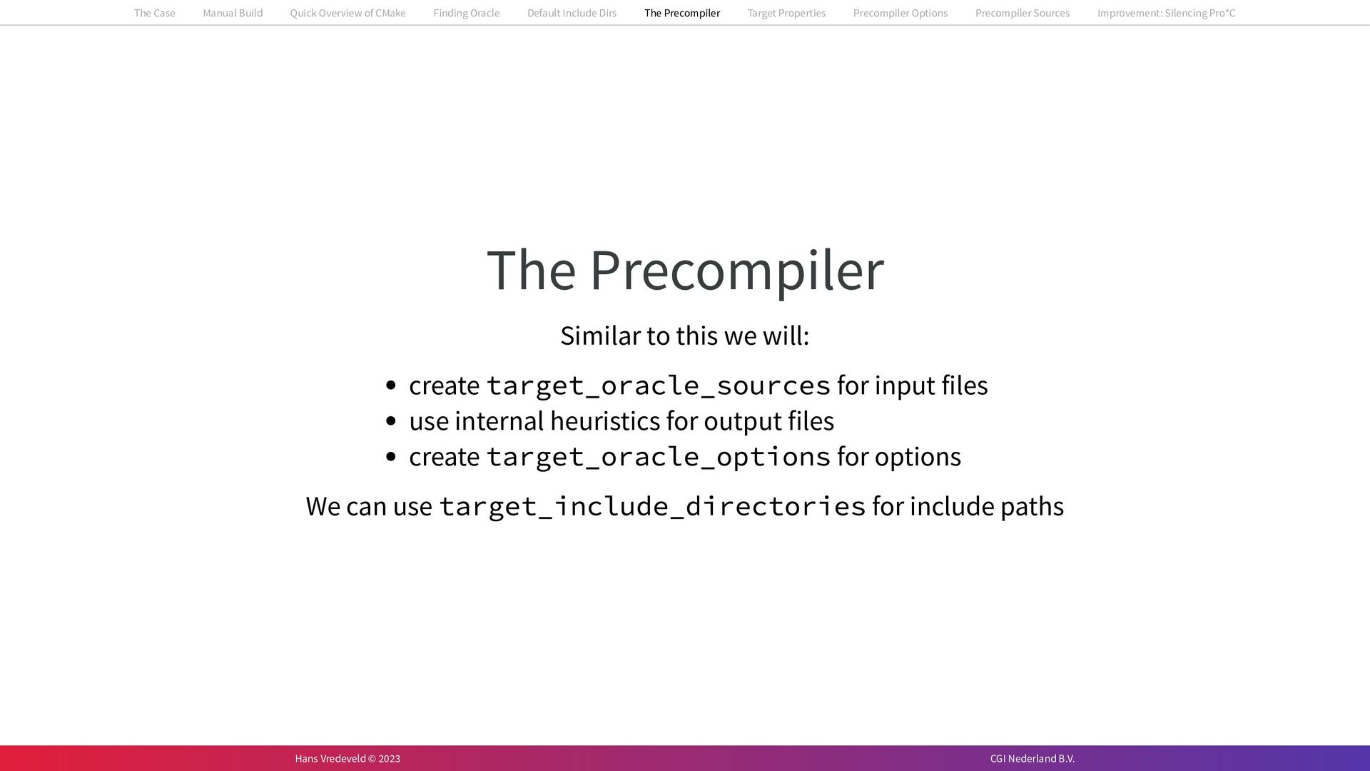 In the case study, we will look at a C++-application that uses embedded SQL to talk to an Oracle SQL-database. To build the application, it needs to link against Oracle’s client library and the files with embedded SQL need to be converted to pure C++ before they can be compiled. How can we find that library when there is no CMake module for it yet? (We write our own!) How can we execute Oracle’s preprocessor to convert files with embedded SQL in a structured way when there are tens, or hundreds, of those files, possibly spread over different CMake targets? Come to my talk and I will tell you.