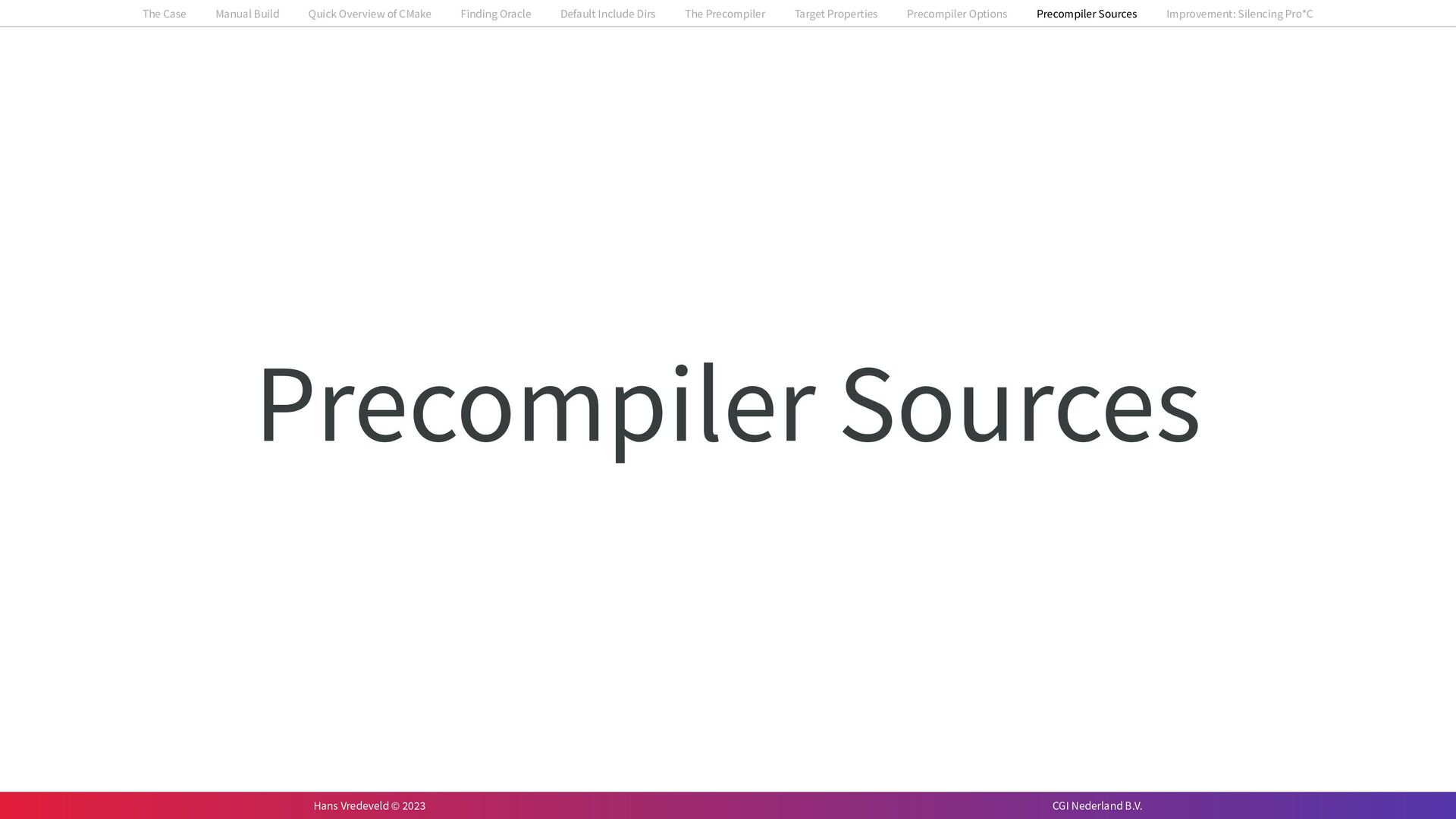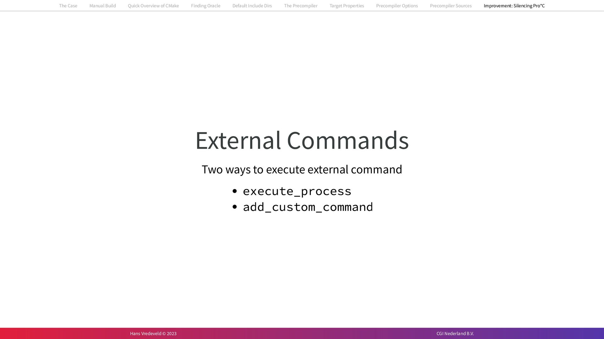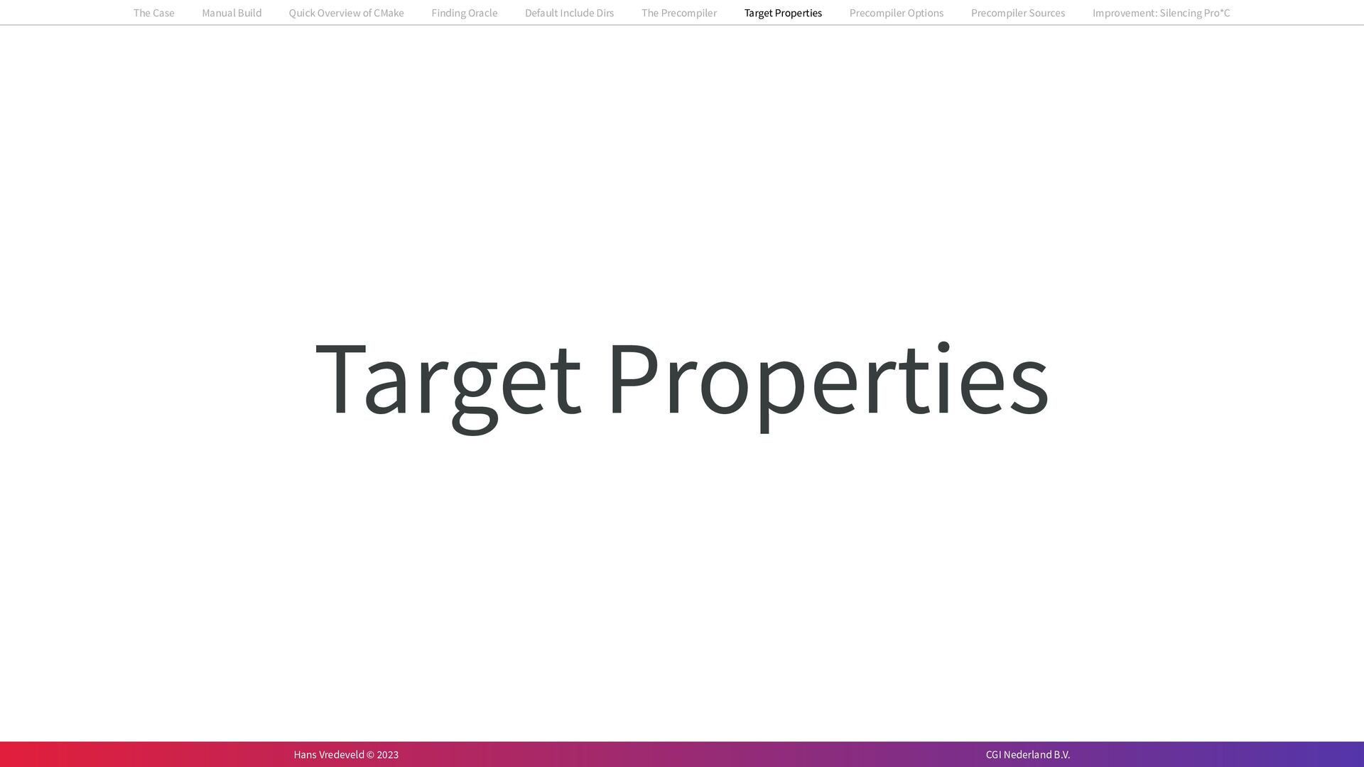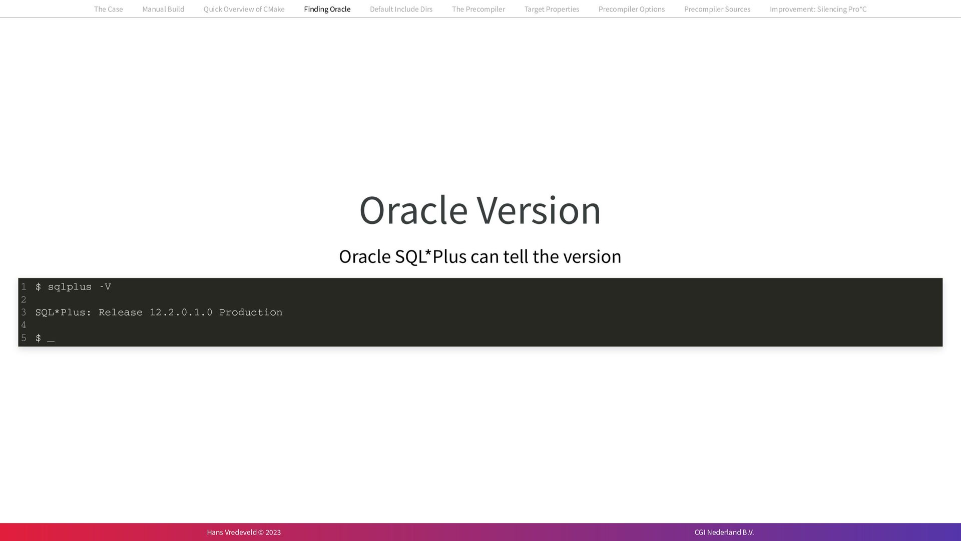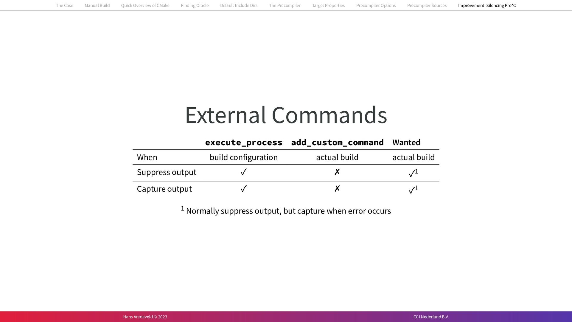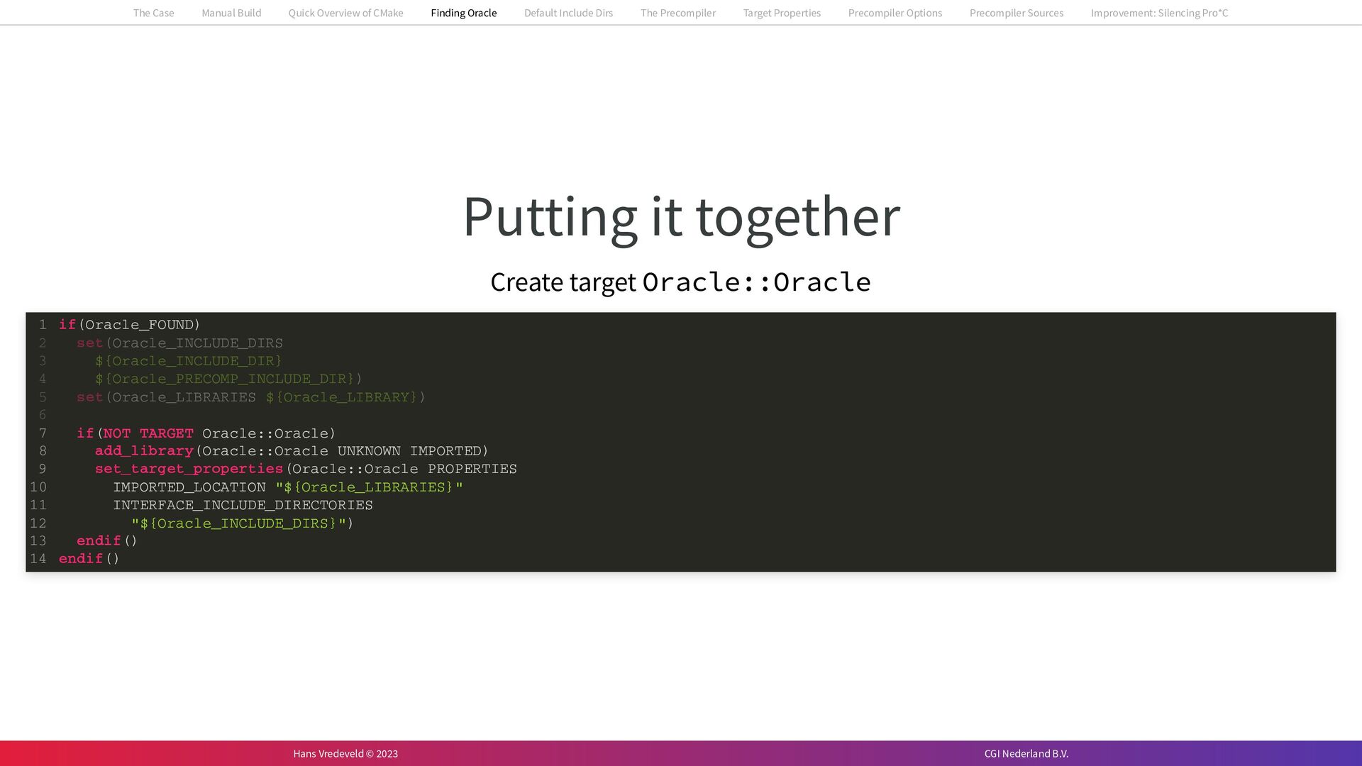 In the case study, we will look at a C++-application that uses embedded SQL to talk to an Oracle SQL-database. To build the application, it needs to link against Oracle’s client library and the files with embedded SQL need to be converted to pure C++ before they can be compiled. How can we find that library when there is no CMake module for it yet? (We write our own!) How can we execute Oracle’s preprocessor to convert files with embedded SQL in a structured way when there are tens, or hundreds, of those files, possibly spread over different CMake targets? Come to my talk and I will tell you.