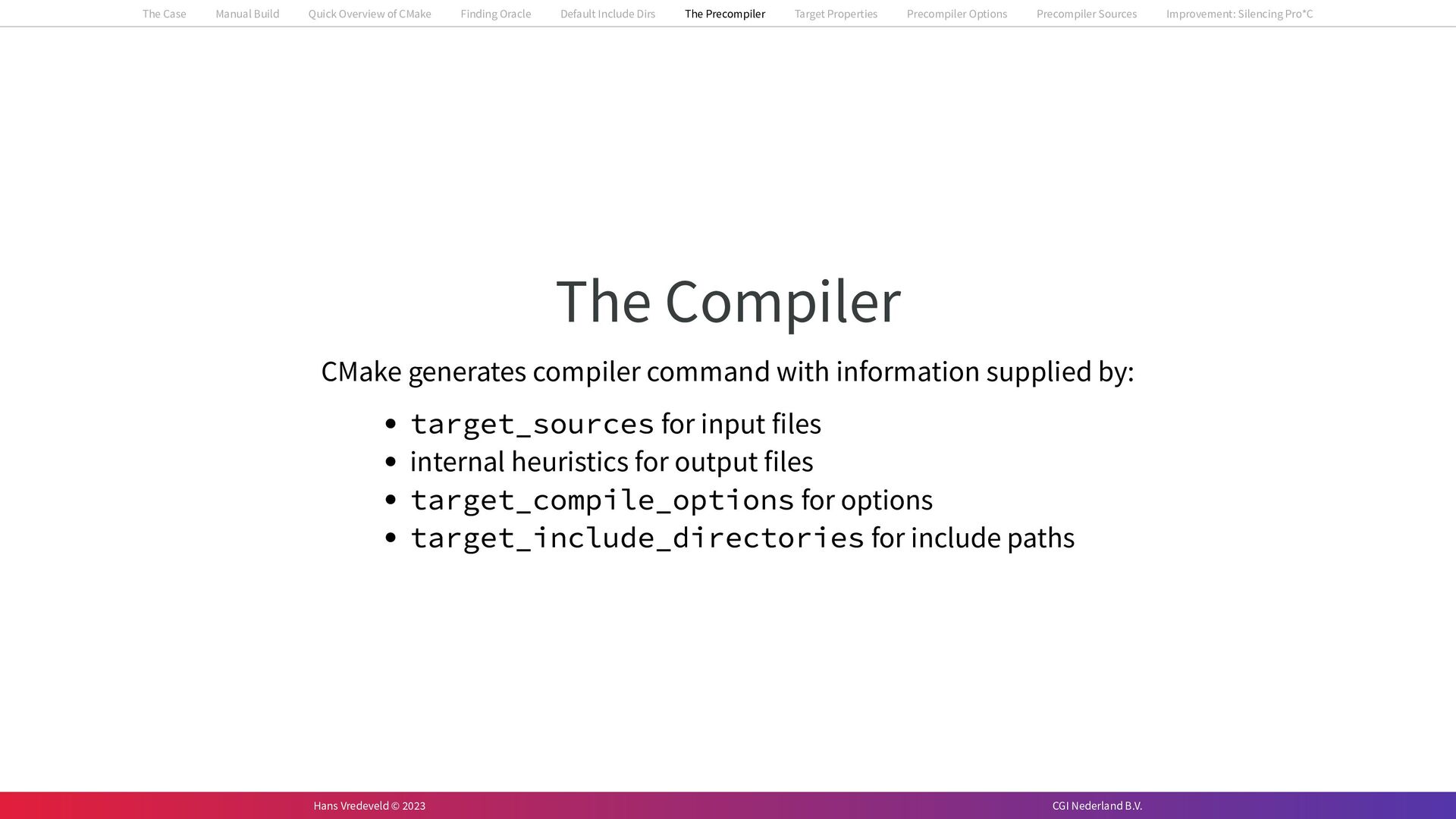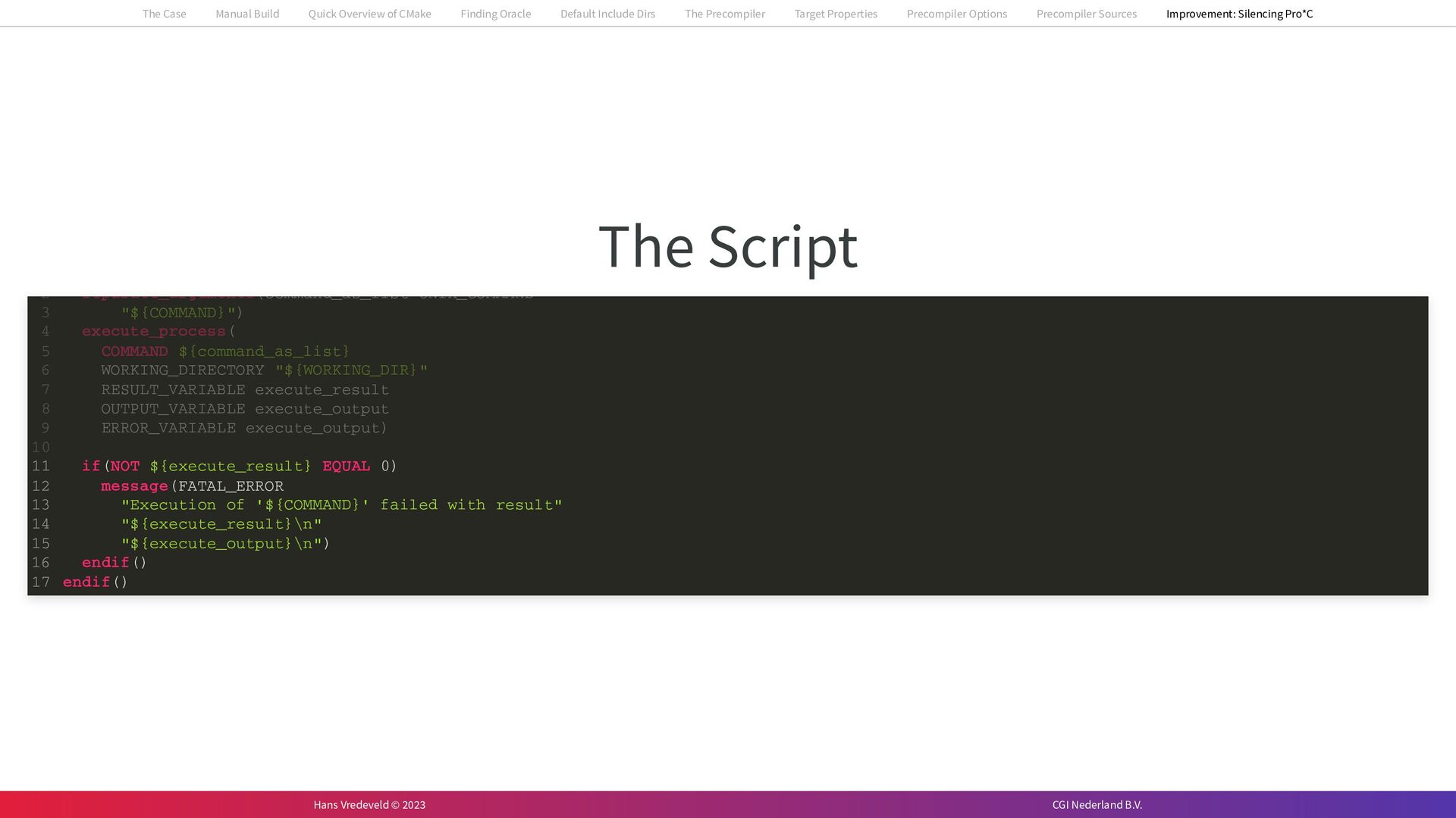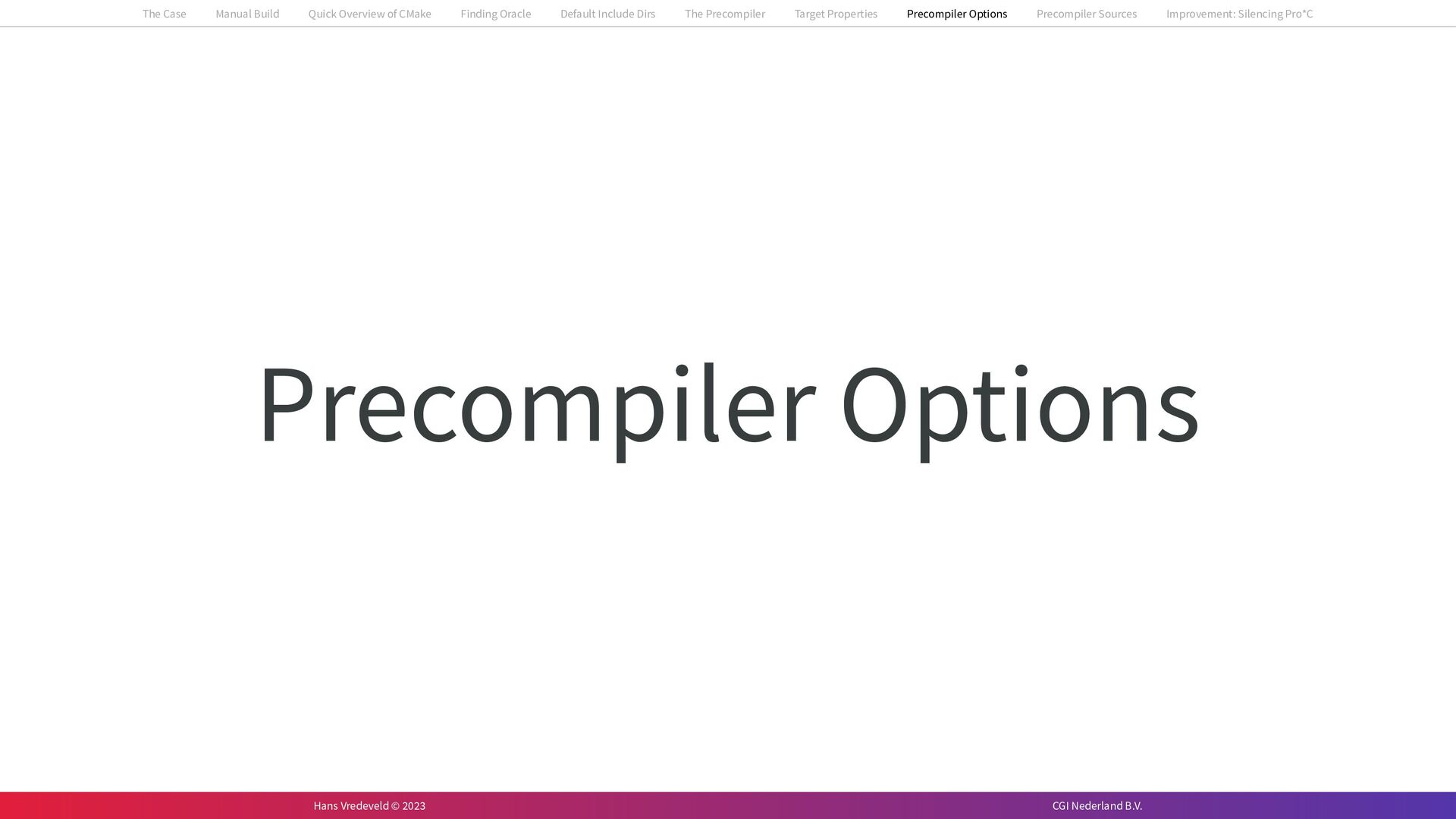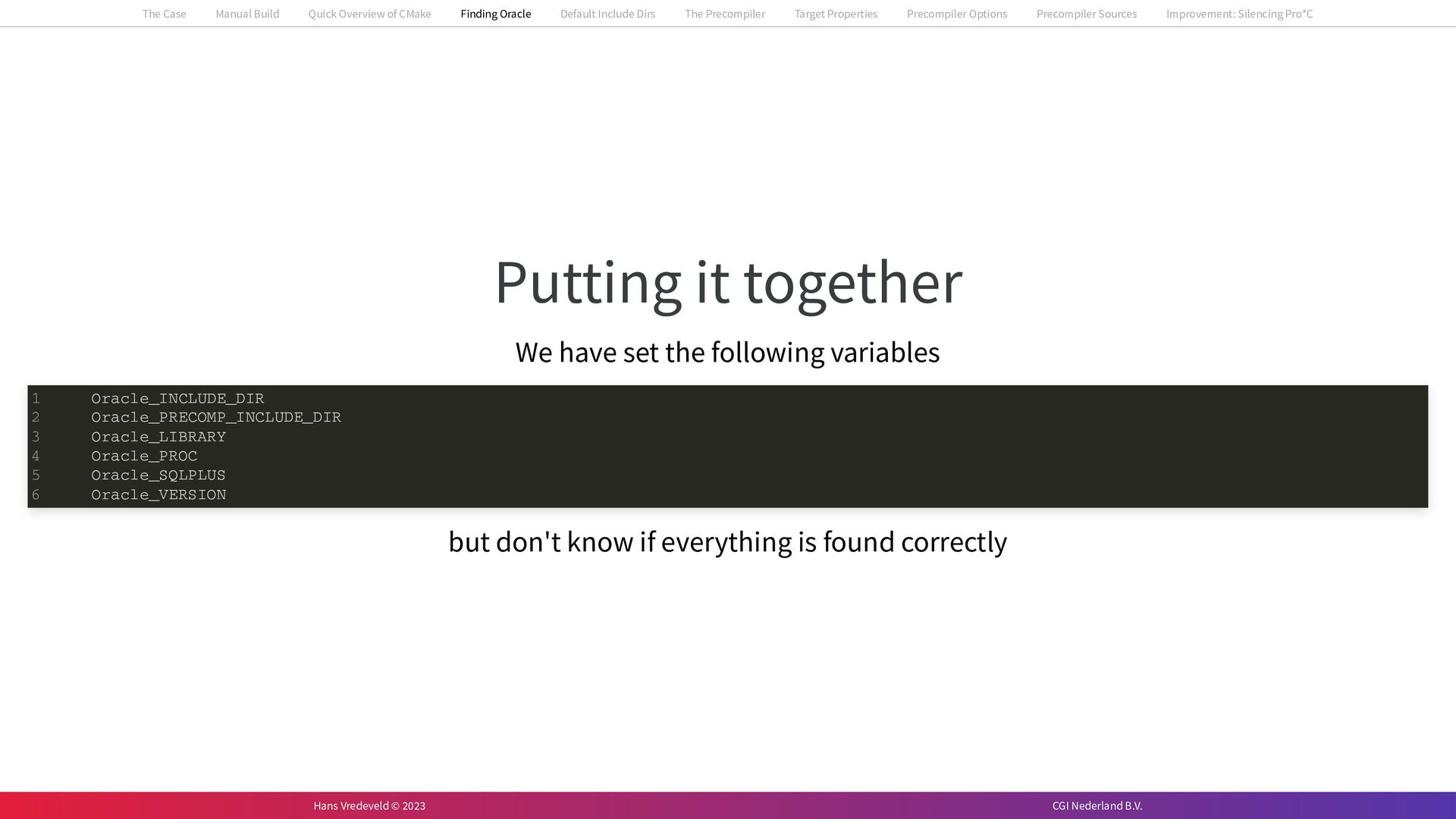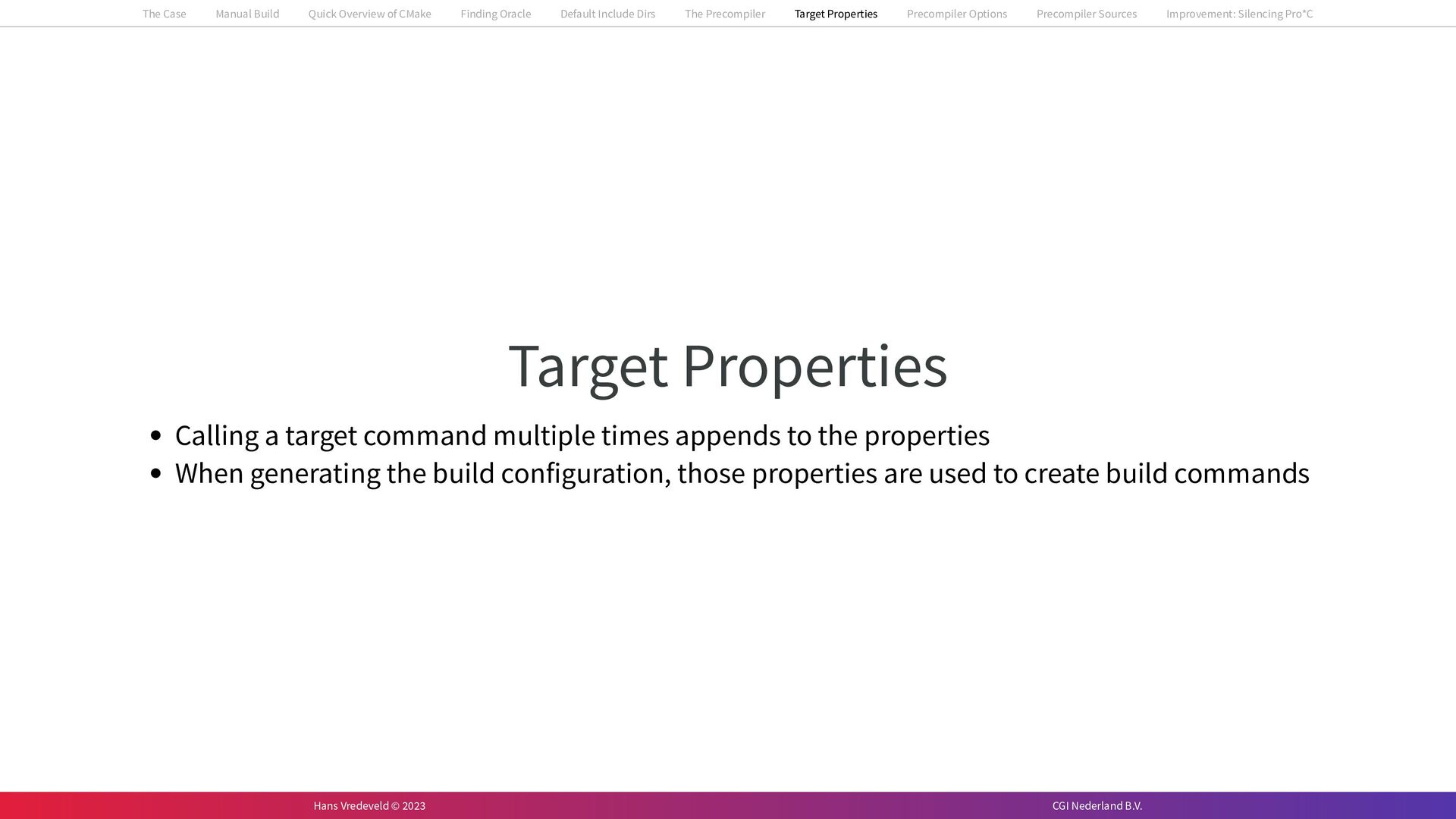 In the case study, we will look at a C++-application that uses embedded SQL to talk to an Oracle SQL-database. To build the application, it needs to link against Oracle’s client library and the files with embedded SQL need to be converted to pure C++ before they can be compiled. How can we find that library when there is no CMake module for it yet? (We write our own!) How can we execute Oracle’s preprocessor to convert files with embedded SQL in a structured way when there are tens, or hundreds, of those files, possibly spread over different CMake targets? Come to my talk and I will tell you.