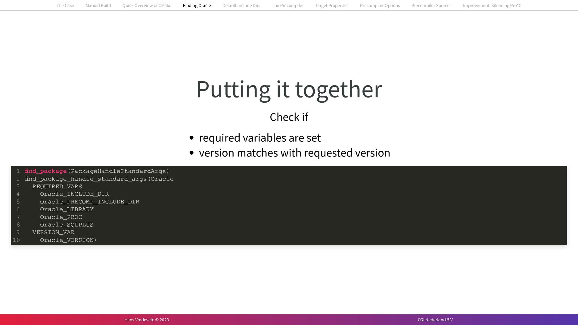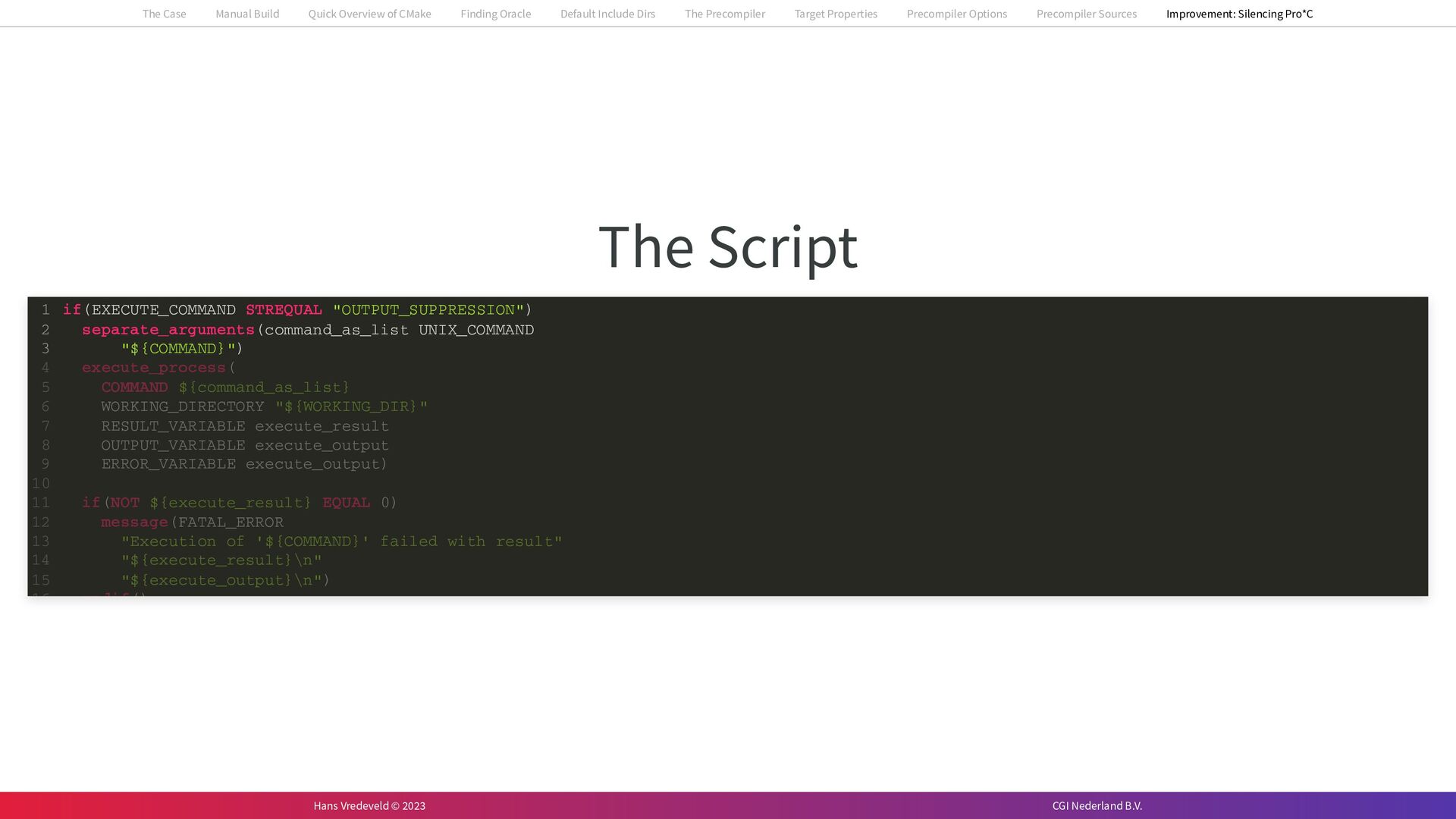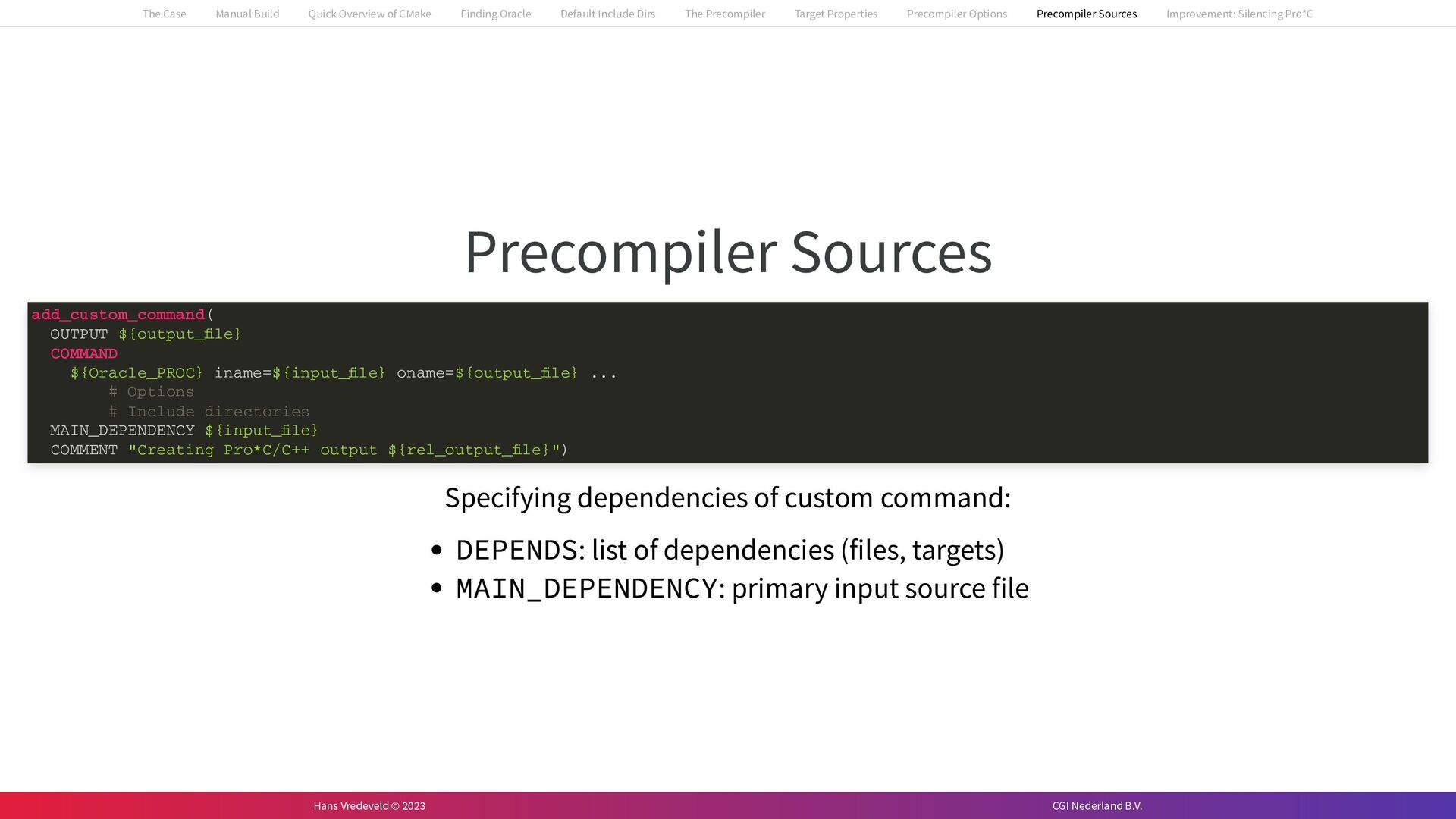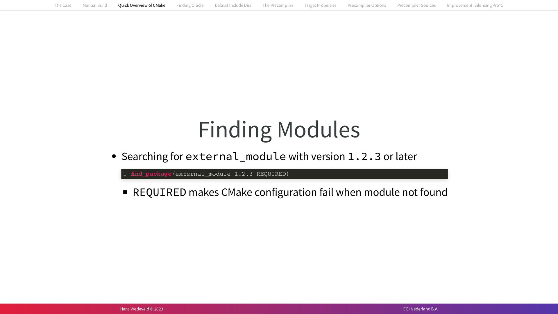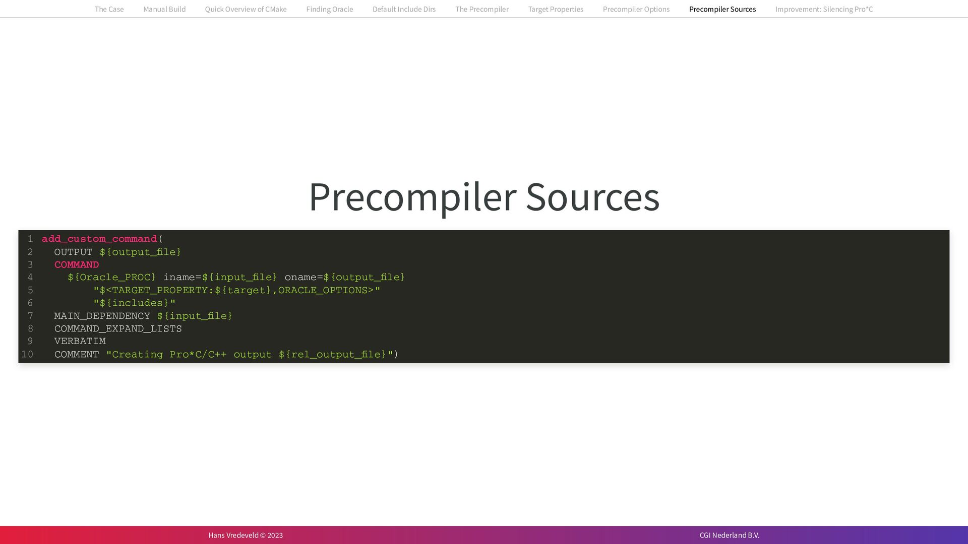 In the case study, we will look at a C++-application that uses embedded SQL to talk to an Oracle SQL-database. To build the application, it needs to link against Oracle’s client library and the files with embedded SQL need to be converted to pure C++ before they can be compiled. How can we find that library when there is no CMake module for it yet? (We write our own!) How can we execute Oracle’s preprocessor to convert files with embedded SQL in a structured way when there are tens, or hundreds, of those files, possibly spread over different CMake targets? Come to my talk and I will tell you.
