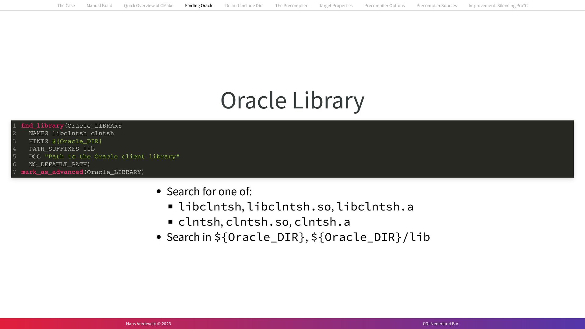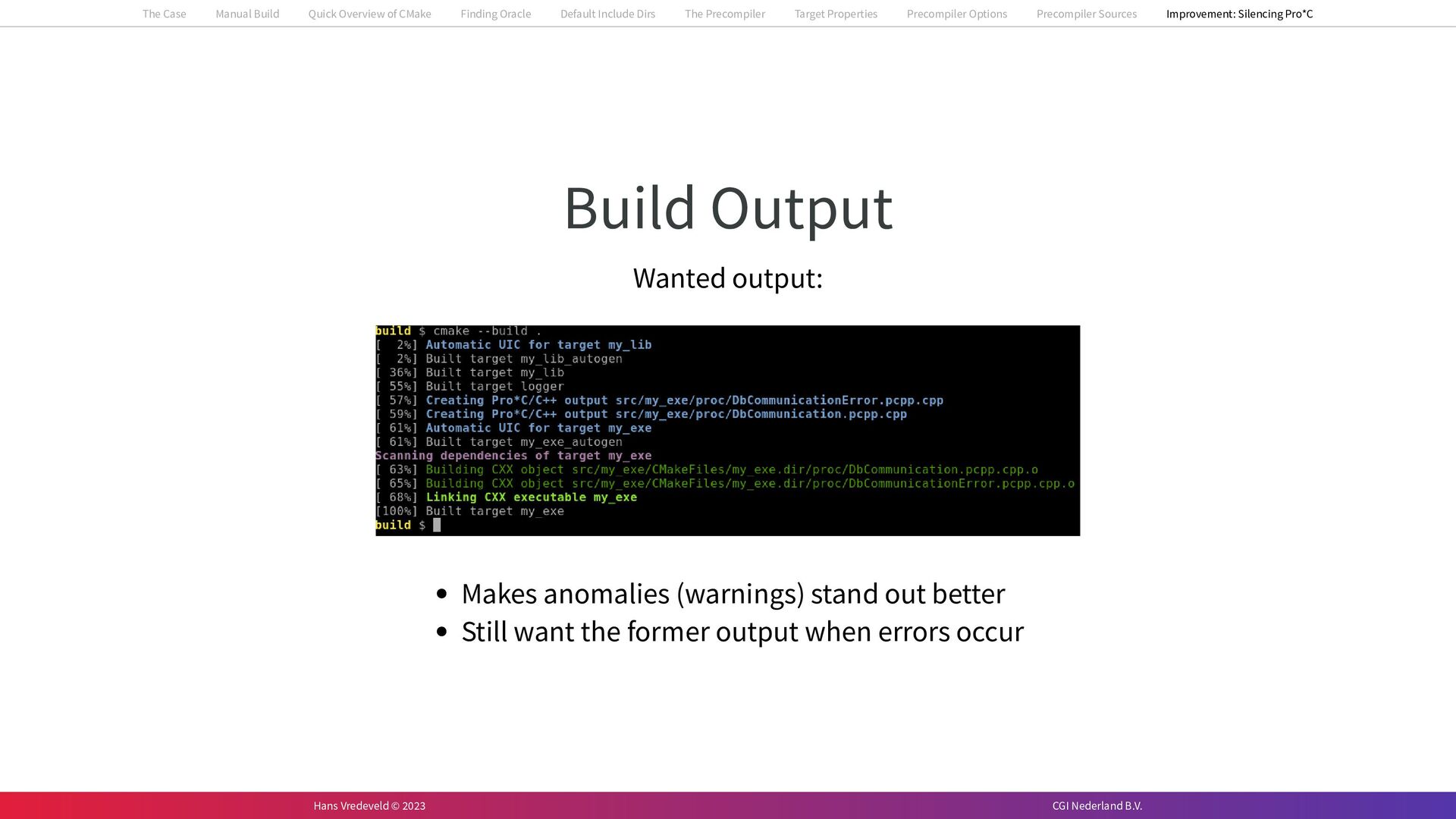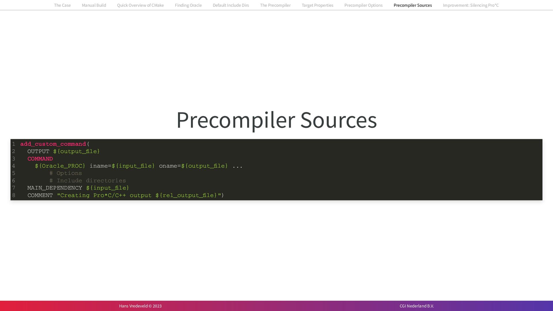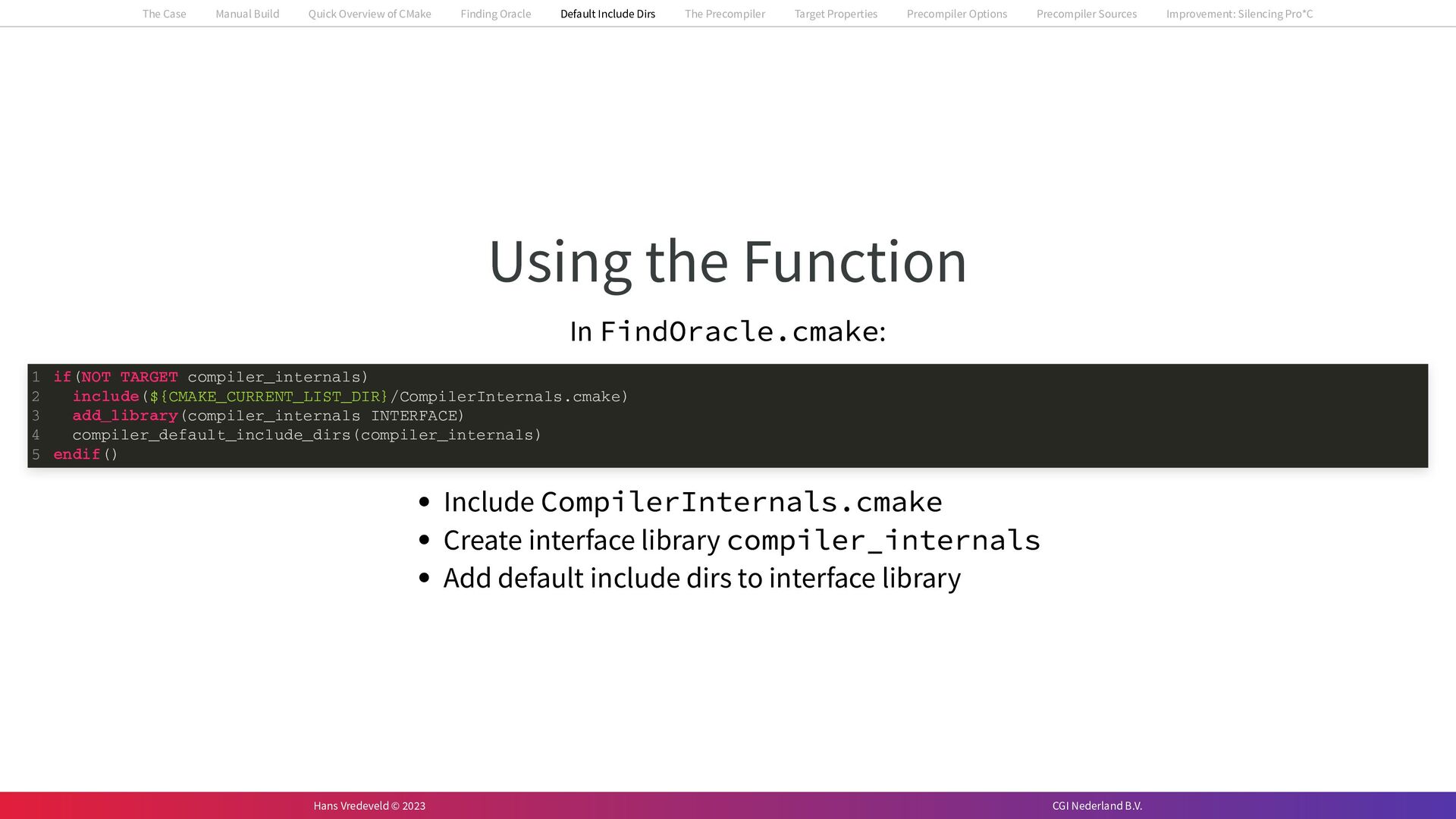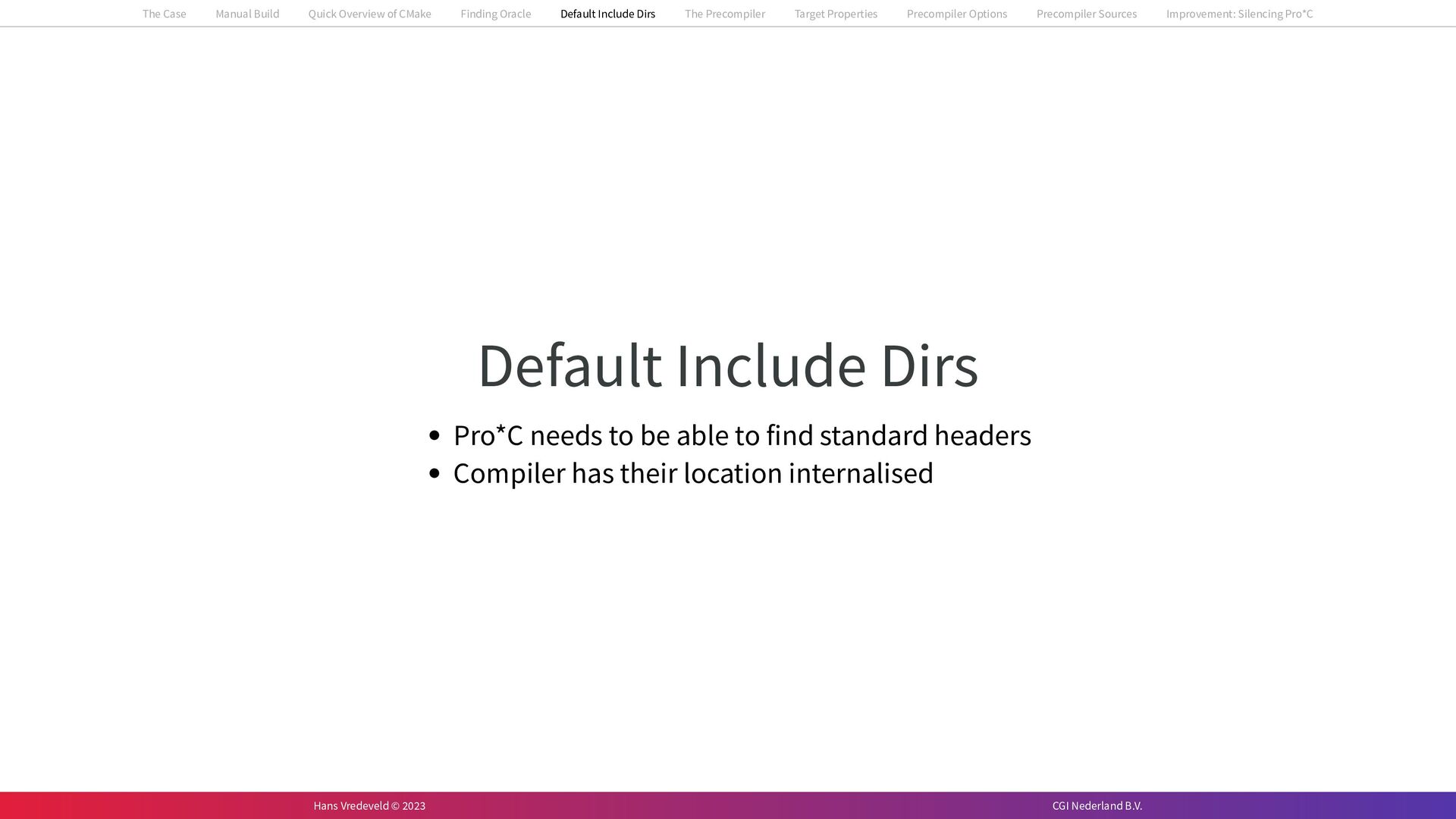 In the case study, we will look at a C++-application that uses embedded SQL to talk to an Oracle SQL-database. To build the application, it needs to link against Oracle’s client library and the files with embedded SQL need to be converted to pure C++ before they can be compiled. How can we find that library when there is no CMake module for it yet? (We write our own!) How can we execute Oracle’s preprocessor to convert files with embedded SQL in a structured way when there are tens, or hundreds, of those files, possibly spread over different CMake targets? Come to my talk and I will tell you.