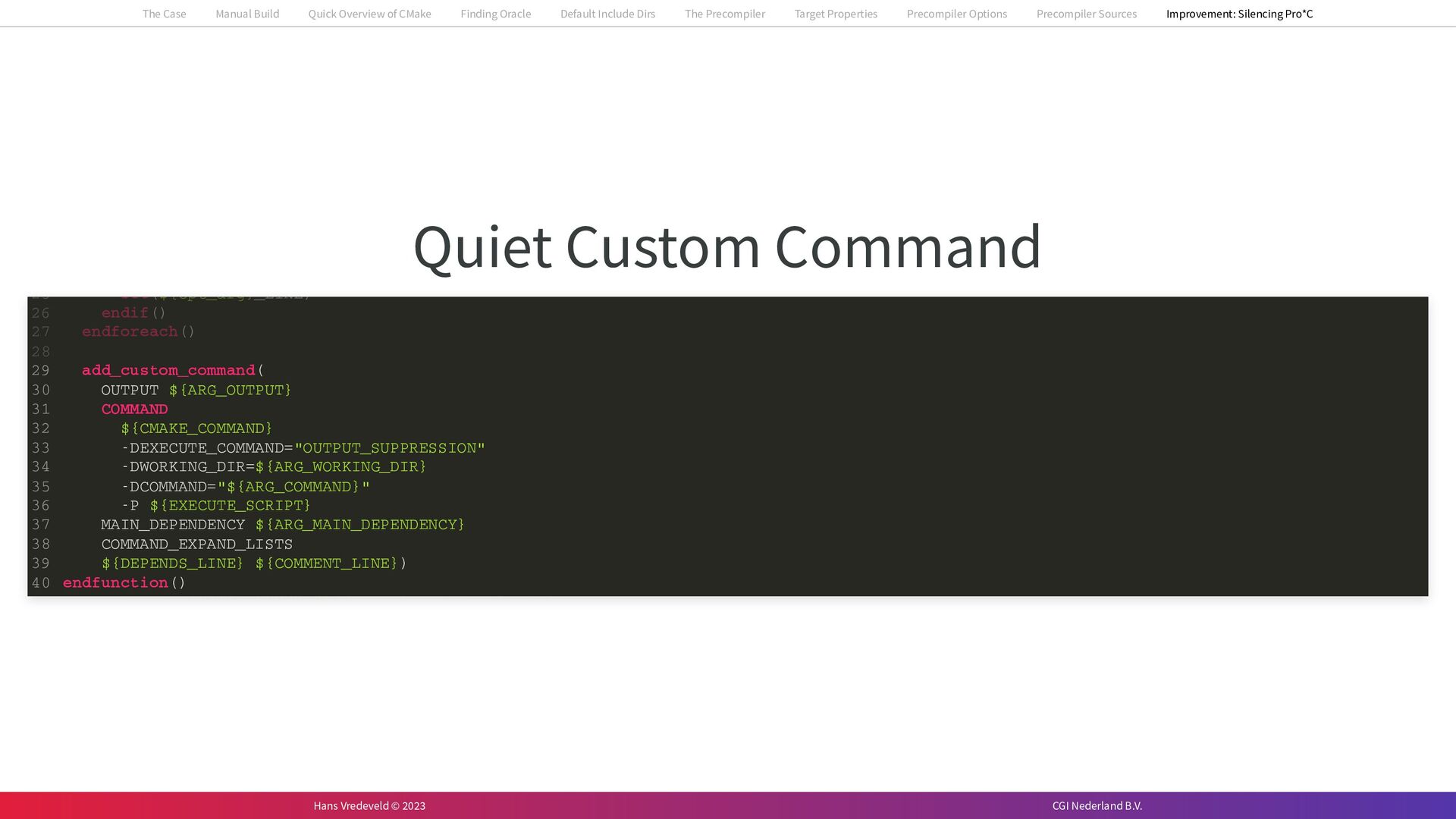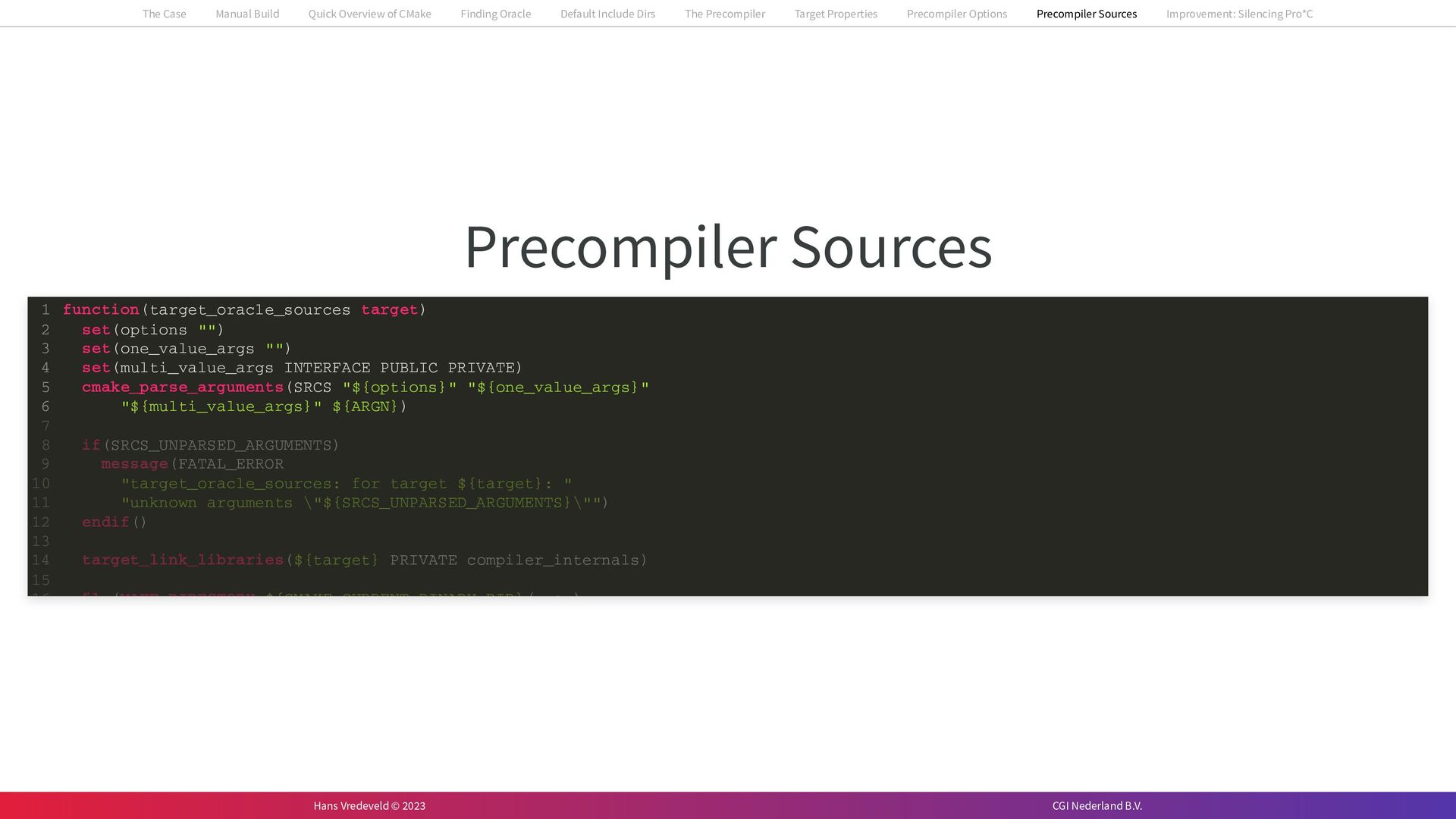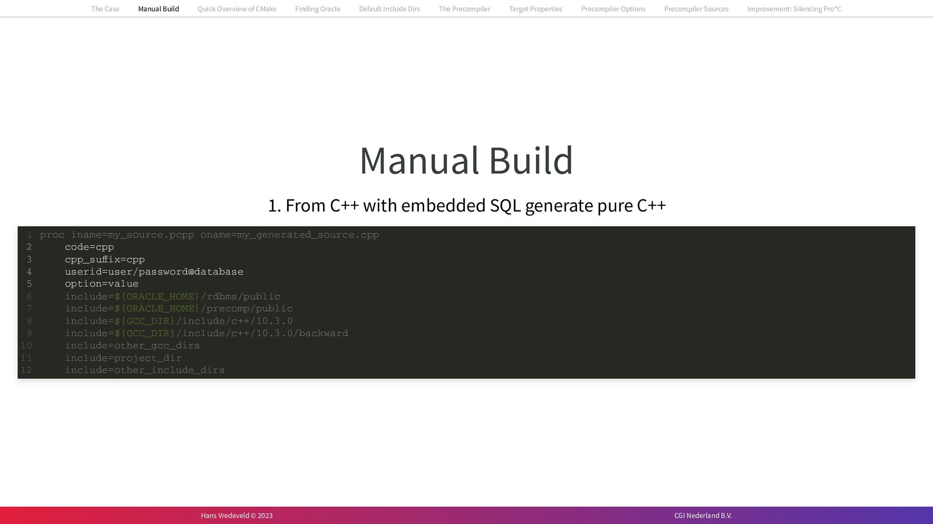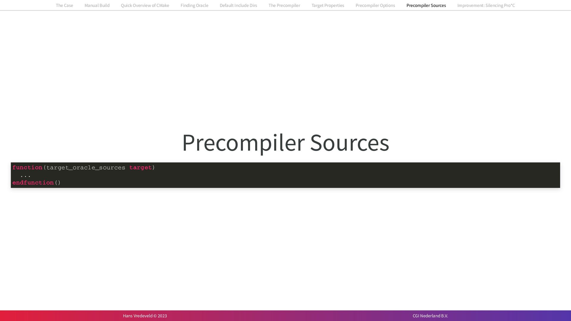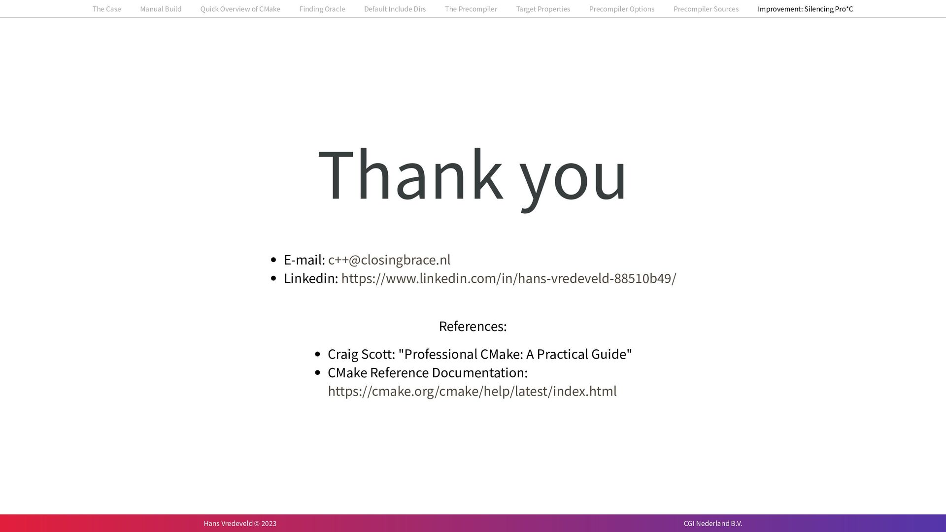 In the case study, we will look at a C++-application that uses embedded SQL to talk to an Oracle SQL-database. To build the application, it needs to link against Oracle’s client library and the files with embedded SQL need to be converted to pure C++ before they can be compiled. How can we find that library when there is no CMake module for it yet? (We write our own!) How can we execute Oracle’s preprocessor to convert files with embedded SQL in a structured way when there are tens, or hundreds, of those files, possibly spread over different CMake targets? Come to my talk and I will tell you.