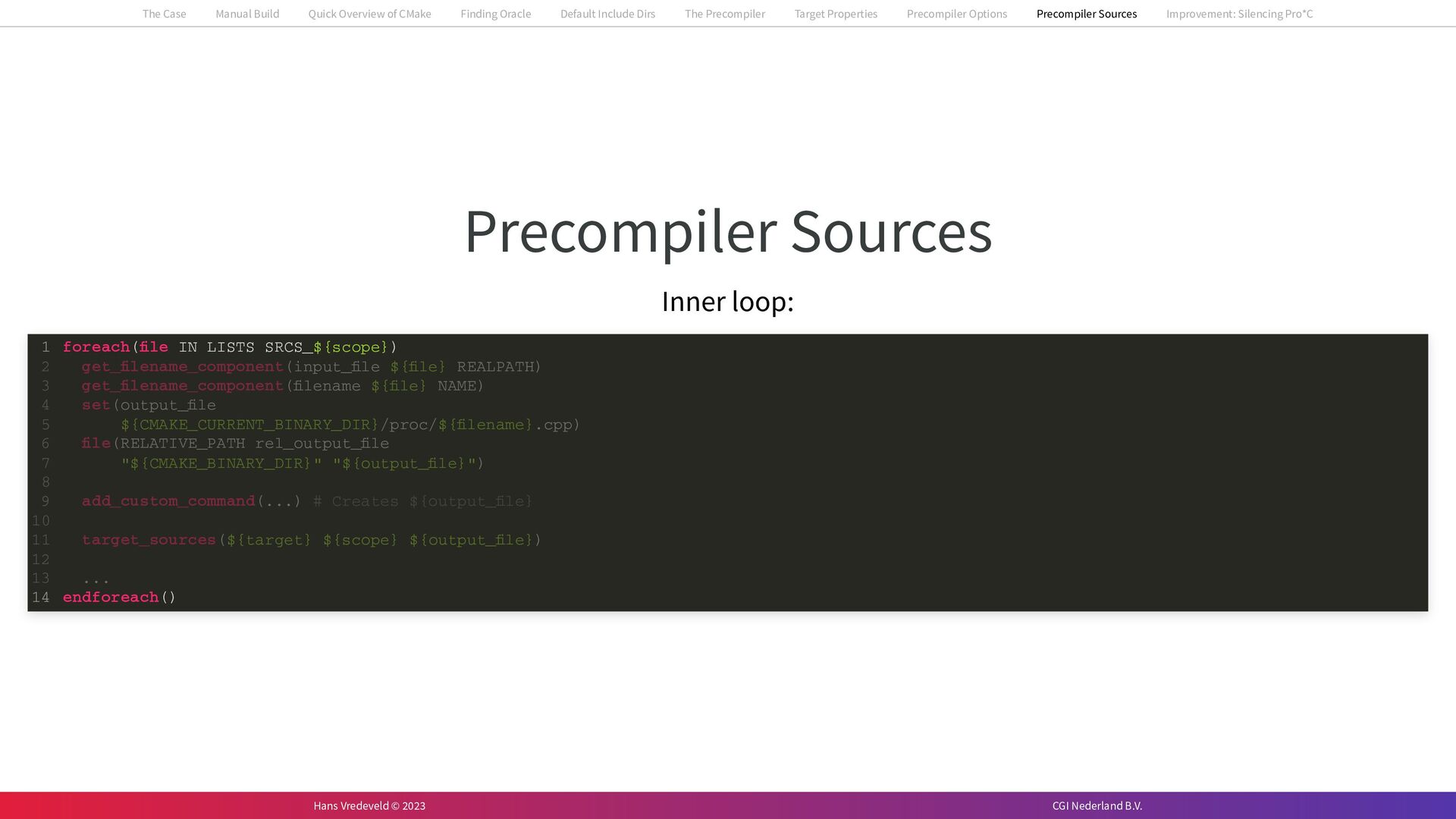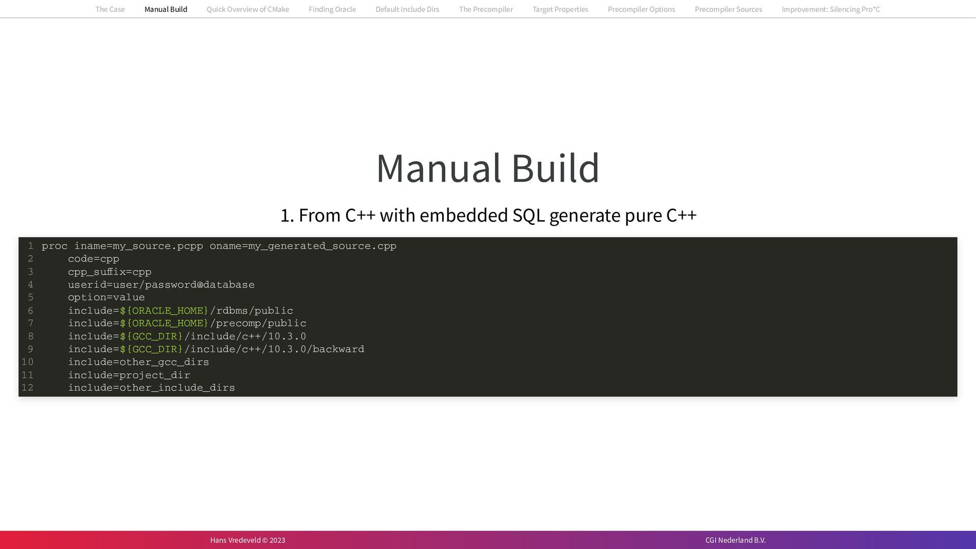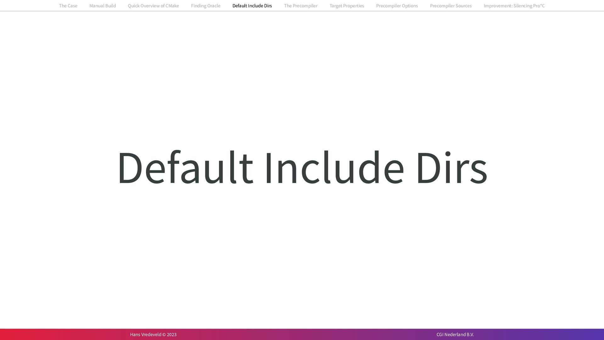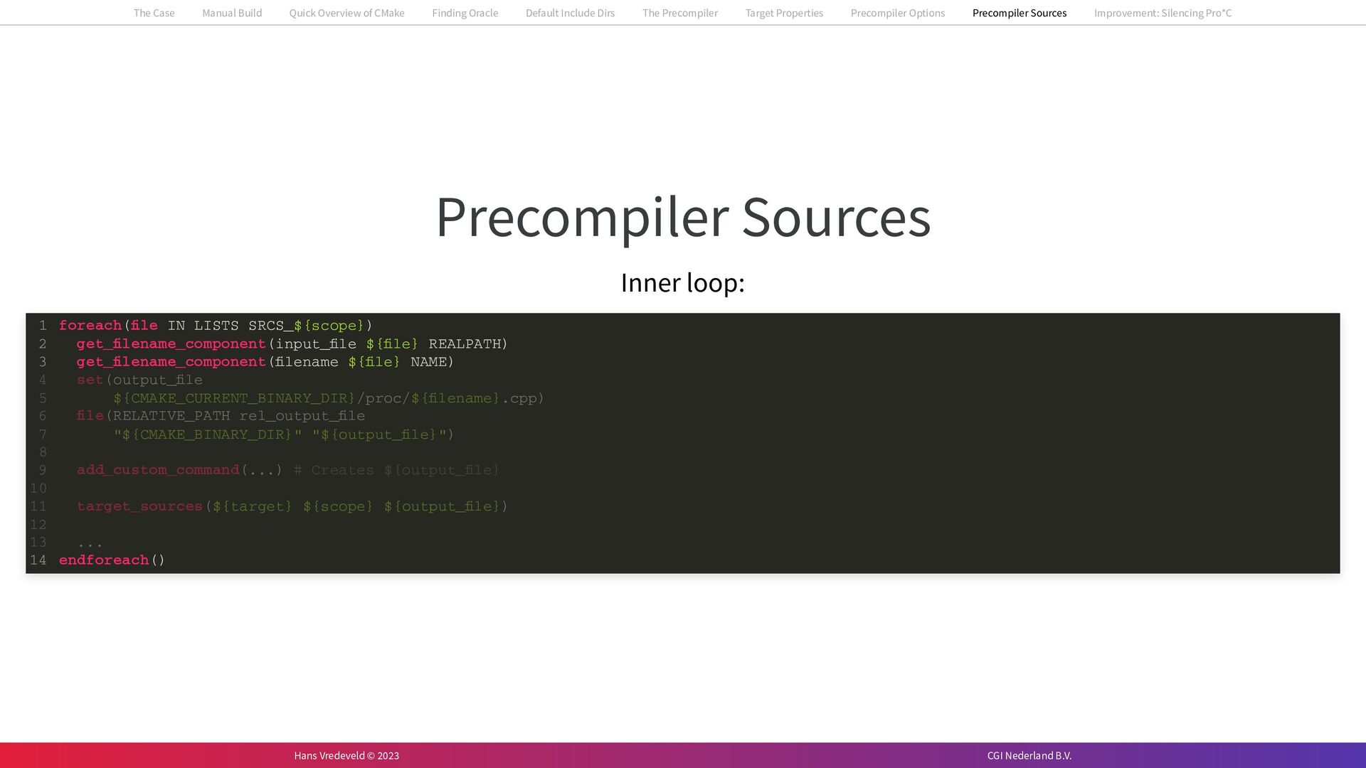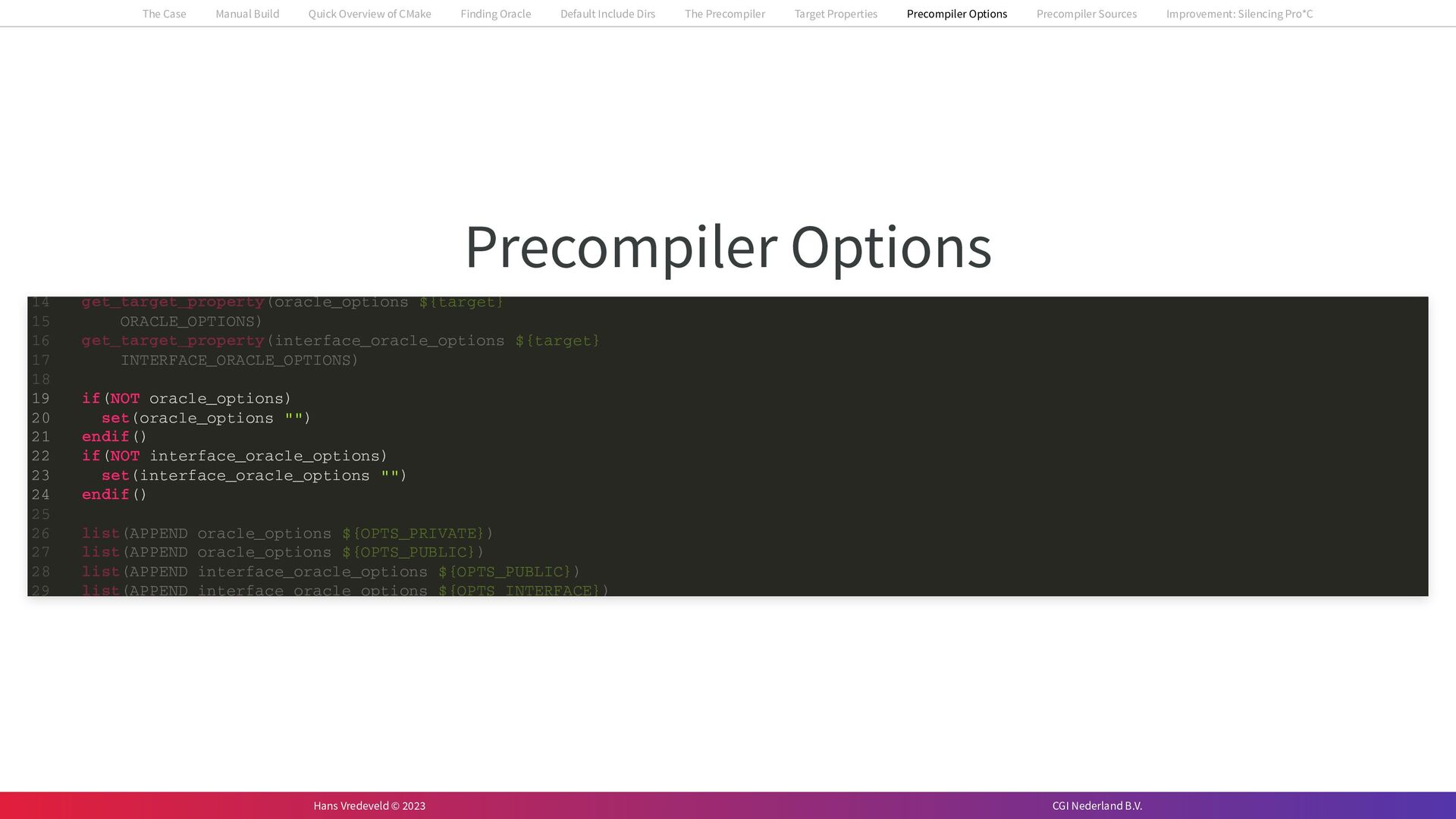 In the case study, we will look at a C++-application that uses embedded SQL to talk to an Oracle SQL-database. To build the application, it needs to link against Oracle’s client library and the files with embedded SQL need to be converted to pure C++ before they can be compiled. How can we find that library when there is no CMake module for it yet? (We write our own!) How can we execute Oracle’s preprocessor to convert files with embedded SQL in a structured way when there are tens, or hundreds, of those files, possibly spread over different CMake targets? Come to my talk and I will tell you.