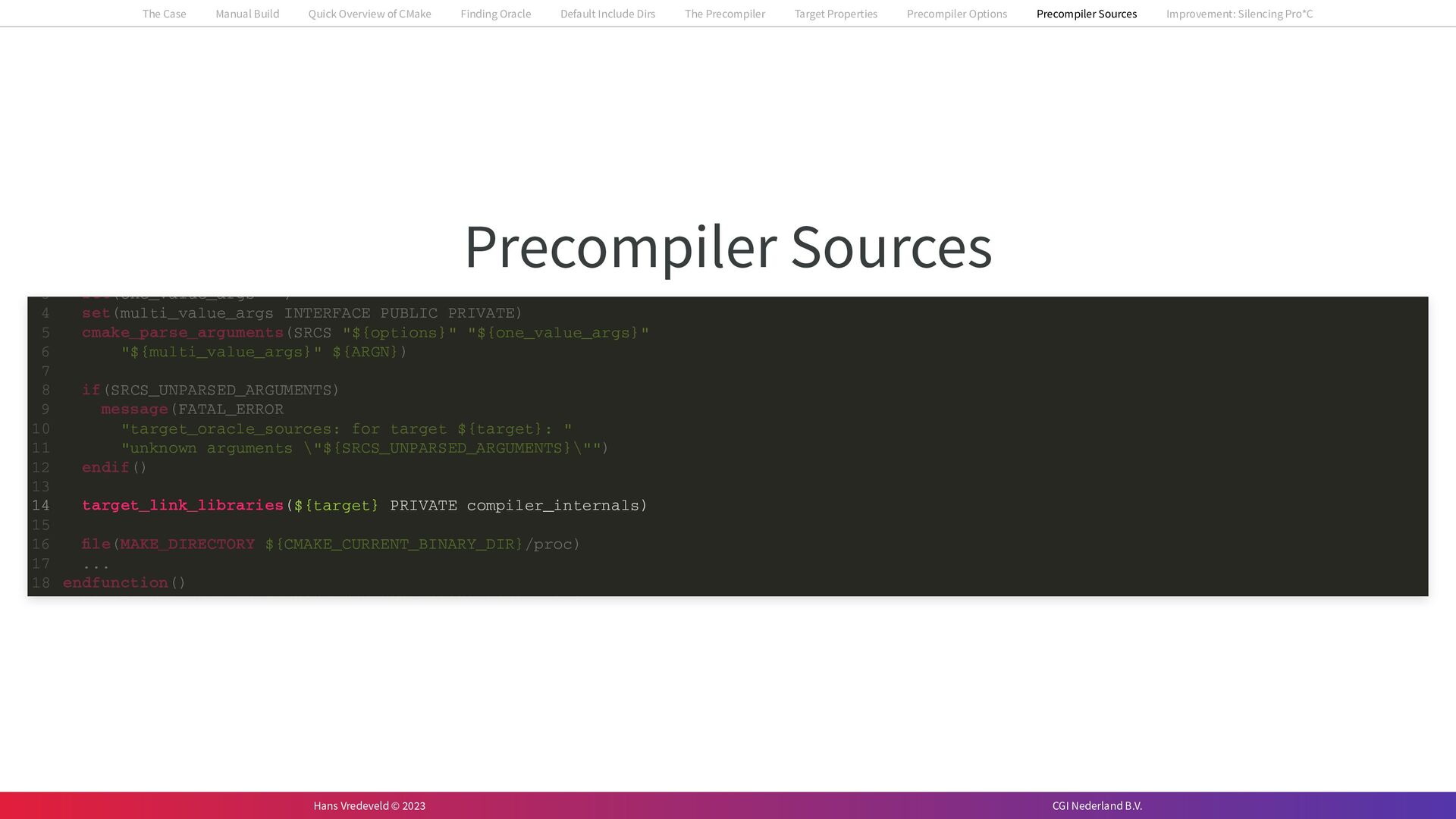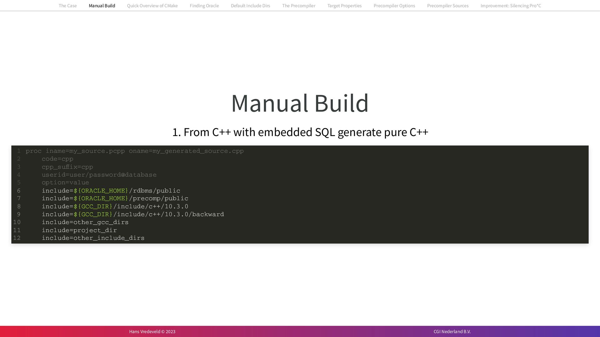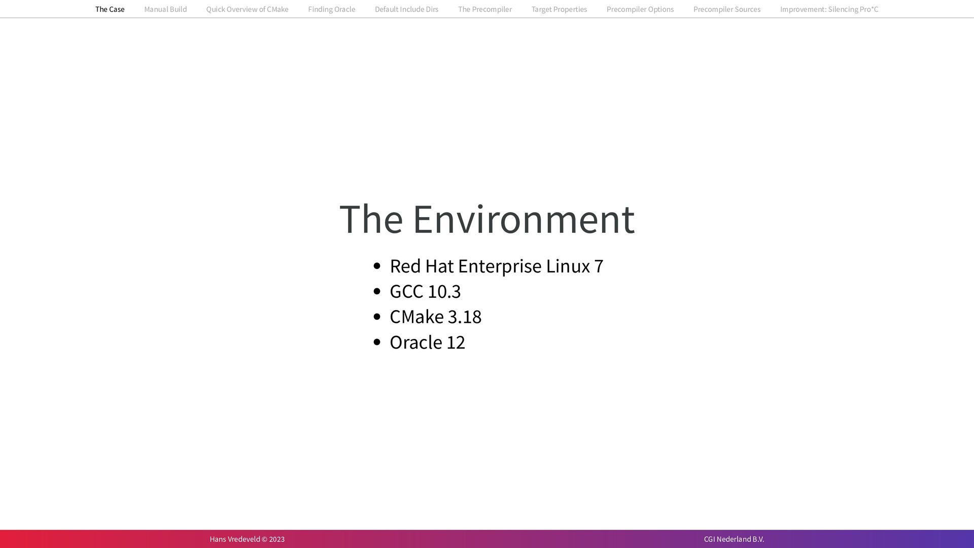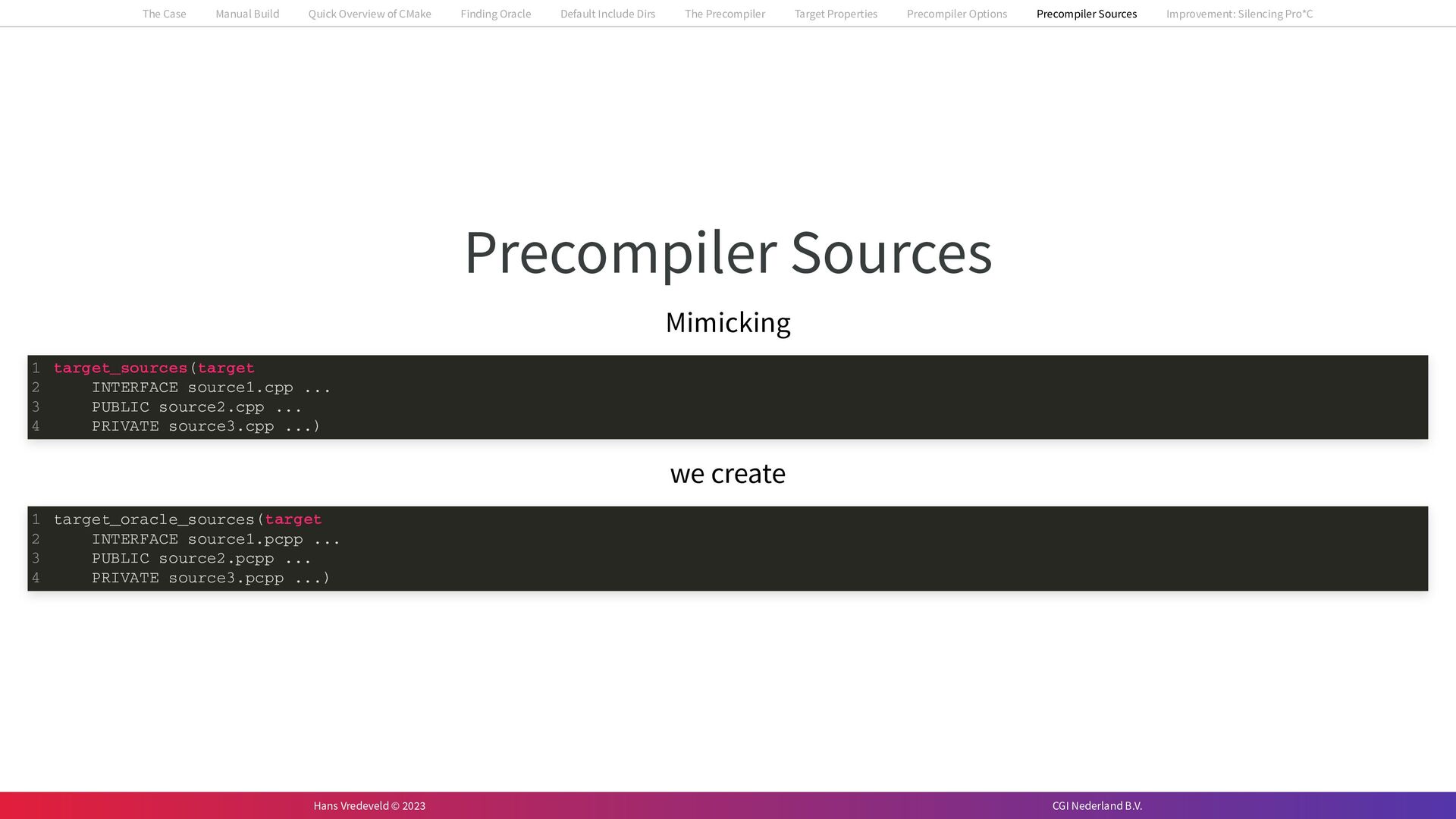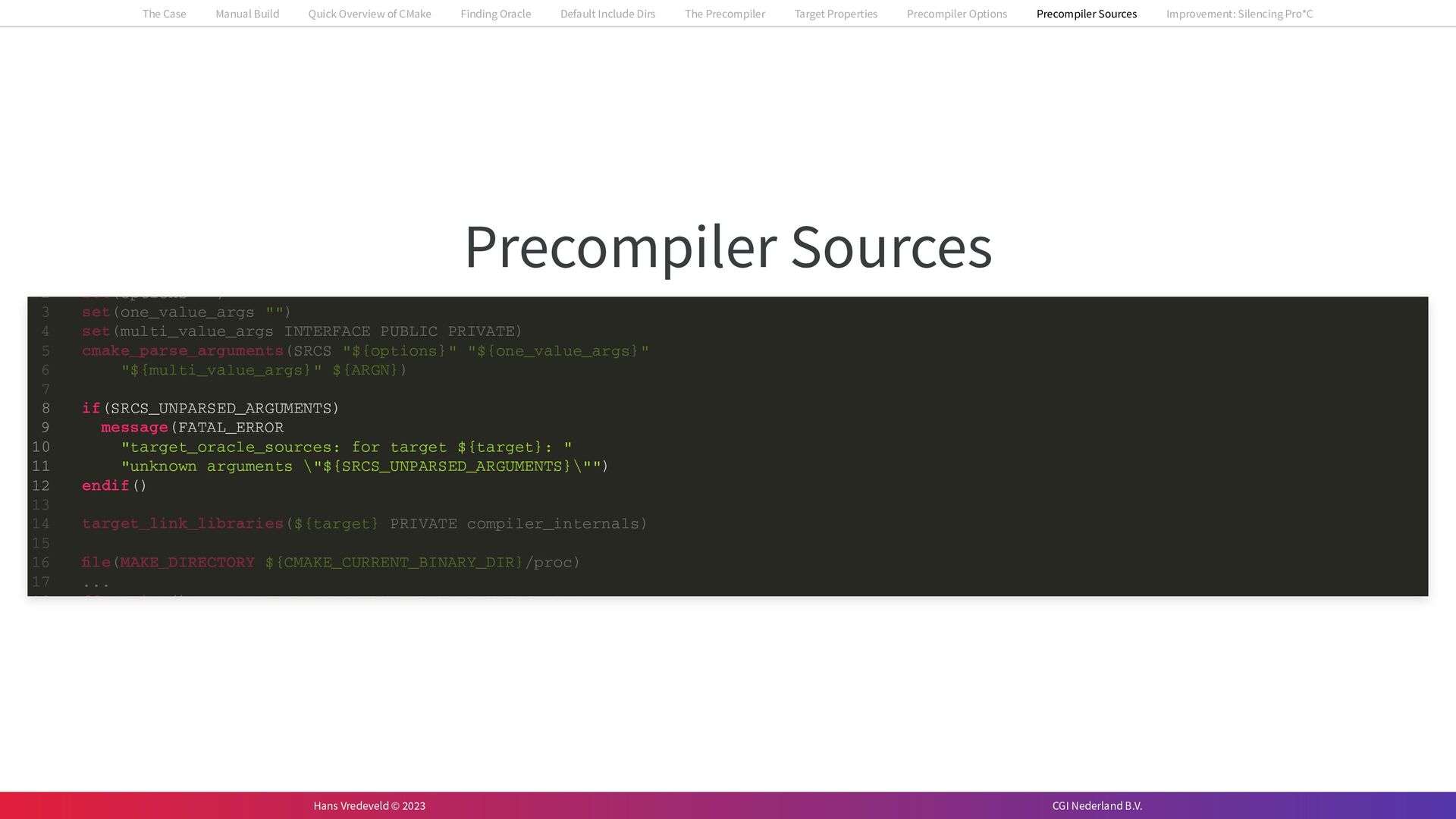 In the case study, we will look at a C++-application that uses embedded SQL to talk to an Oracle SQL-database. To build the application, it needs to link against Oracle’s client library and the files with embedded SQL need to be converted to pure C++ before they can be compiled. How can we find that library when there is no CMake module for it yet? (We write our own!) How can we execute Oracle’s preprocessor to convert files with embedded SQL in a structured way when there are tens, or hundreds, of those files, possibly spread over different CMake targets? Come to my talk and I will tell you.