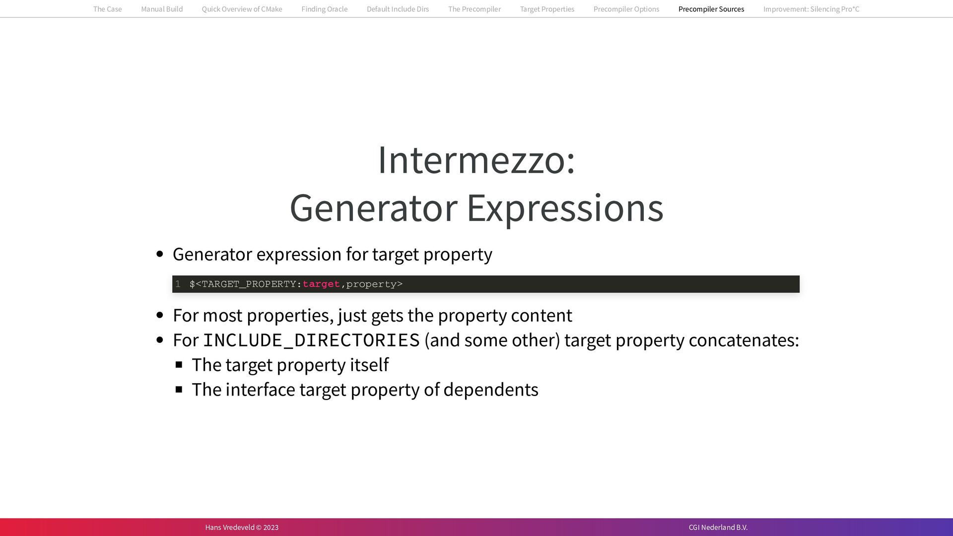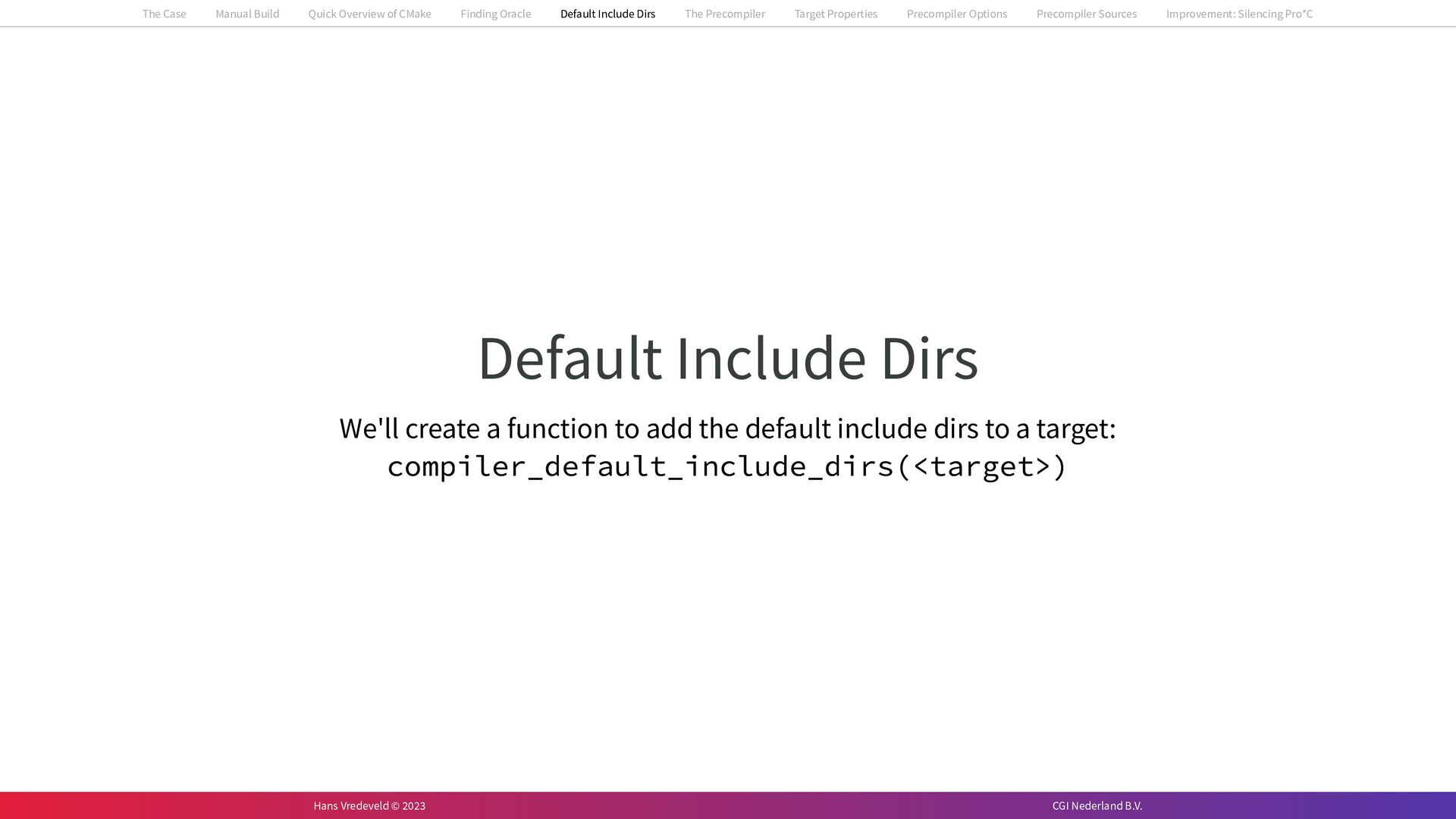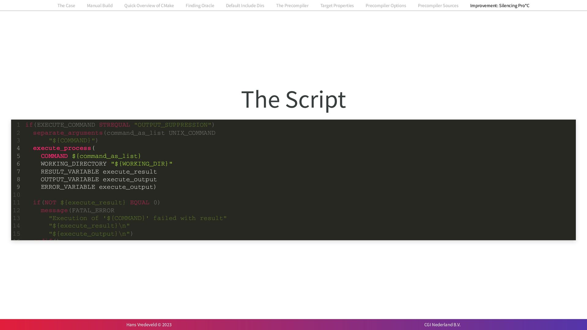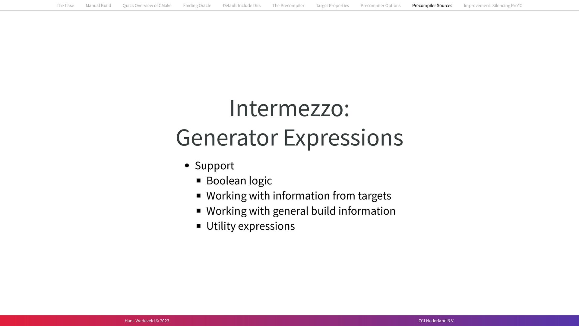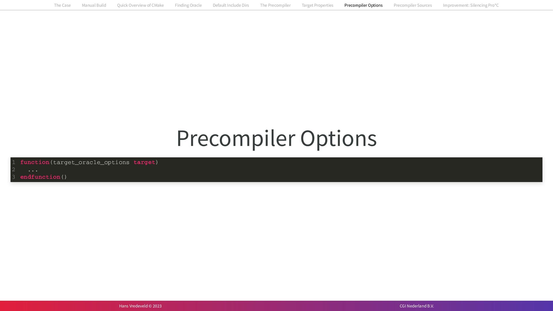 In the case study, we will look at a C++-application that uses embedded SQL to talk to an Oracle SQL-database. To build the application, it needs to link against Oracle’s client library and the files with embedded SQL need to be converted to pure C++ before they can be compiled. How can we find that library when there is no CMake module for it yet? (We write our own!) How can we execute Oracle’s preprocessor to convert files with embedded SQL in a structured way when there are tens, or hundreds, of those files, possibly spread over different CMake targets? Come to my talk and I will tell you.