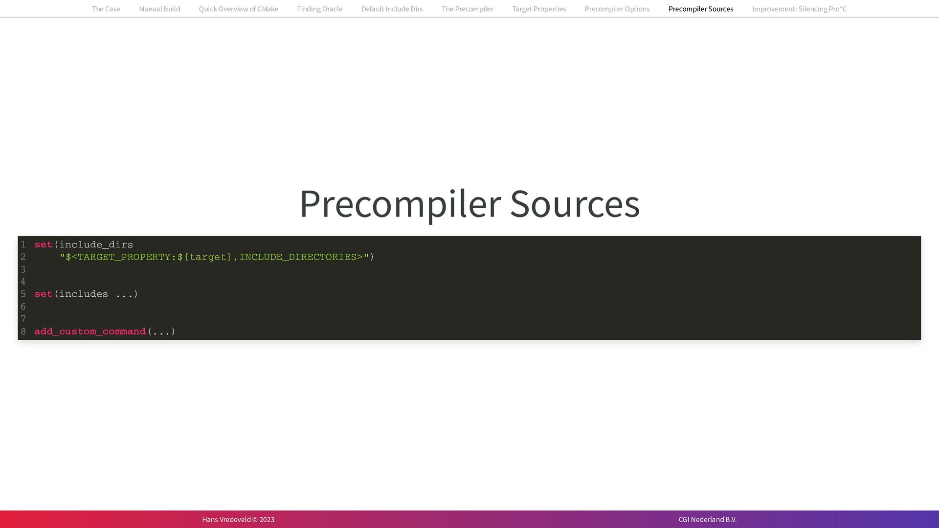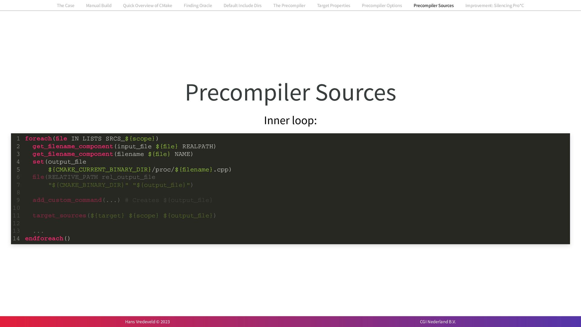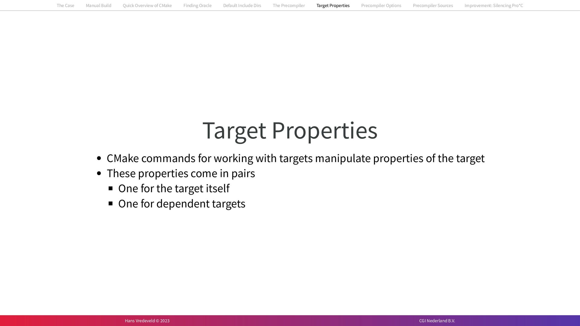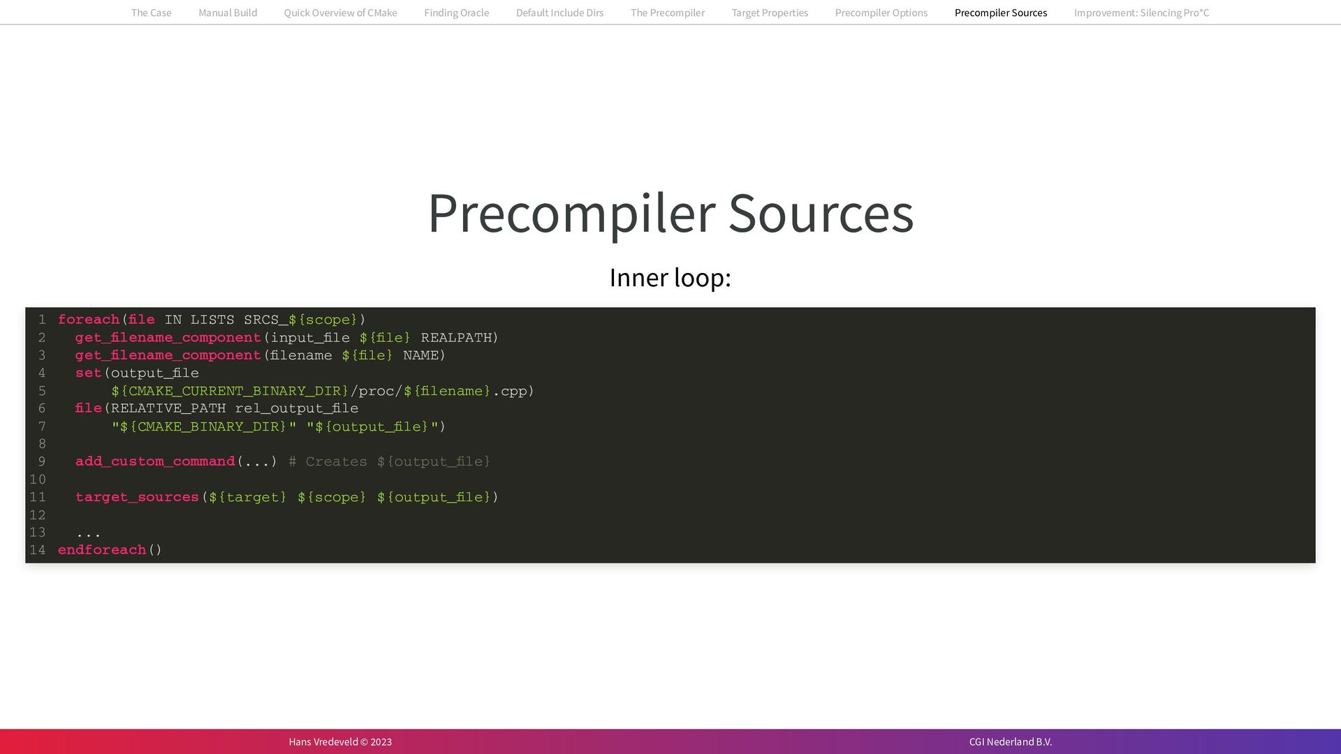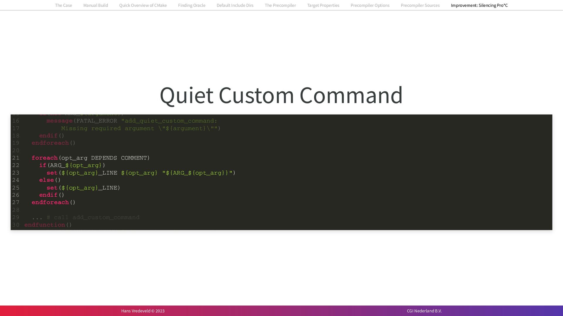 In the case study, we will look at a C++-application that uses embedded SQL to talk to an Oracle SQL-database. To build the application, it needs to link against Oracle’s client library and the files with embedded SQL need to be converted to pure C++ before they can be compiled. How can we find that library when there is no CMake module for it yet? (We write our own!) How can we execute Oracle’s preprocessor to convert files with embedded SQL in a structured way when there are tens, or hundreds, of those files, possibly spread over different CMake targets? Come to my talk and I will tell you.
