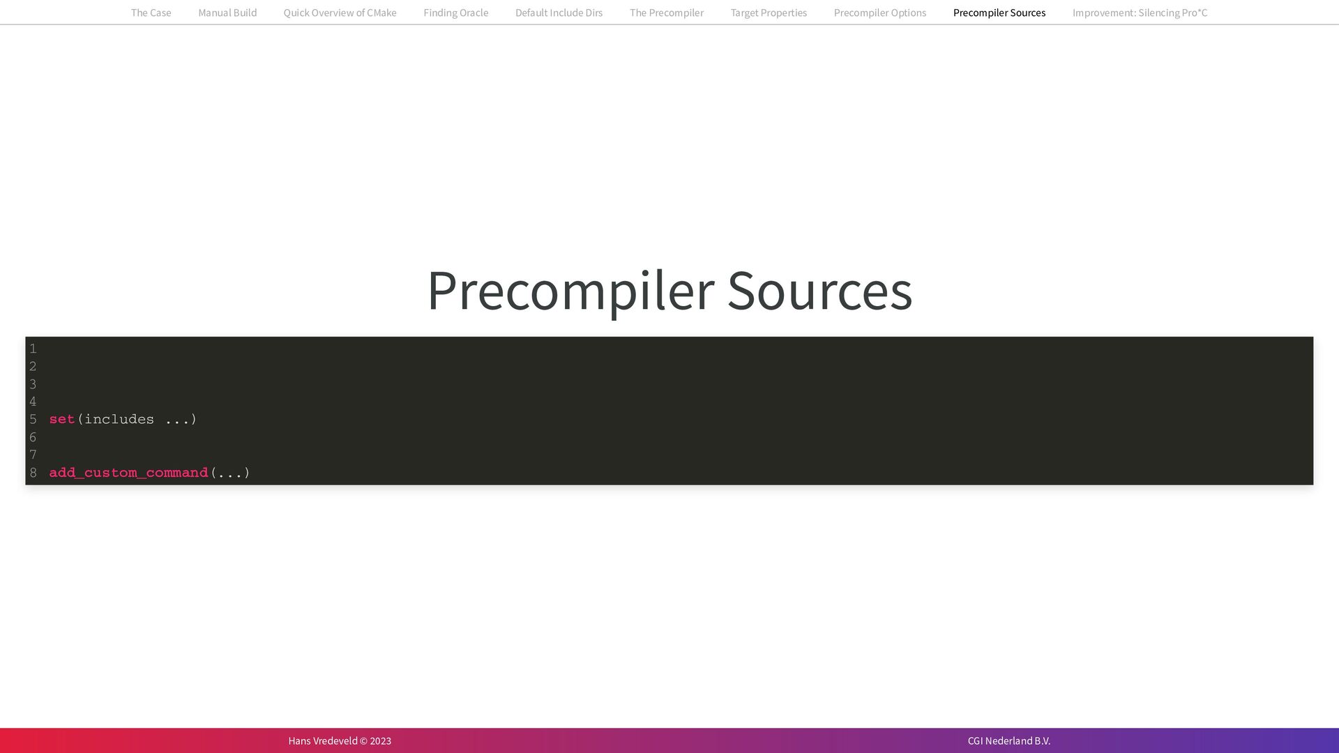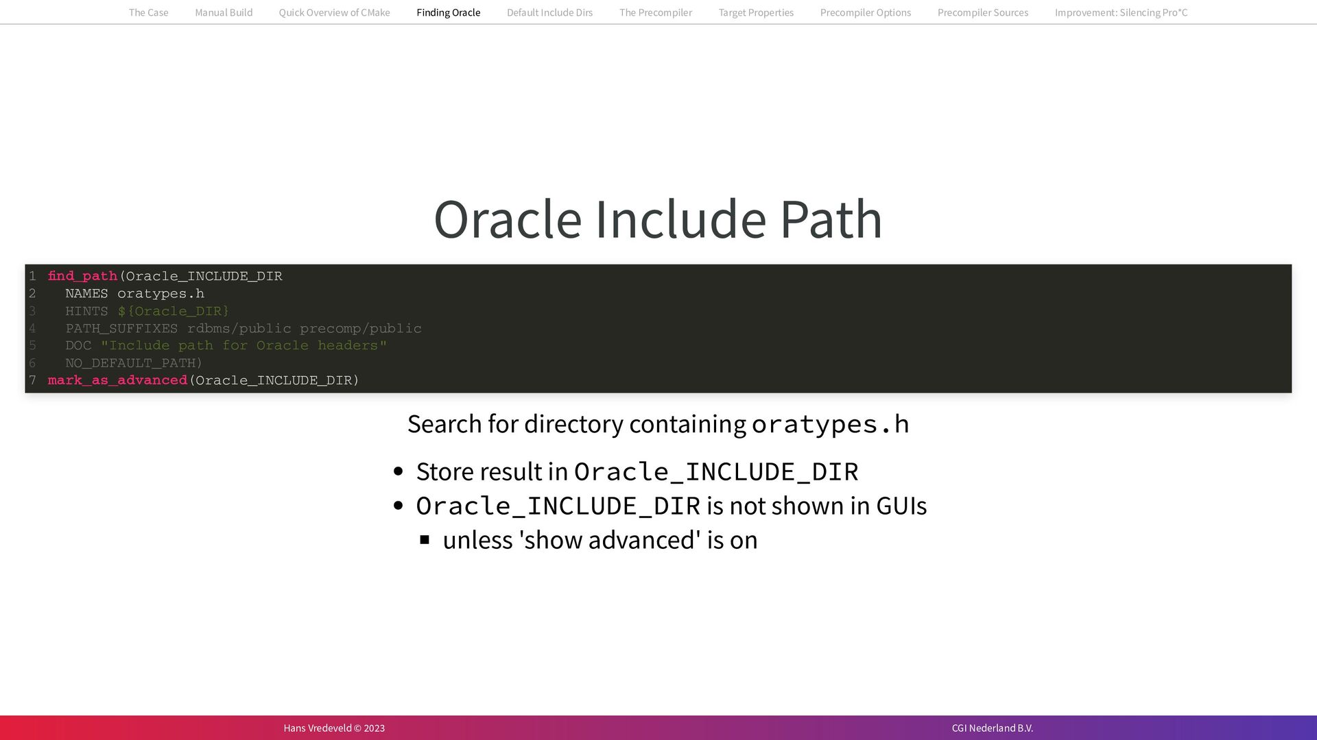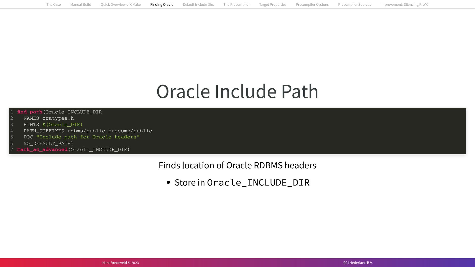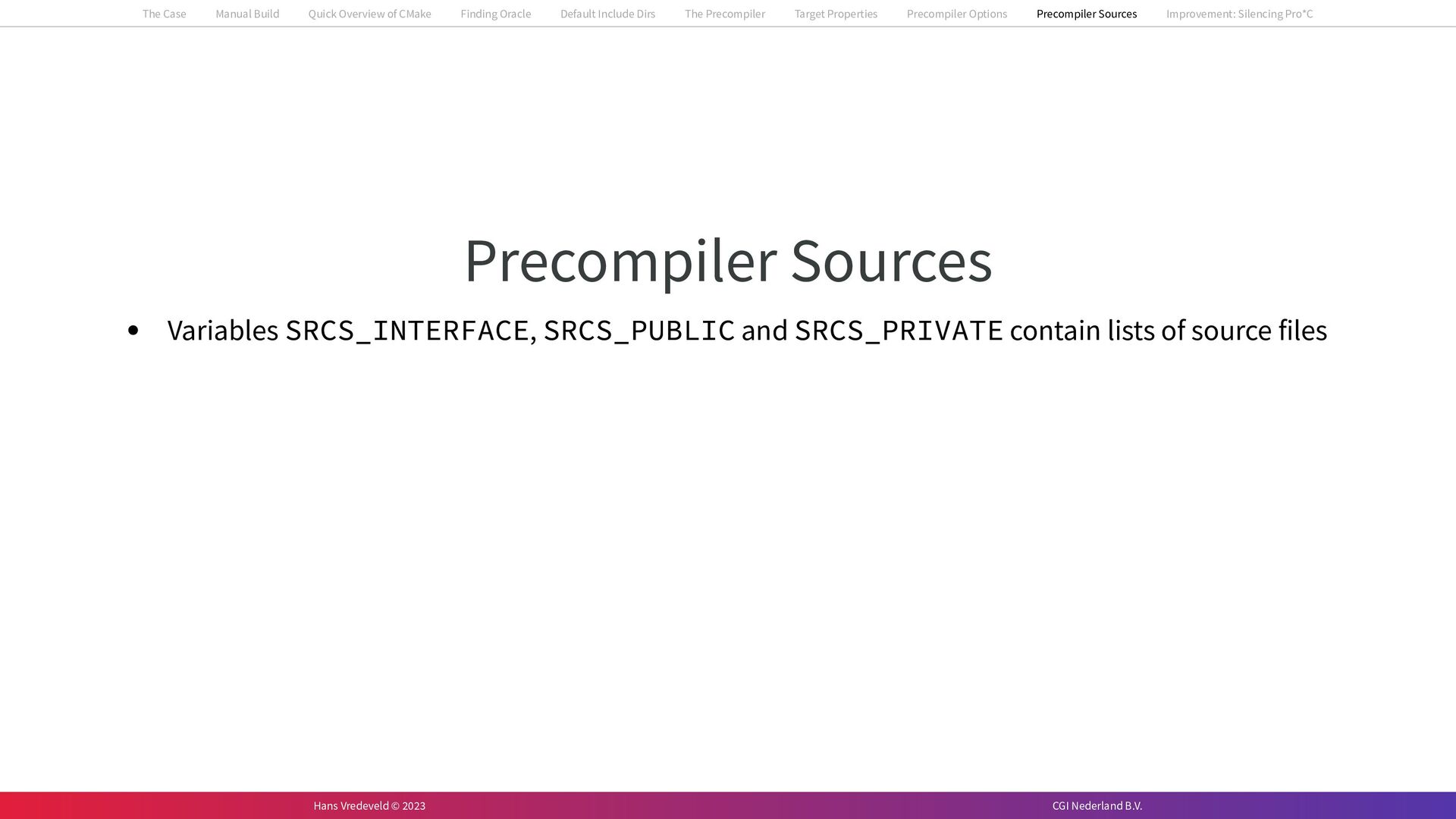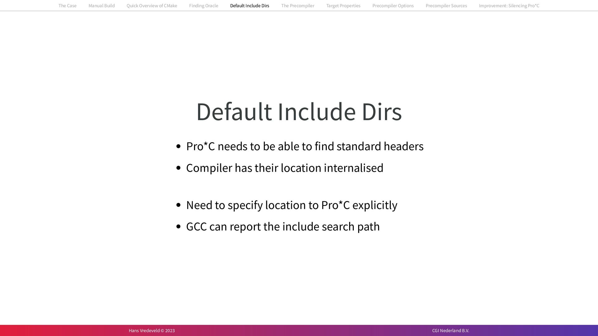In the case study, we will look at a C++-application that uses embedded SQL to talk to an Oracle SQL-database. To build the application, it needs to link against Oracle’s client library and the files with embedded SQL need to be converted to pure C++ before they can be compiled. How can we find that library when there is no CMake module for it yet? (We write our own!) How can we execute Oracle’s preprocessor to convert files with embedded SQL in a structured way when there are tens, or hundreds, of those files, possibly spread over different CMake targets? Come to my talk and I will tell you.