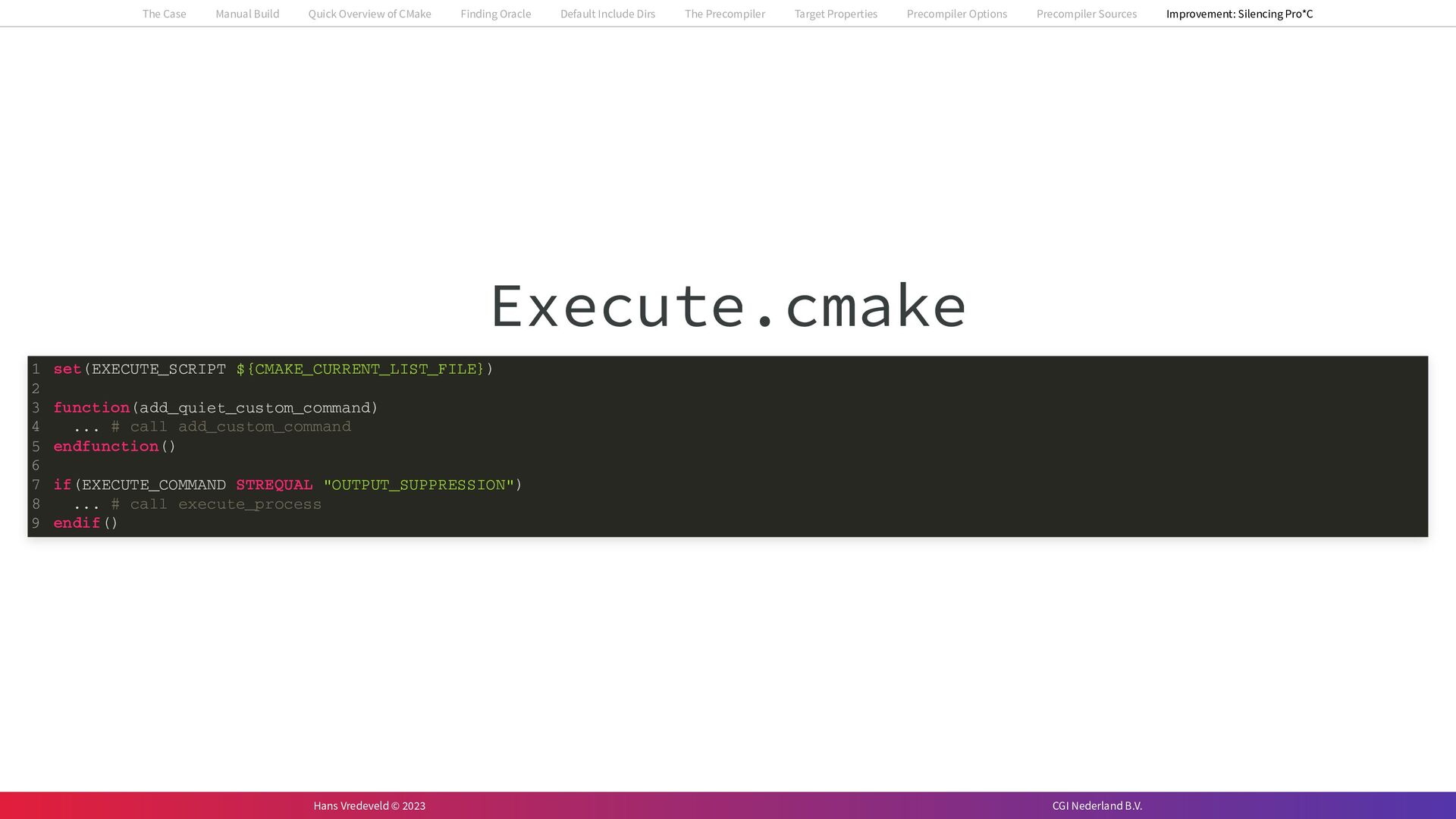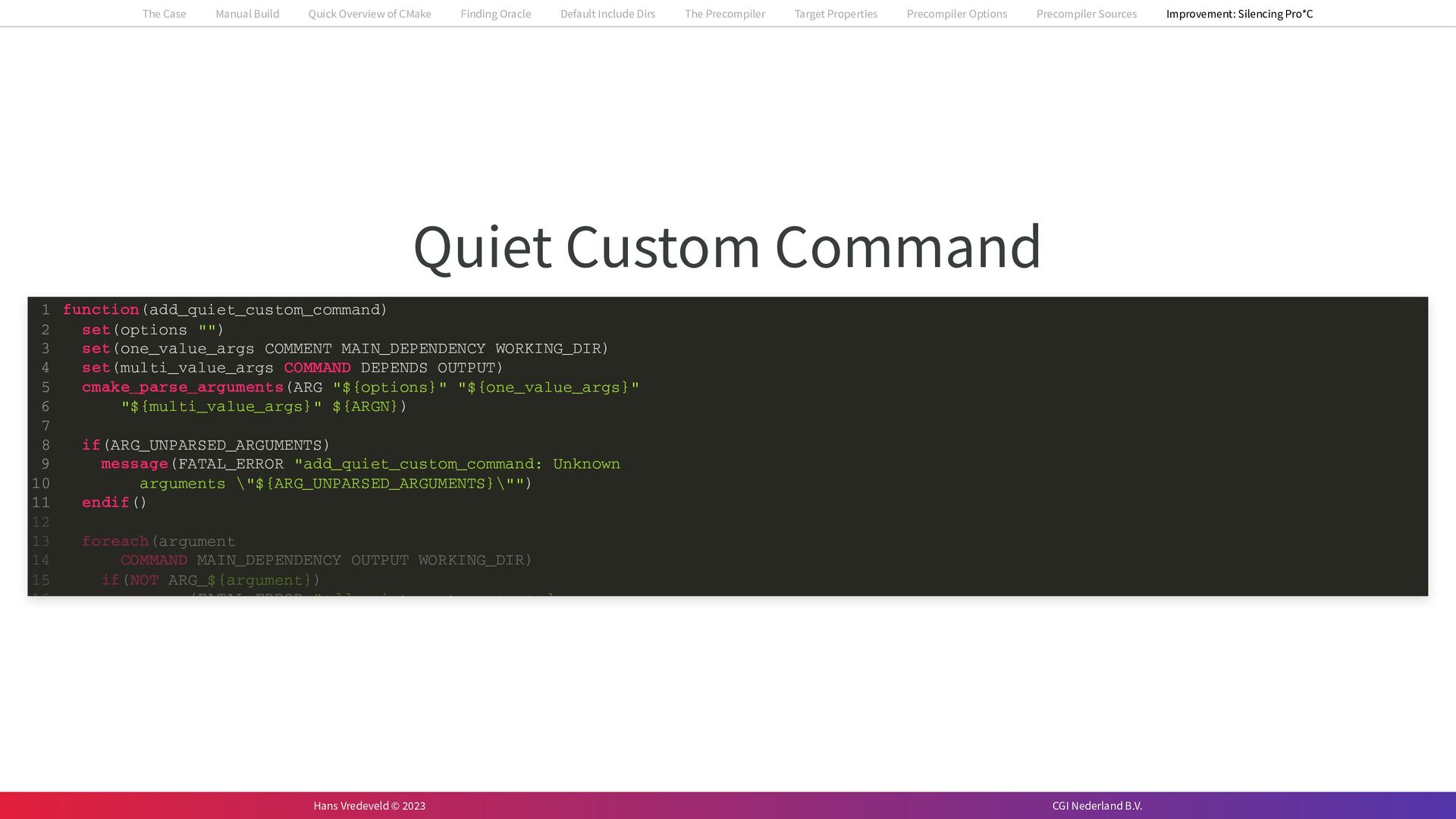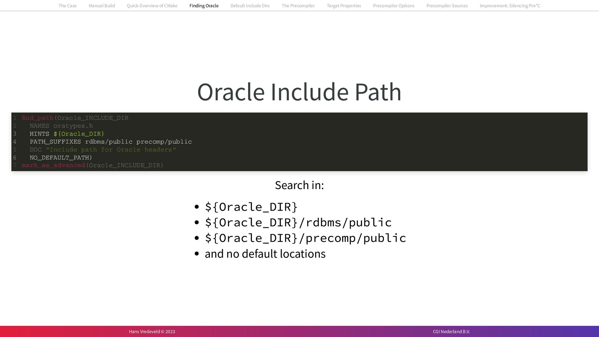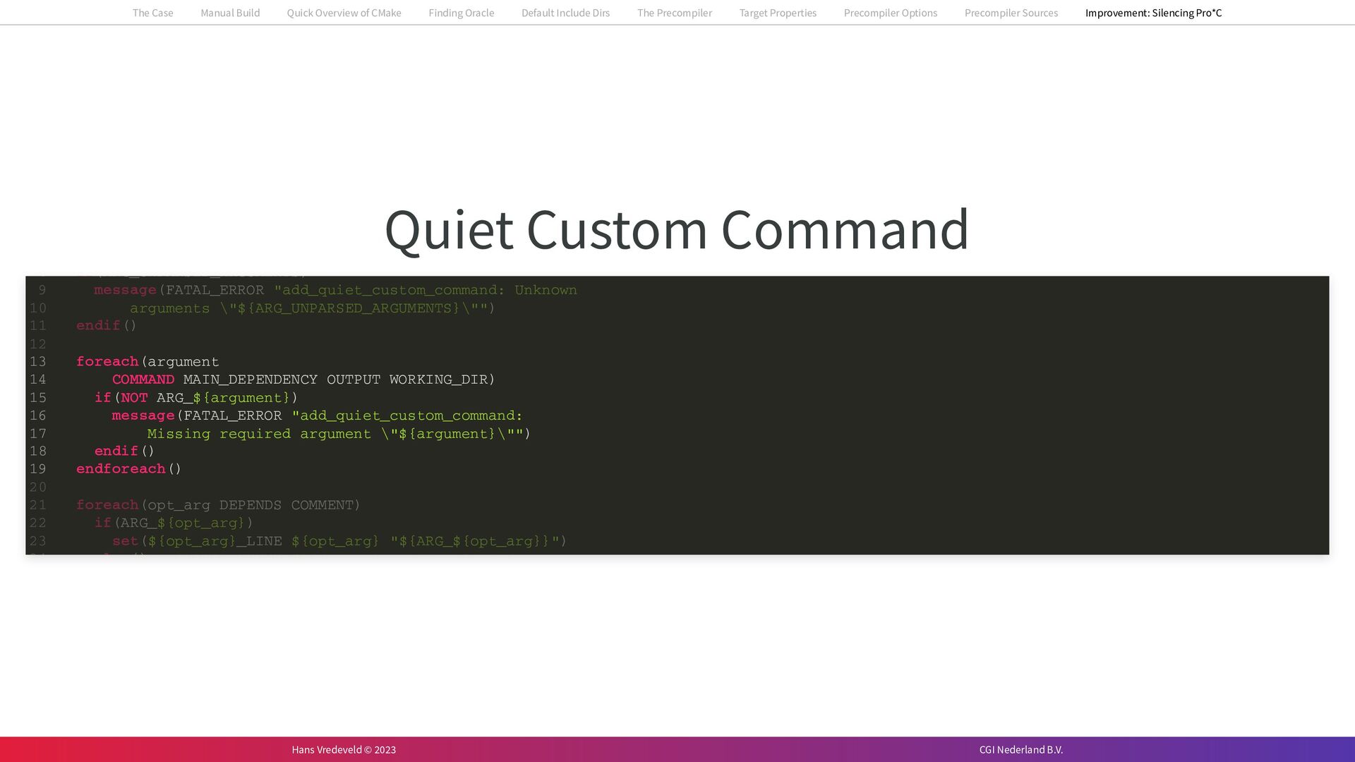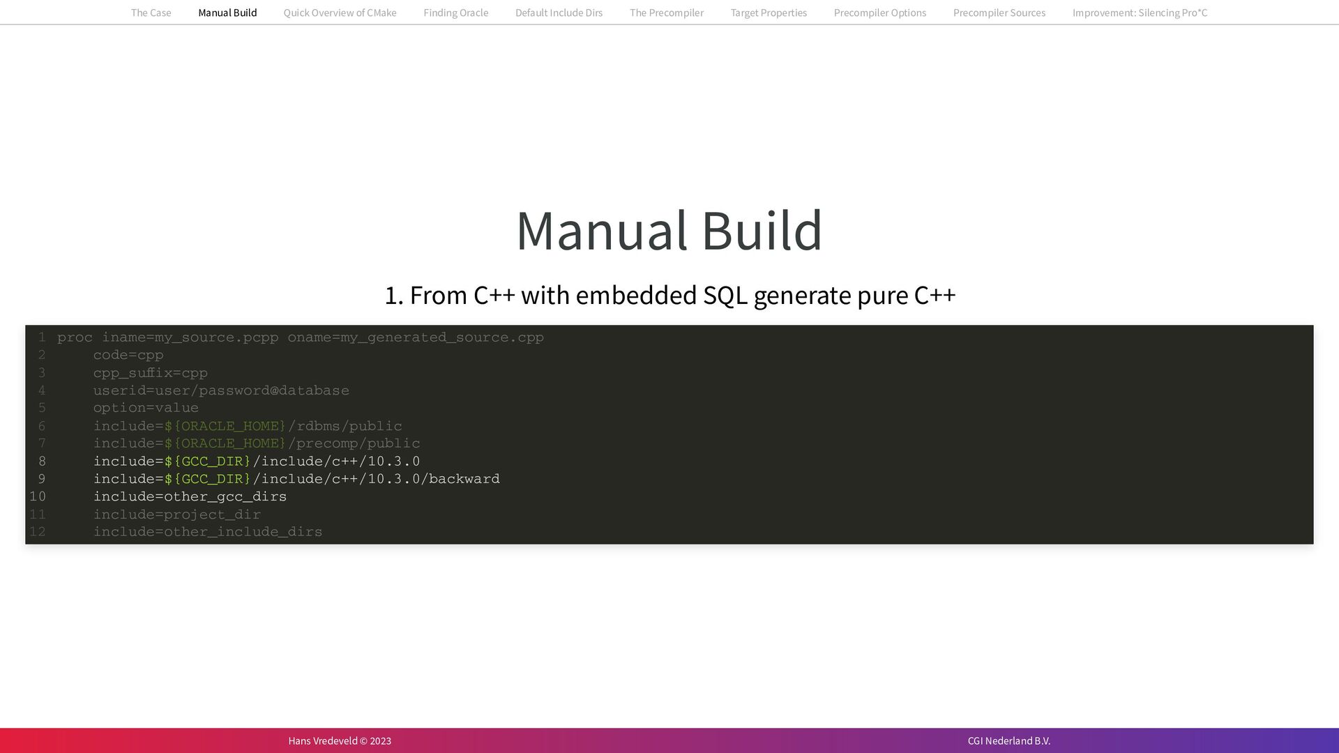 In the case study, we will look at a C++-application that uses embedded SQL to talk to an Oracle SQL-database. To build the application, it needs to link against Oracle’s client library and the files with embedded SQL need to be converted to pure C++ before they can be compiled. How can we find that library when there is no CMake module for it yet? (We write our own!) How can we execute Oracle’s preprocessor to convert files with embedded SQL in a structured way when there are tens, or hundreds, of those files, possibly spread over different CMake targets? Come to my talk and I will tell you.