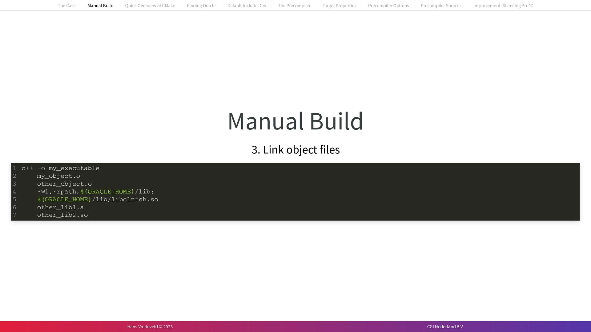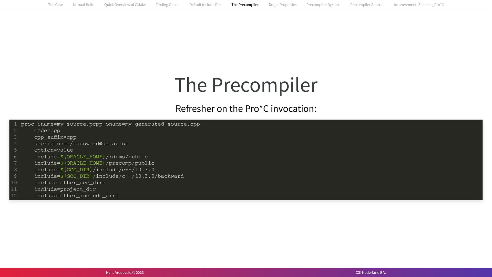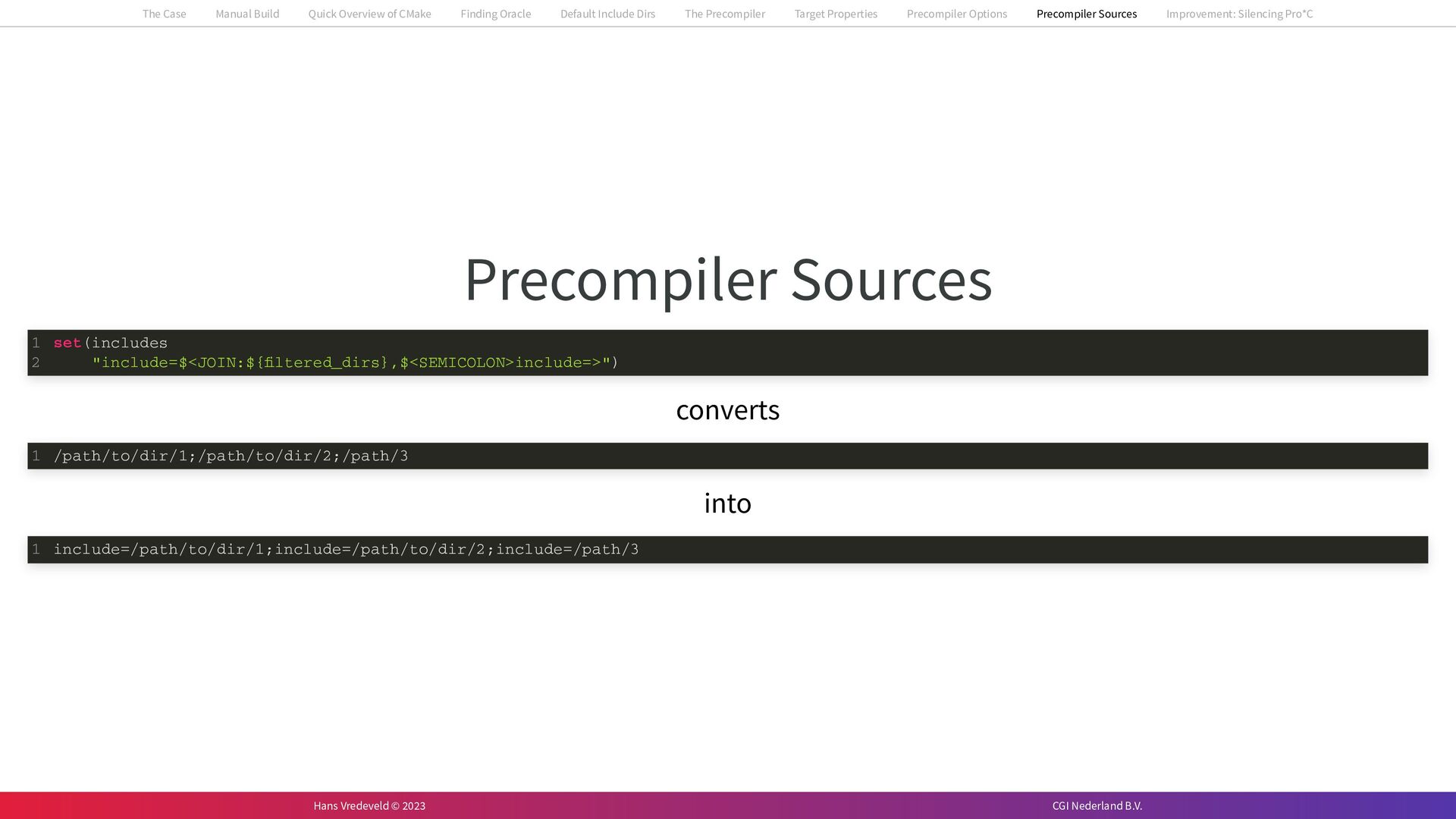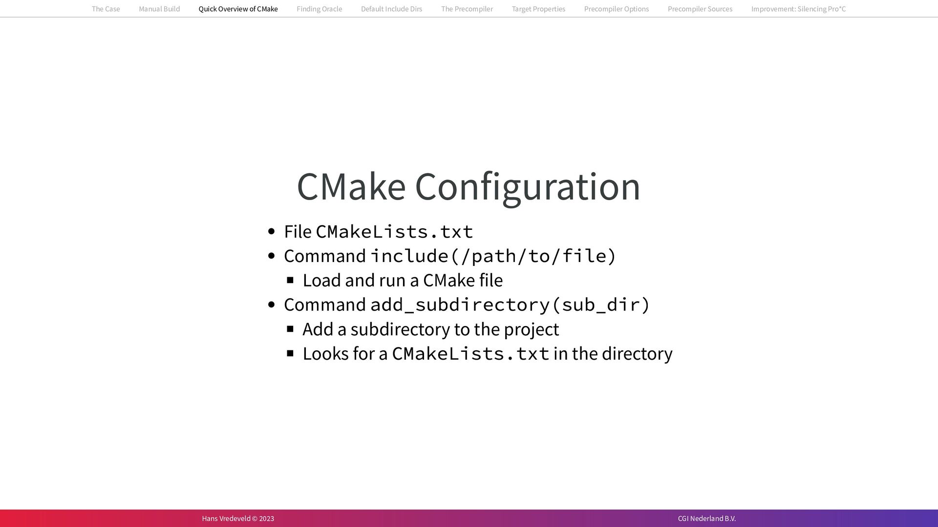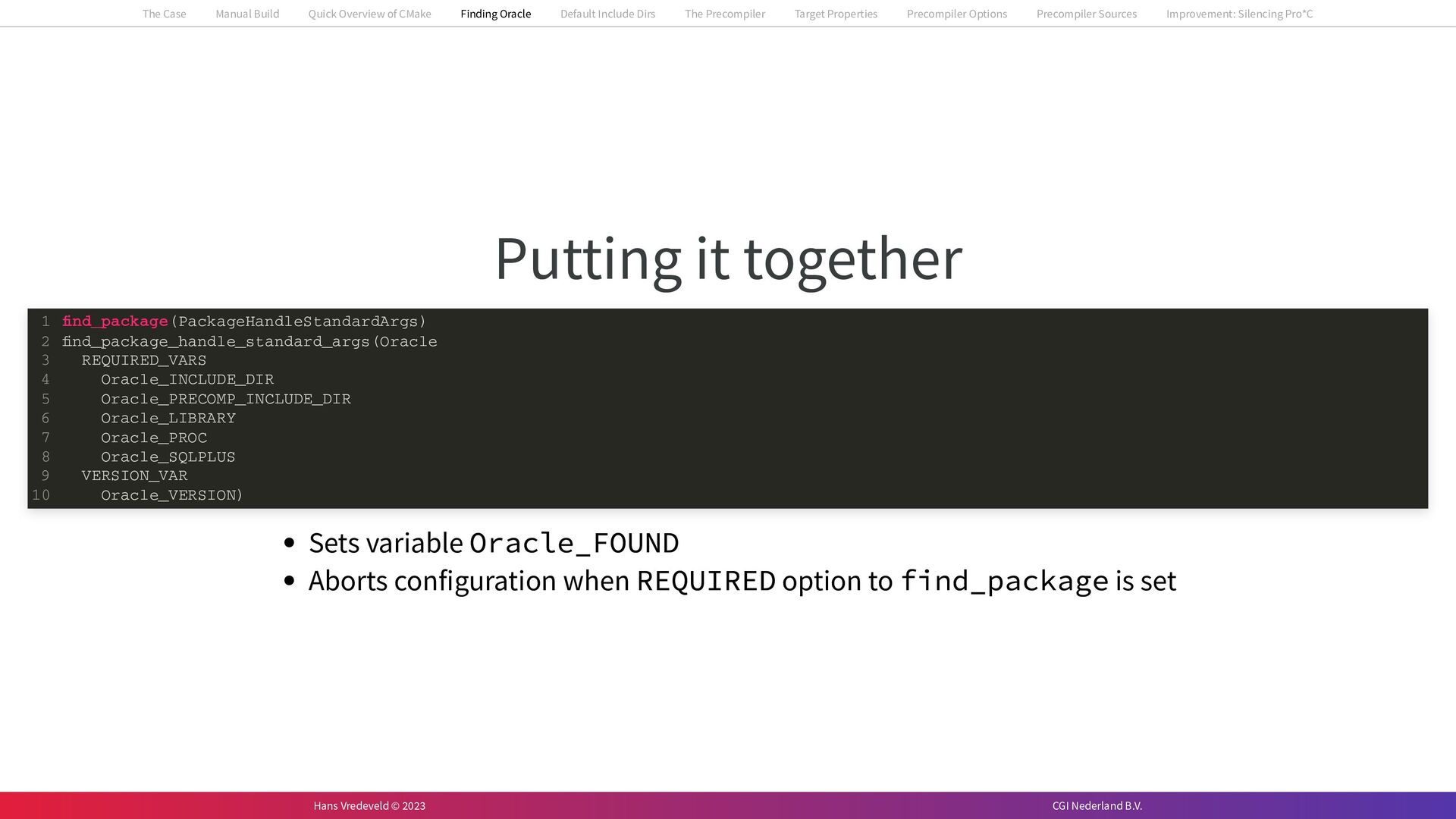 In the case study, we will look at a C++-application that uses embedded SQL to talk to an Oracle SQL-database. To build the application, it needs to link against Oracle’s client library and the files with embedded SQL need to be converted to pure C++ before they can be compiled. How can we find that library when there is no CMake module for it yet? (We write our own!) How can we execute Oracle’s preprocessor to convert files with embedded SQL in a structured way when there are tens, or hundreds, of those files, possibly spread over different CMake targets? Come to my talk and I will tell you.
