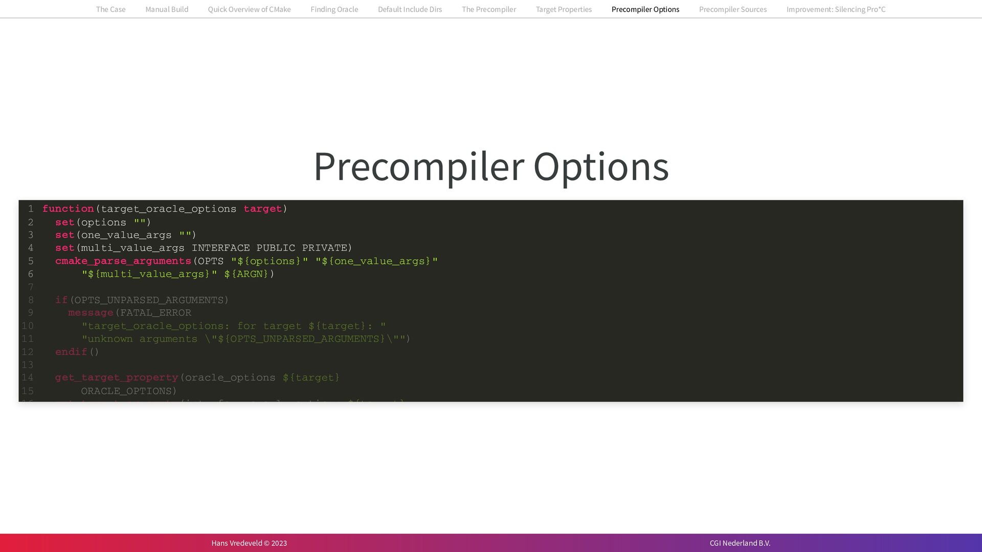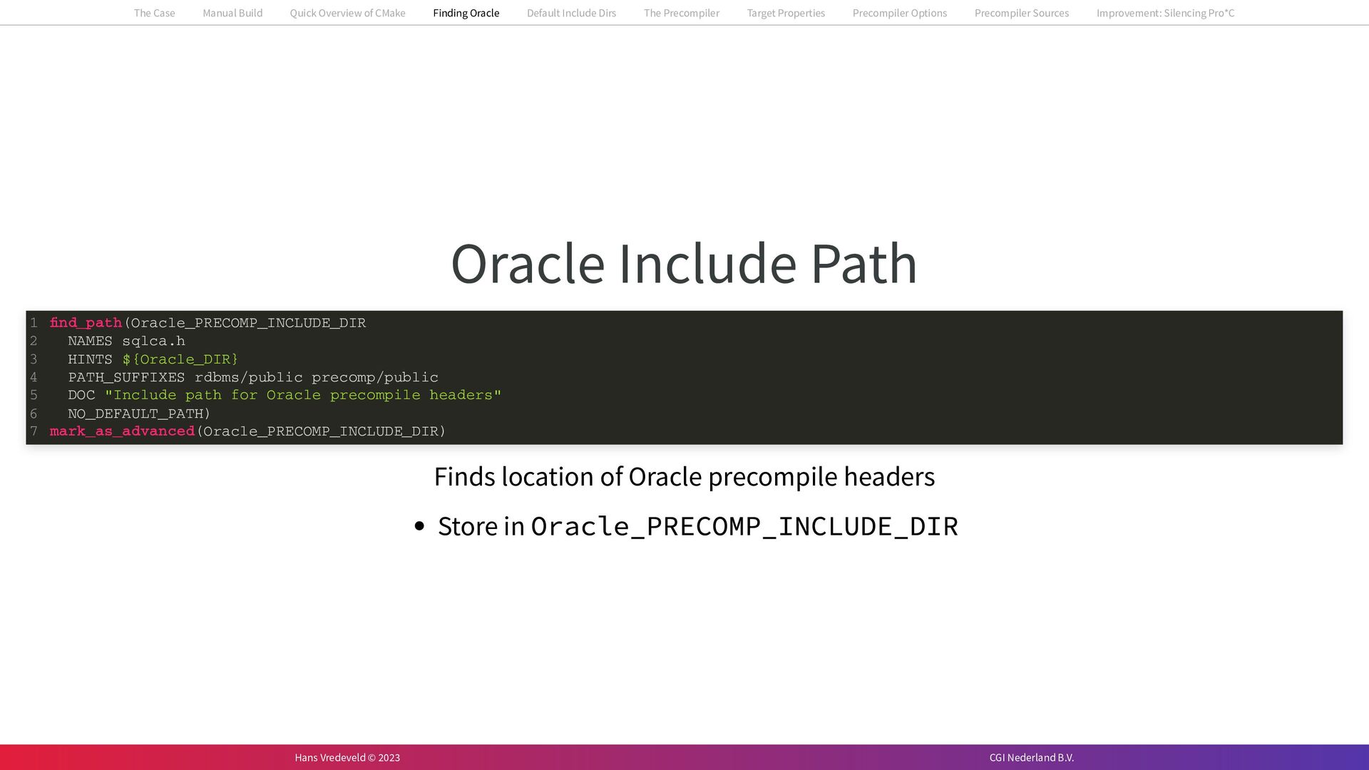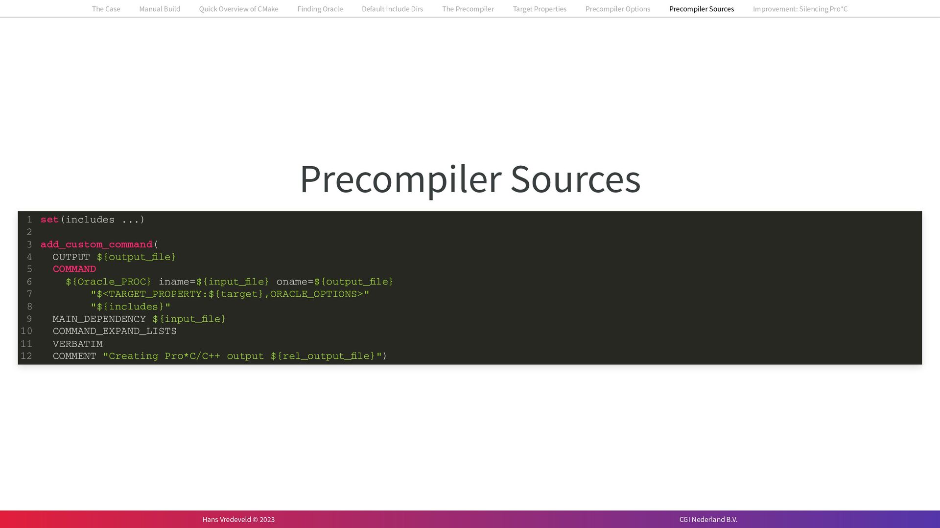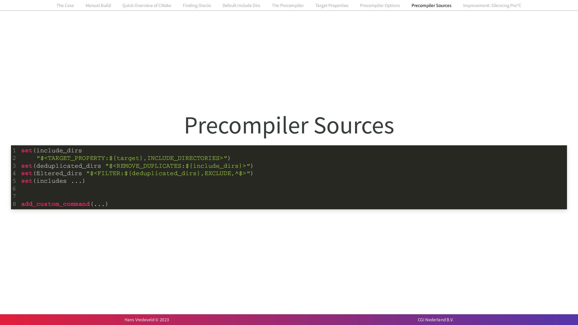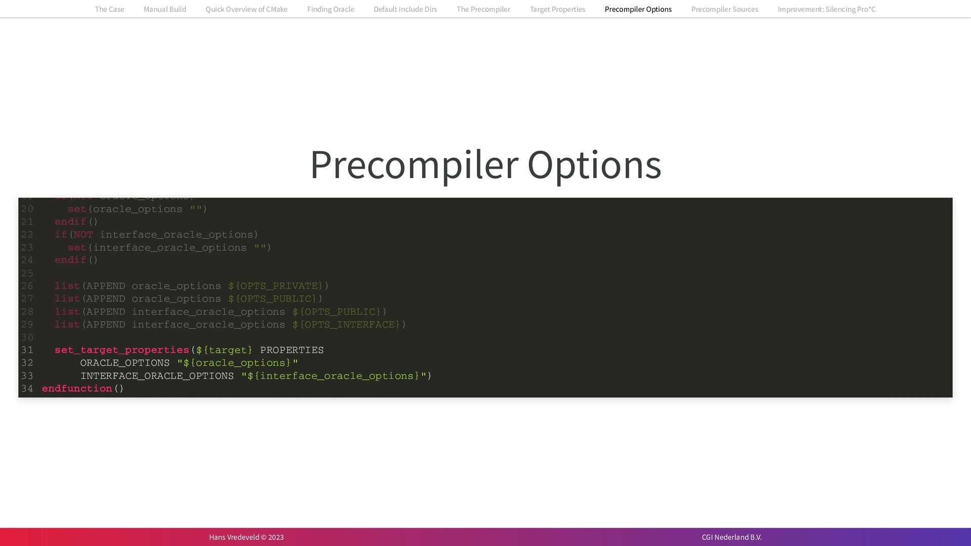 In the case study, we will look at a C++-application that uses embedded SQL to talk to an Oracle SQL-database. To build the application, it needs to link against Oracle’s client library and the files with embedded SQL need to be converted to pure C++ before they can be compiled. How can we find that library when there is no CMake module for it yet? (We write our own!) How can we execute Oracle’s preprocessor to convert files with embedded SQL in a structured way when there are tens, or hundreds, of those files, possibly spread over different CMake targets? Come to my talk and I will tell you.