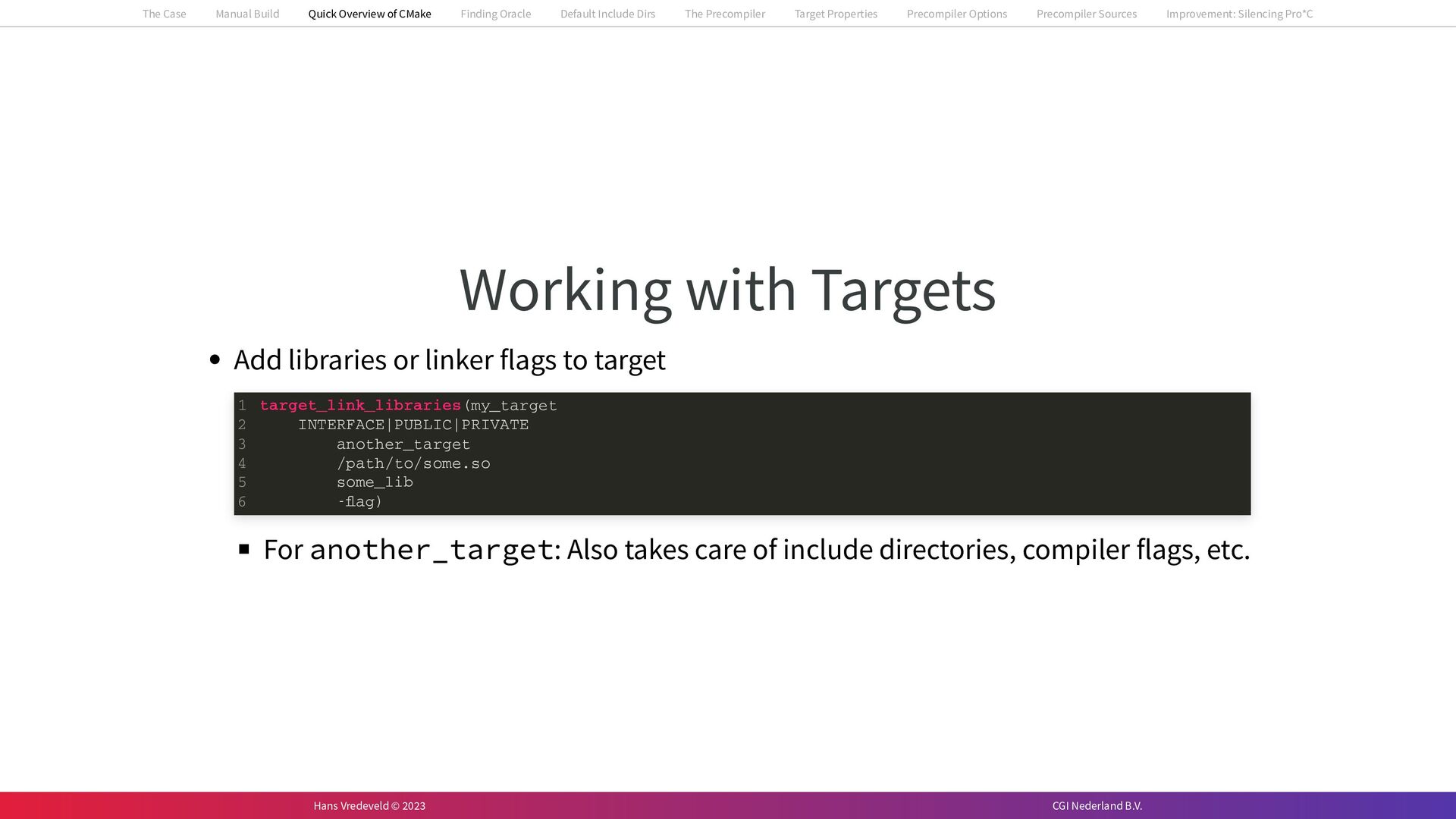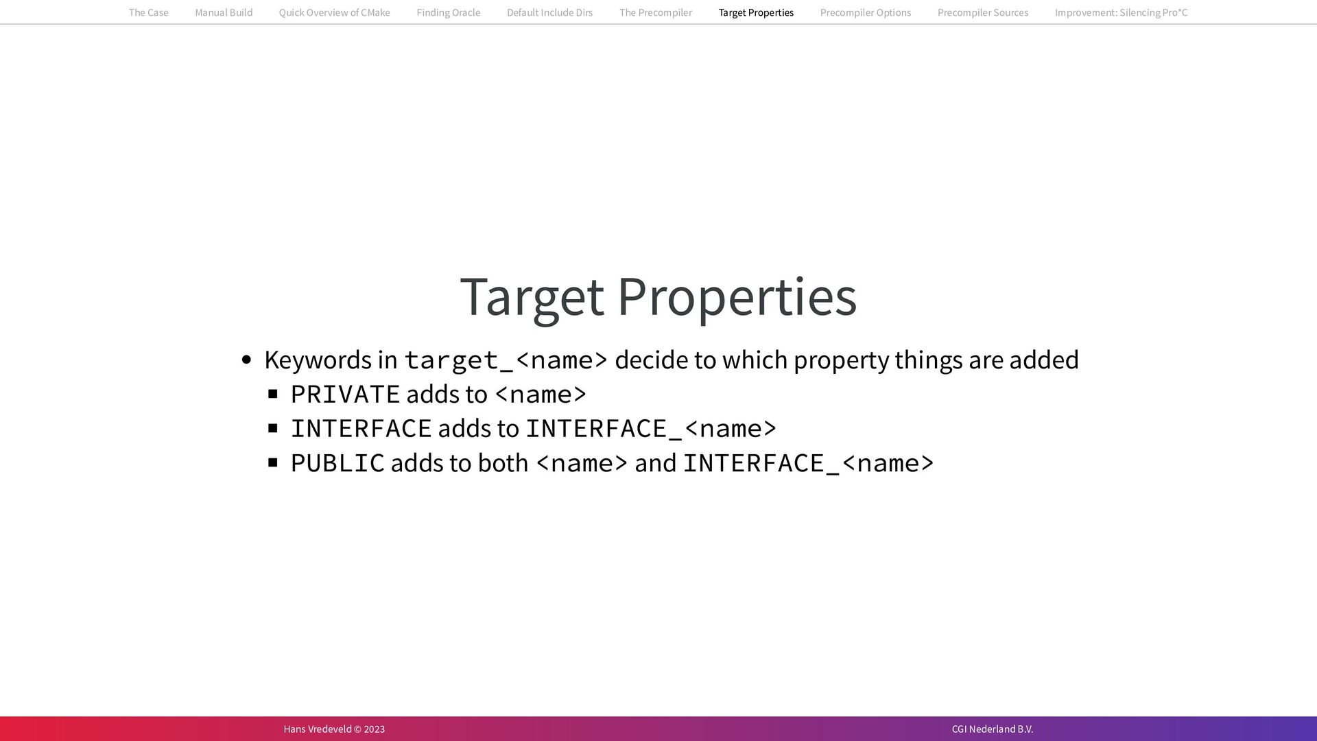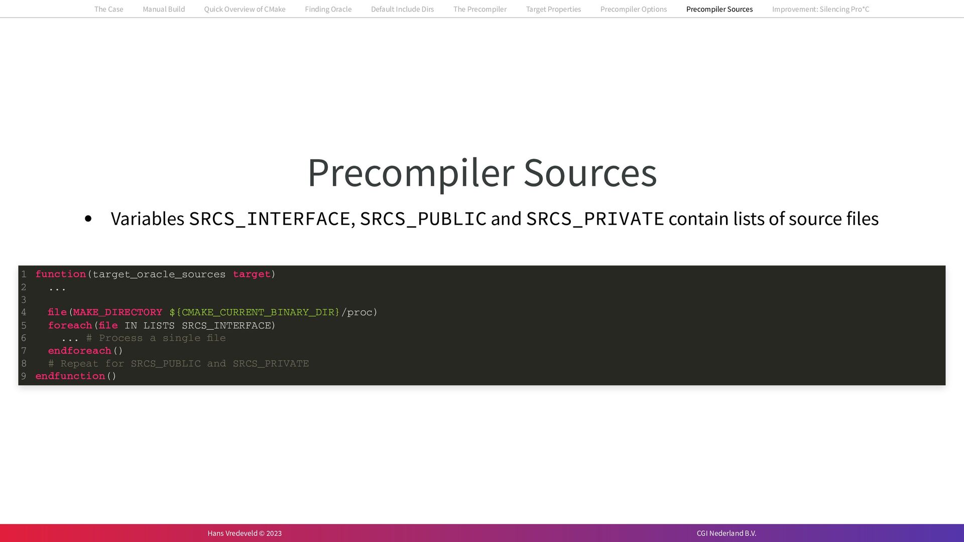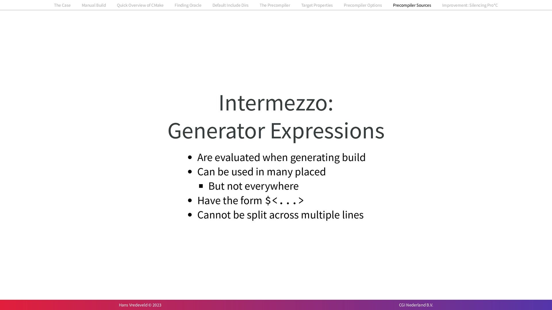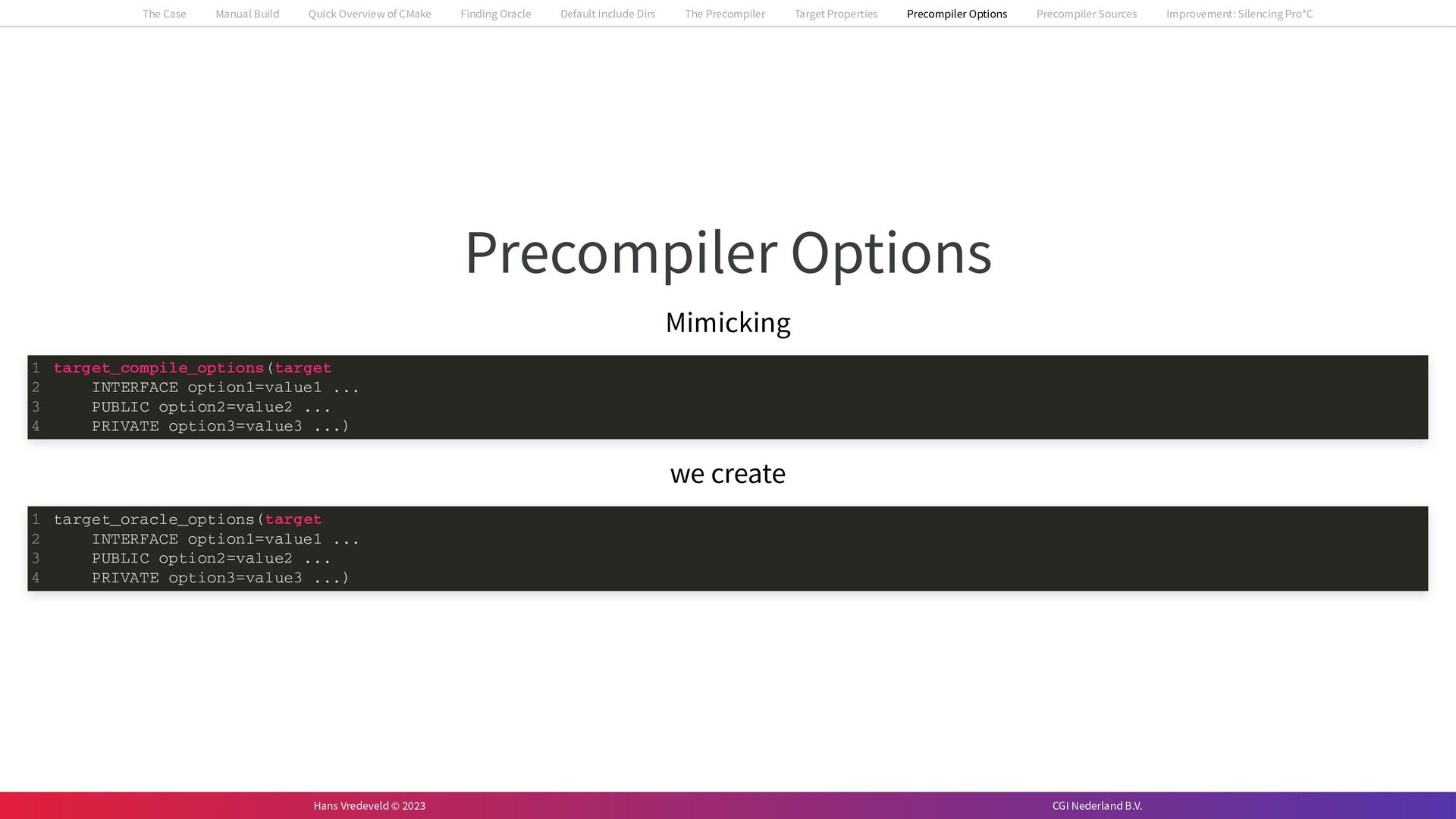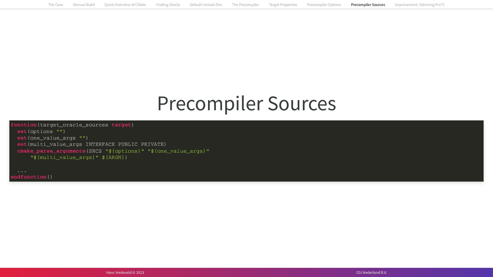 In the case study, we will look at a C++-application that uses embedded SQL to talk to an Oracle SQL-database. To build the application, it needs to link against Oracle’s client library and the files with embedded SQL need to be converted to pure C++ before they can be compiled. How can we find that library when there is no CMake module for it yet? (We write our own!) How can we execute Oracle’s preprocessor to convert files with embedded SQL in a structured way when there are tens, or hundreds, of those files, possibly spread over different CMake targets? Come to my talk and I will tell you.