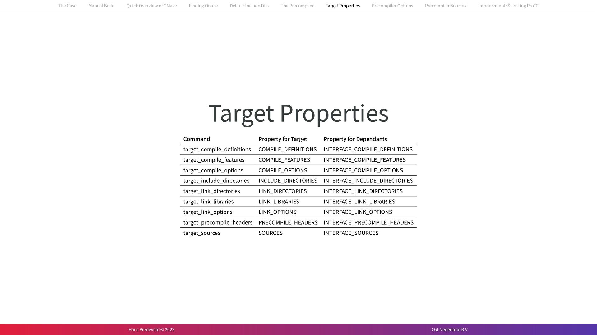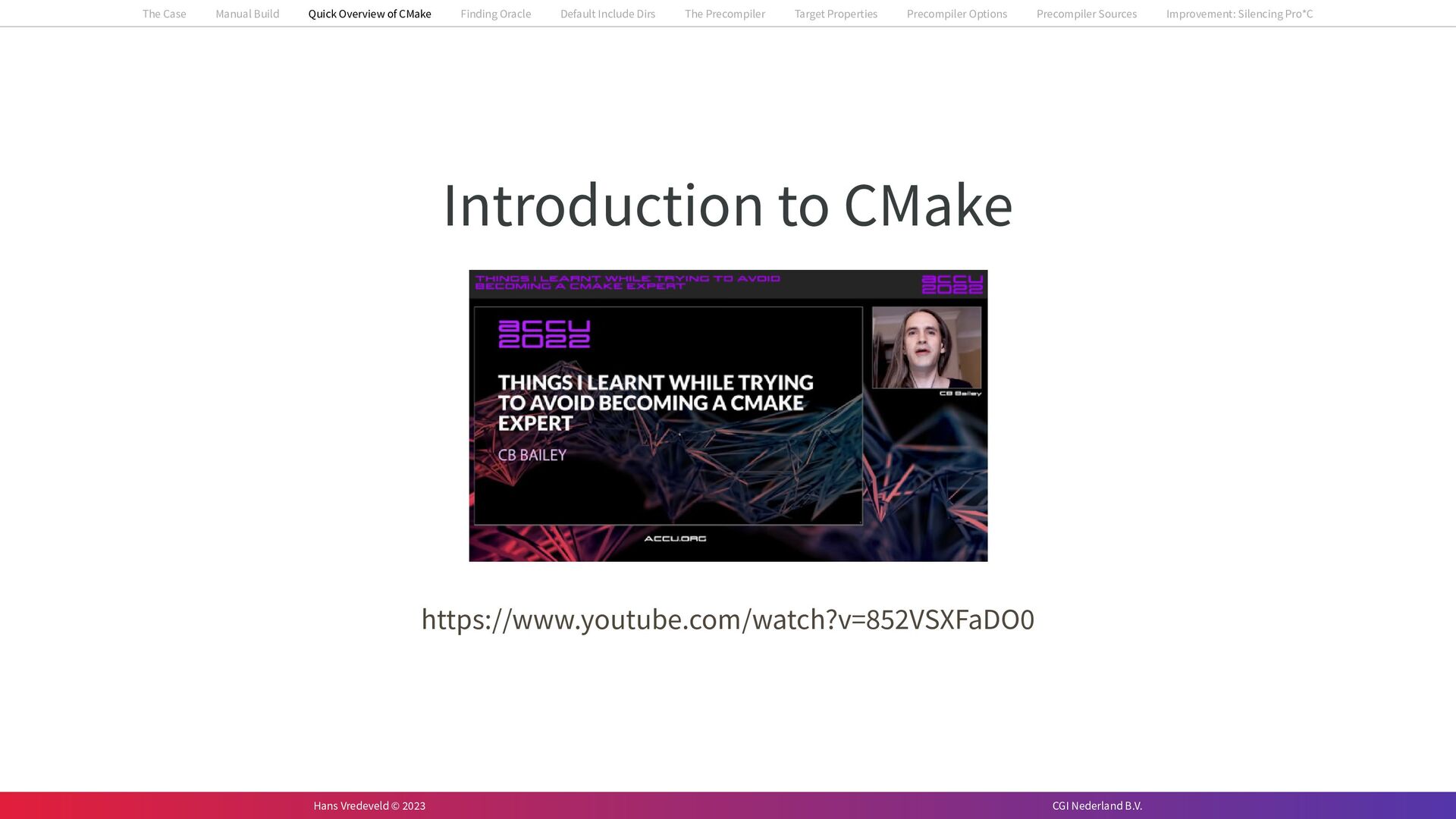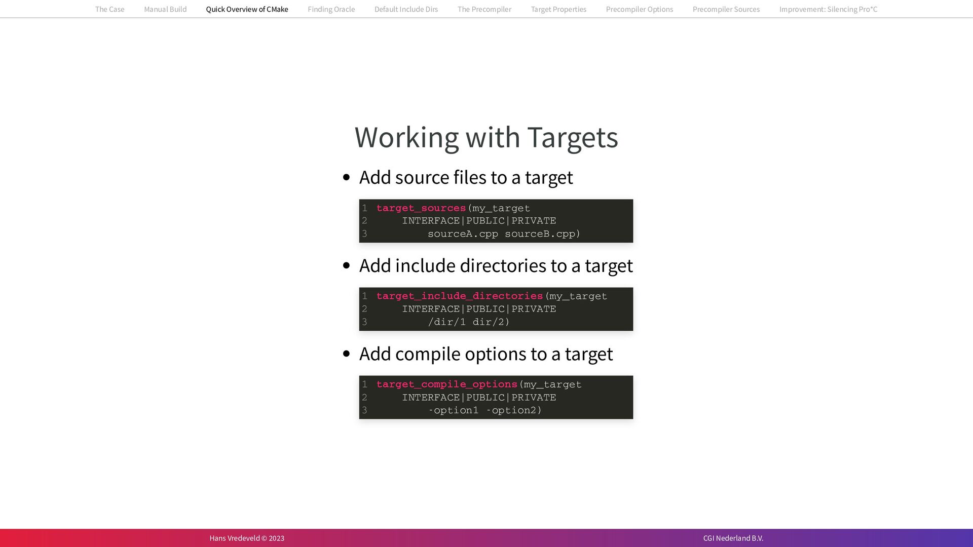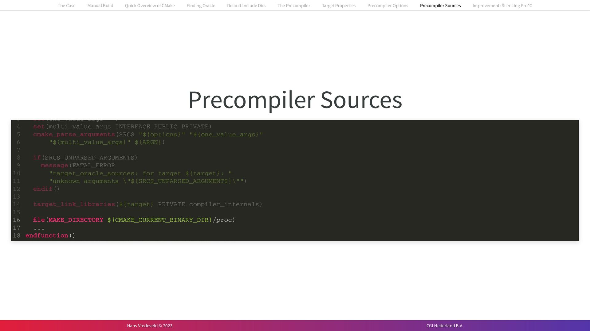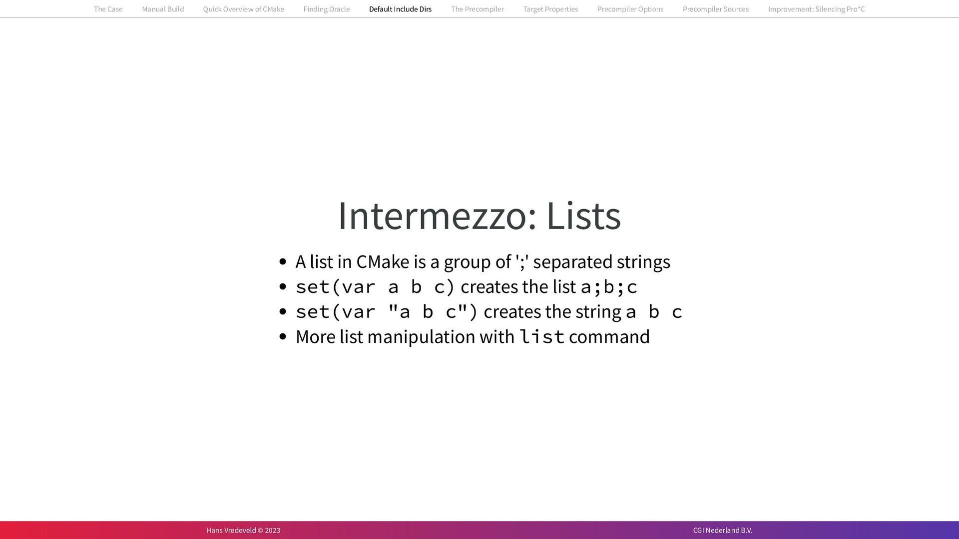 In the case study, we will look at a C++-application that uses embedded SQL to talk to an Oracle SQL-database. To build the application, it needs to link against Oracle’s client library and the files with embedded SQL need to be converted to pure C++ before they can be compiled. How can we find that library when there is no CMake module for it yet? (We write our own!) How can we execute Oracle’s preprocessor to convert files with embedded SQL in a structured way when there are tens, or hundreds, of those files, possibly spread over different CMake targets? Come to my talk and I will tell you.
