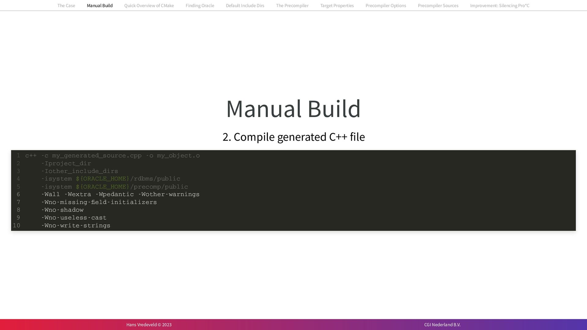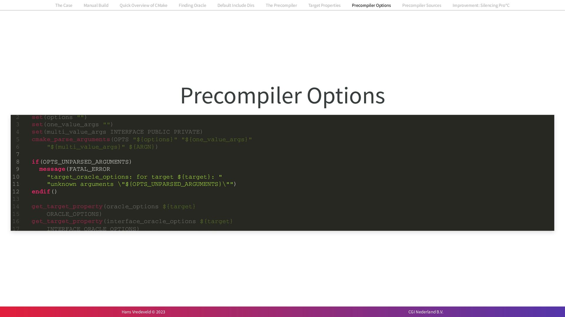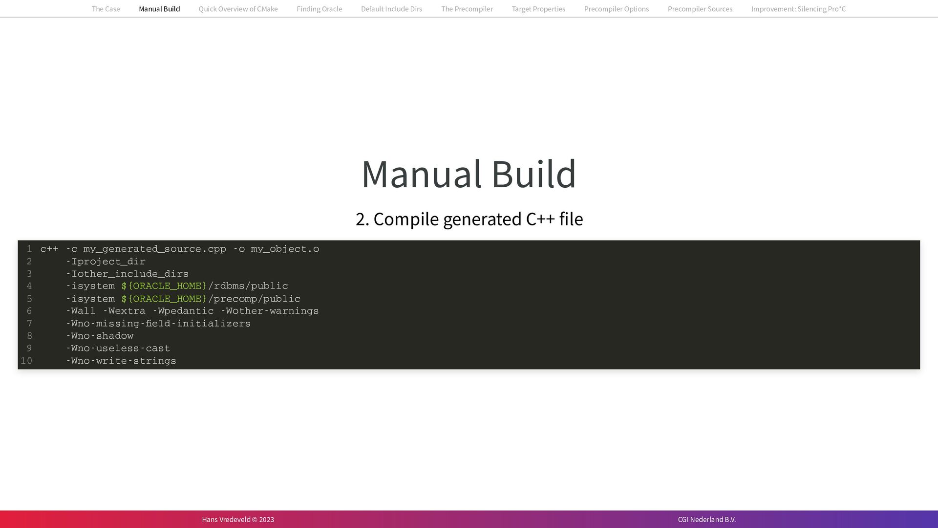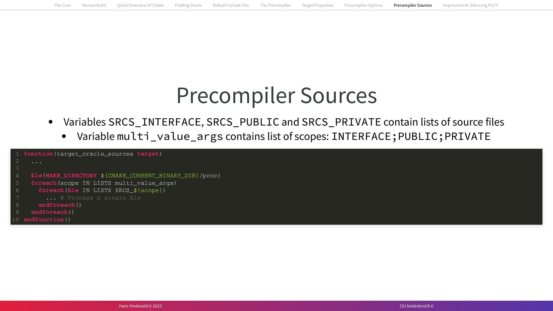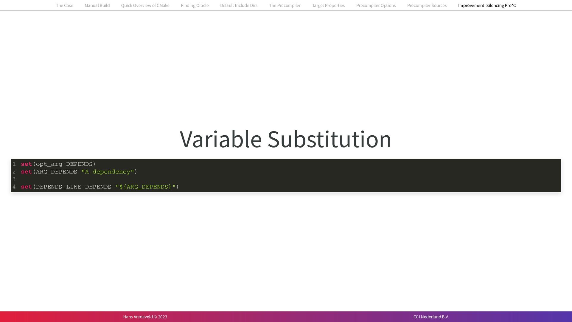 In the case study, we will look at a C++-application that uses embedded SQL to talk to an Oracle SQL-database. To build the application, it needs to link against Oracle’s client library and the files with embedded SQL need to be converted to pure C++ before they can be compiled. How can we find that library when there is no CMake module for it yet? (We write our own!) How can we execute Oracle’s preprocessor to convert files with embedded SQL in a structured way when there are tens, or hundreds, of those files, possibly spread over different CMake targets? Come to my talk and I will tell you.