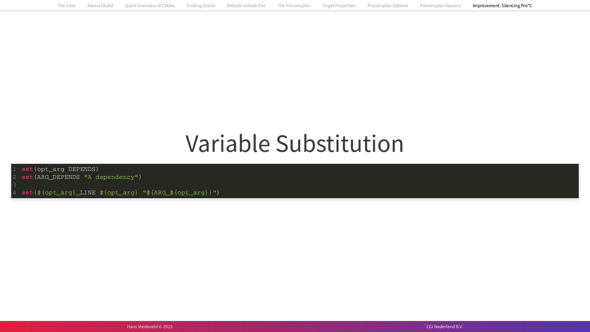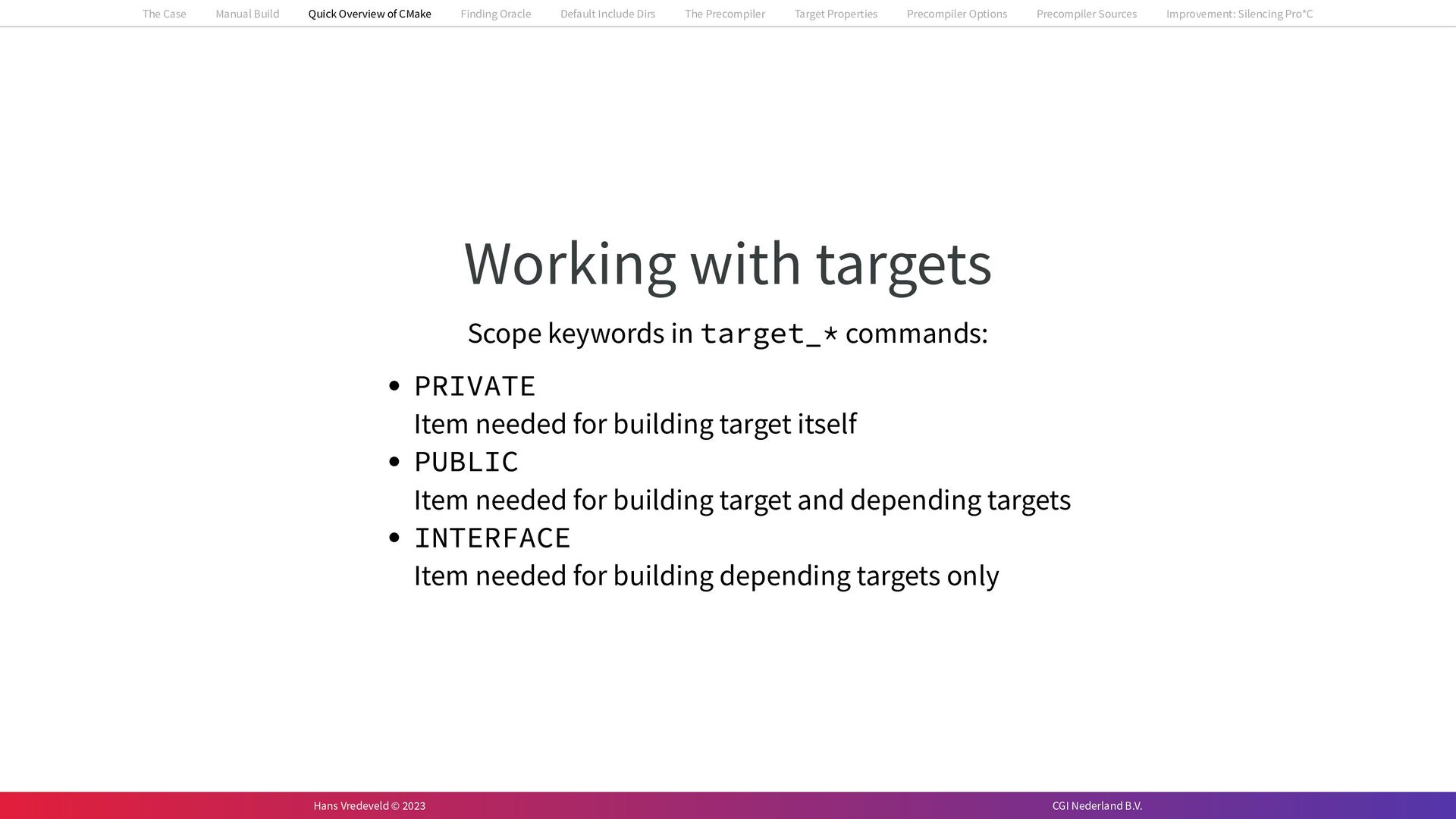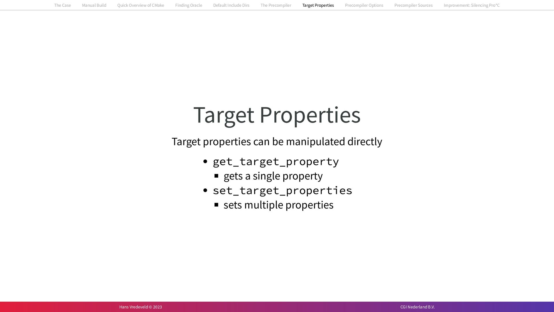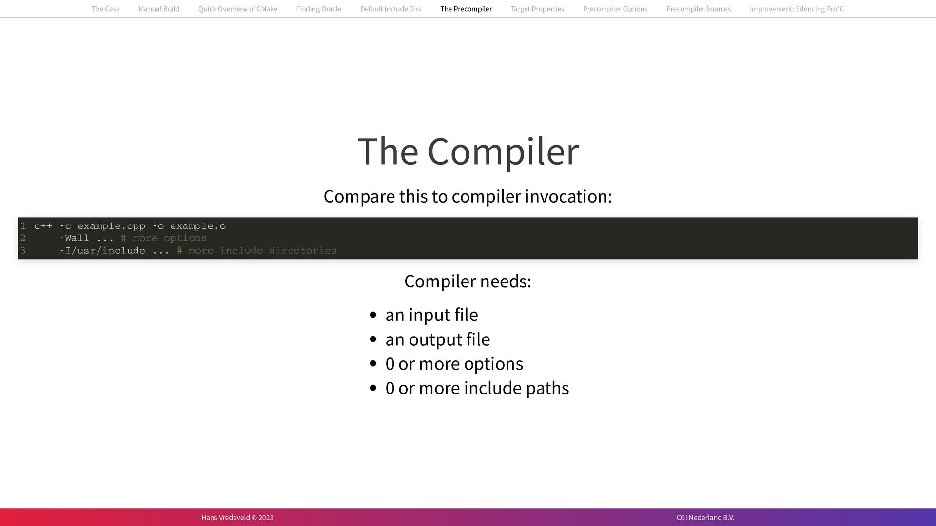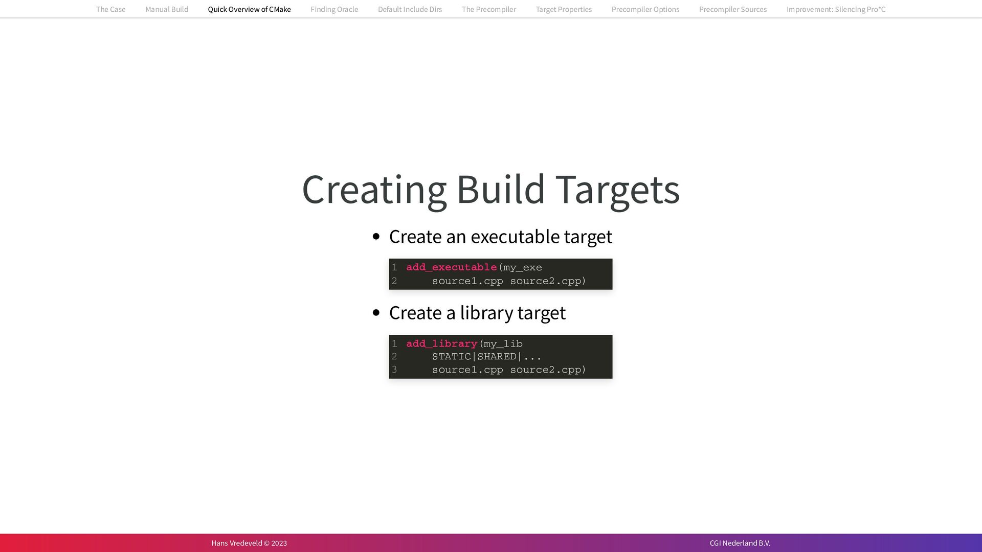 In the case study, we will look at a C++-application that uses embedded SQL to talk to an Oracle SQL-database. To build the application, it needs to link against Oracle’s client library and the files with embedded SQL need to be converted to pure C++ before they can be compiled. How can we find that library when there is no CMake module for it yet? (We write our own!) How can we execute Oracle’s preprocessor to convert files with embedded SQL in a structured way when there are tens, or hundreds, of those files, possibly spread over different CMake targets? Come to my talk and I will tell you.