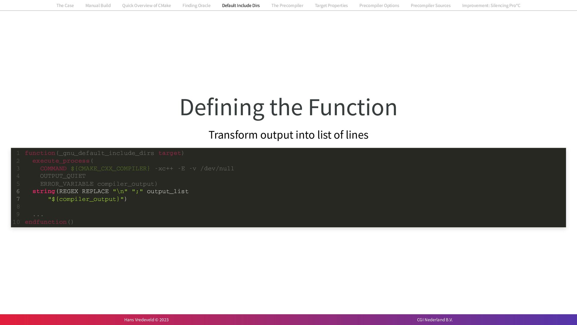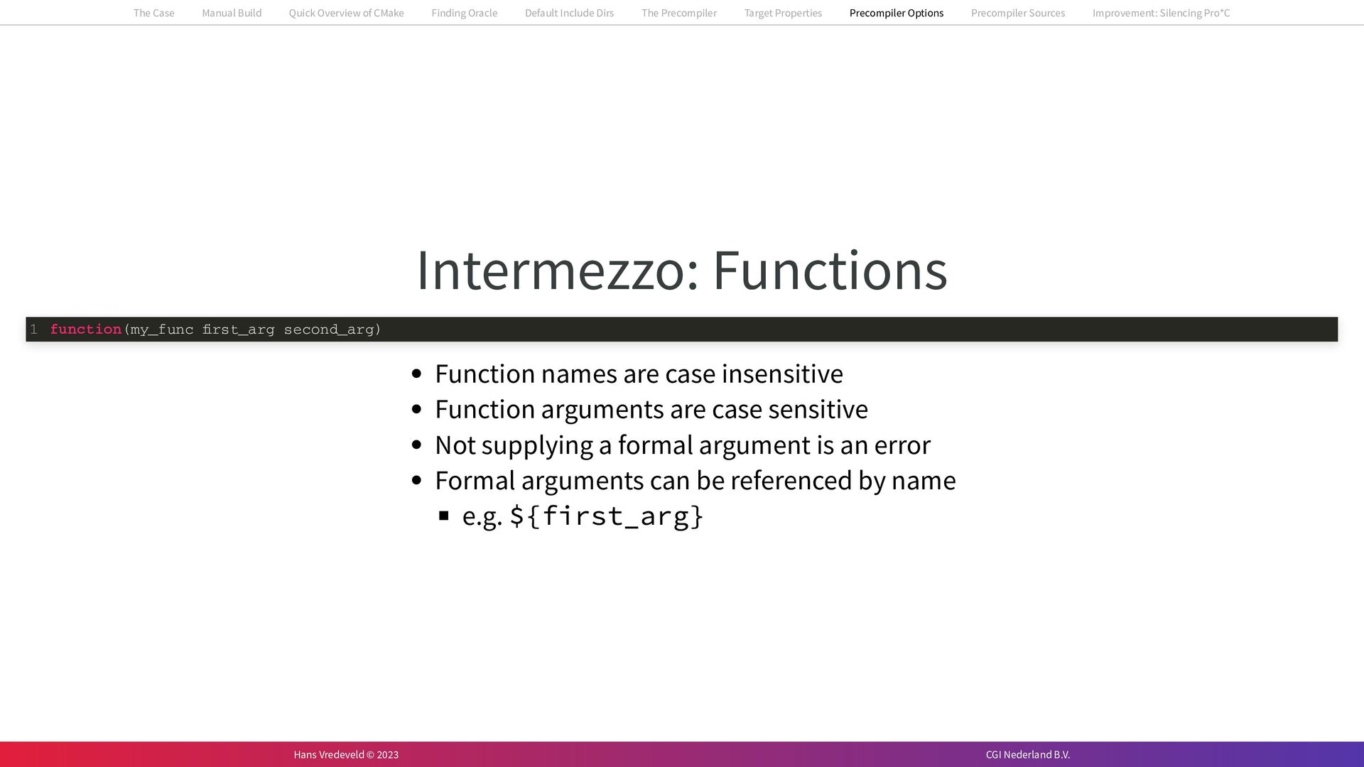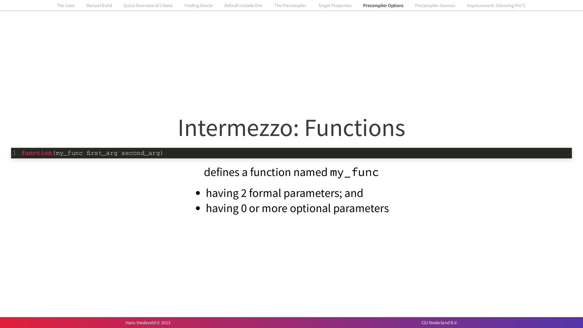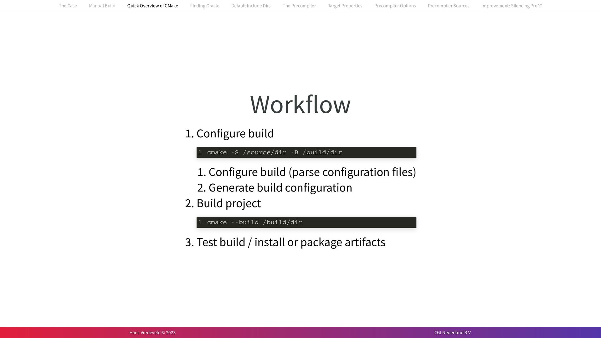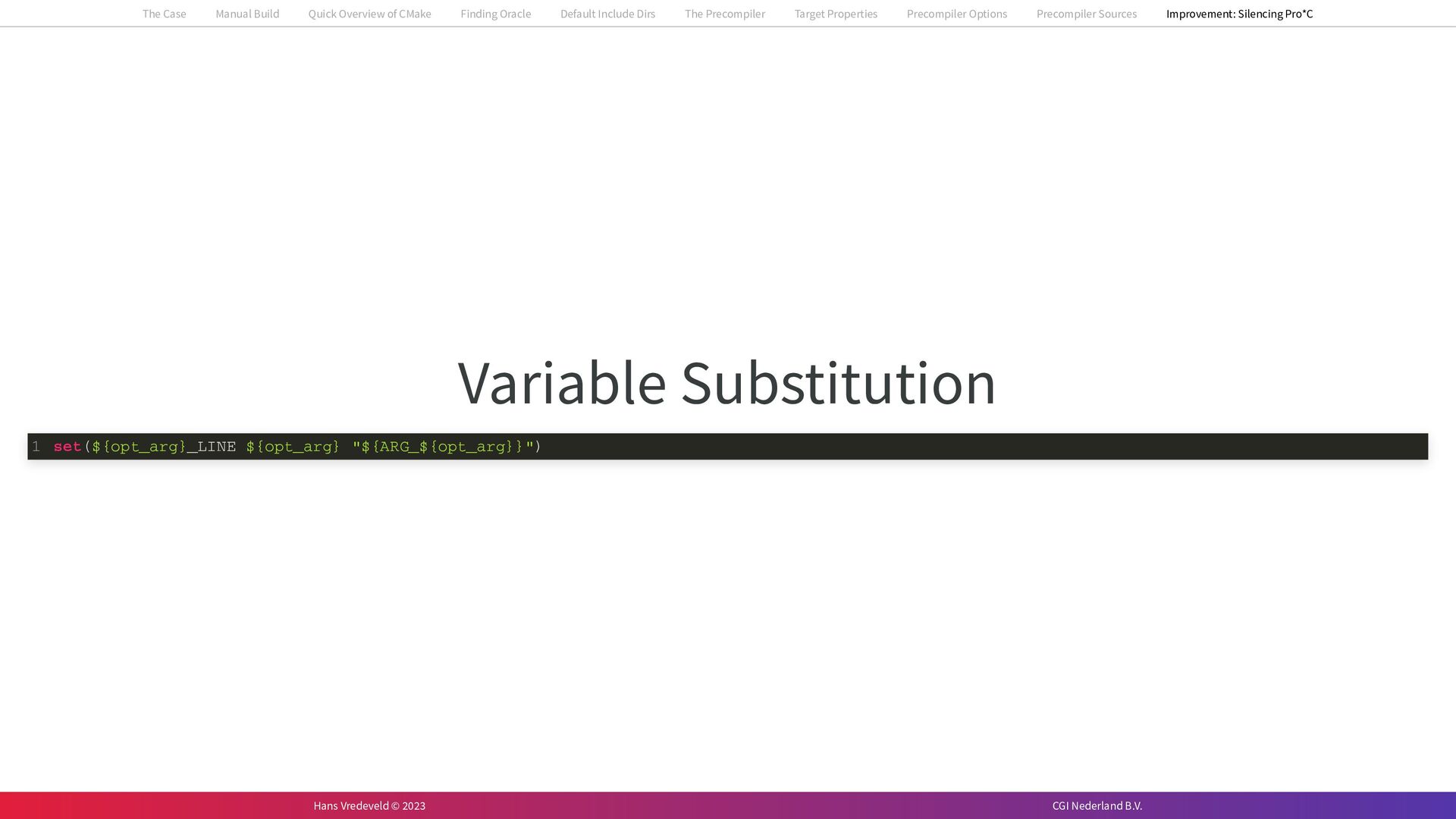 In the case study, we will look at a C++-application that uses embedded SQL to talk to an Oracle SQL-database. To build the application, it needs to link against Oracle’s client library and the files with embedded SQL need to be converted to pure C++ before they can be compiled. How can we find that library when there is no CMake module for it yet? (We write our own!) How can we execute Oracle’s preprocessor to convert files with embedded SQL in a structured way when there are tens, or hundreds, of those files, possibly spread over different CMake targets? Come to my talk and I will tell you.