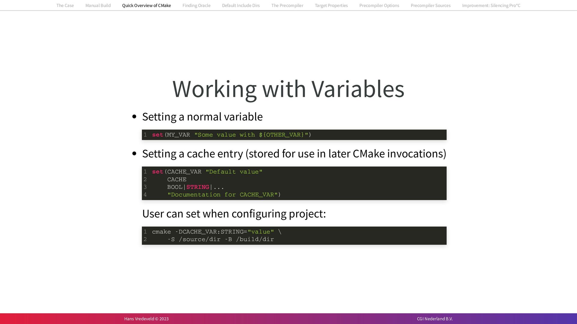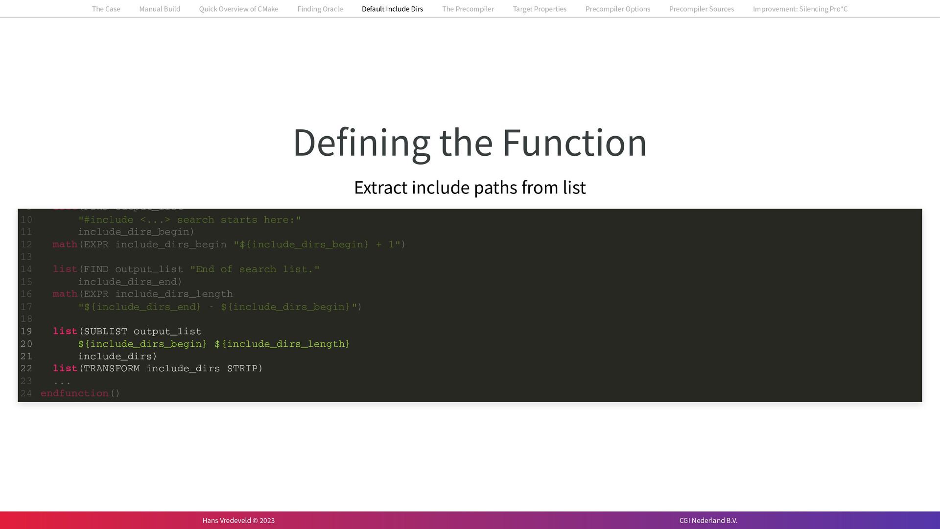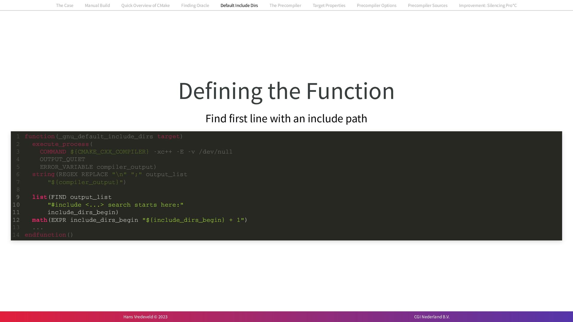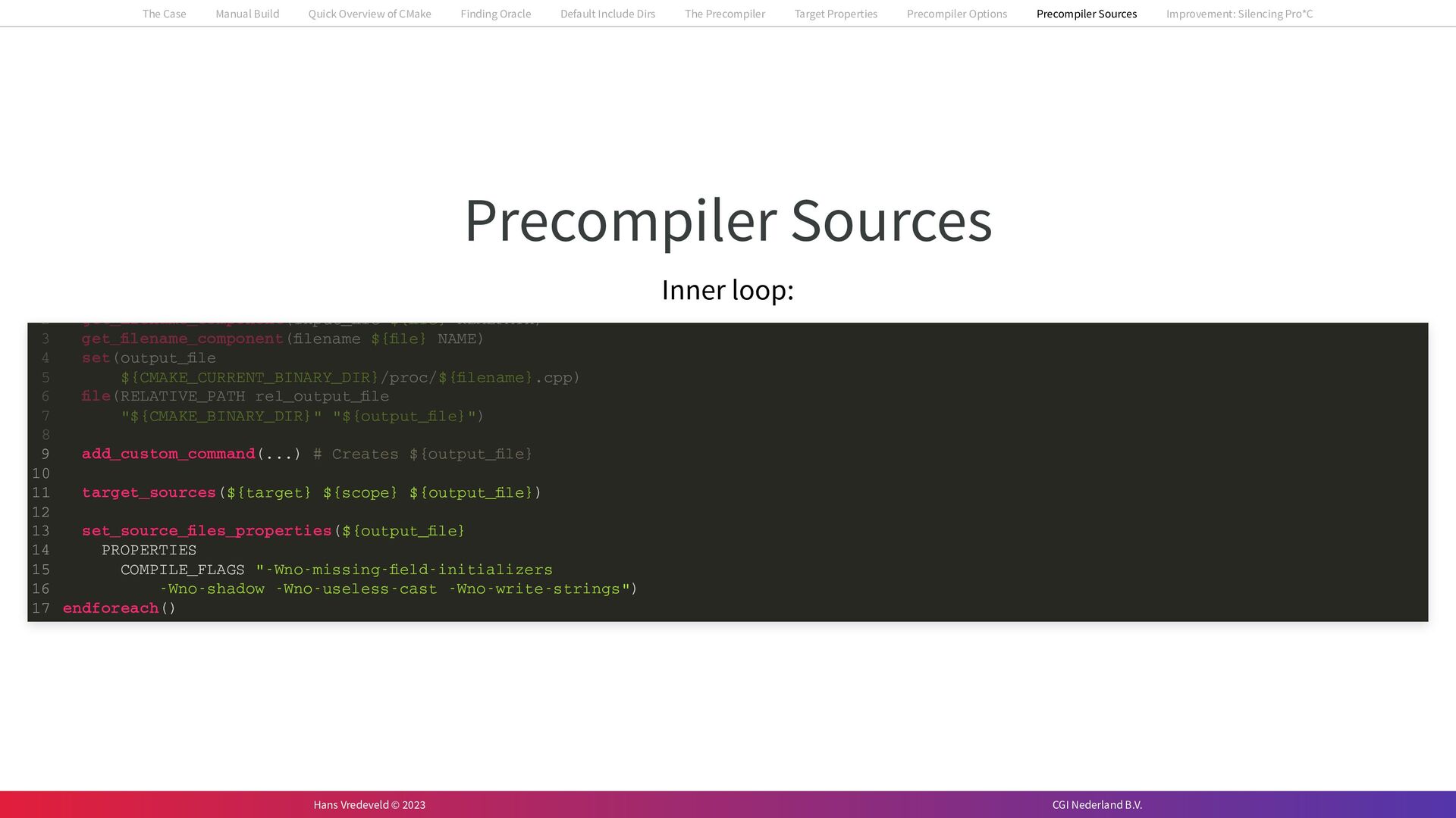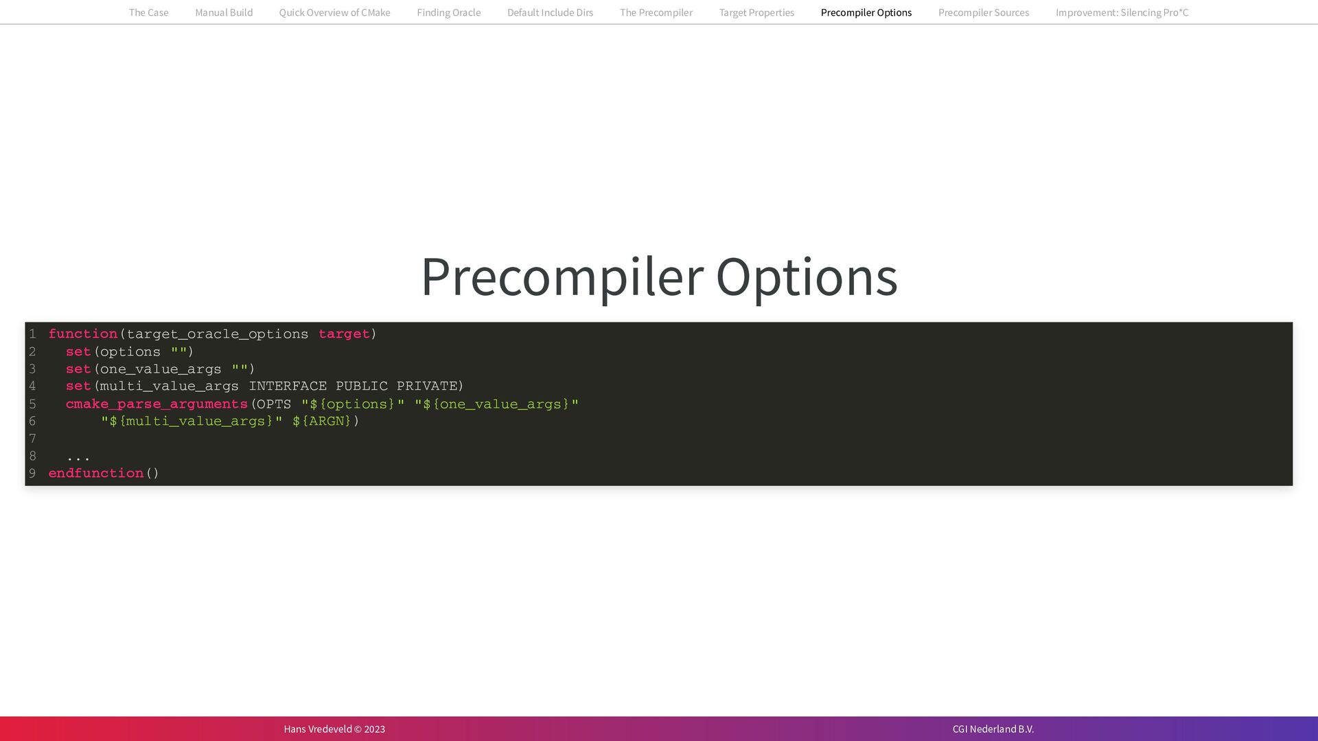 In the case study, we will look at a C++-application that uses embedded SQL to talk to an Oracle SQL-database. To build the application, it needs to link against Oracle’s client library and the files with embedded SQL need to be converted to pure C++ before they can be compiled. How can we find that library when there is no CMake module for it yet? (We write our own!) How can we execute Oracle’s preprocessor to convert files with embedded SQL in a structured way when there are tens, or hundreds, of those files, possibly spread over different CMake targets? Come to my talk and I will tell you.