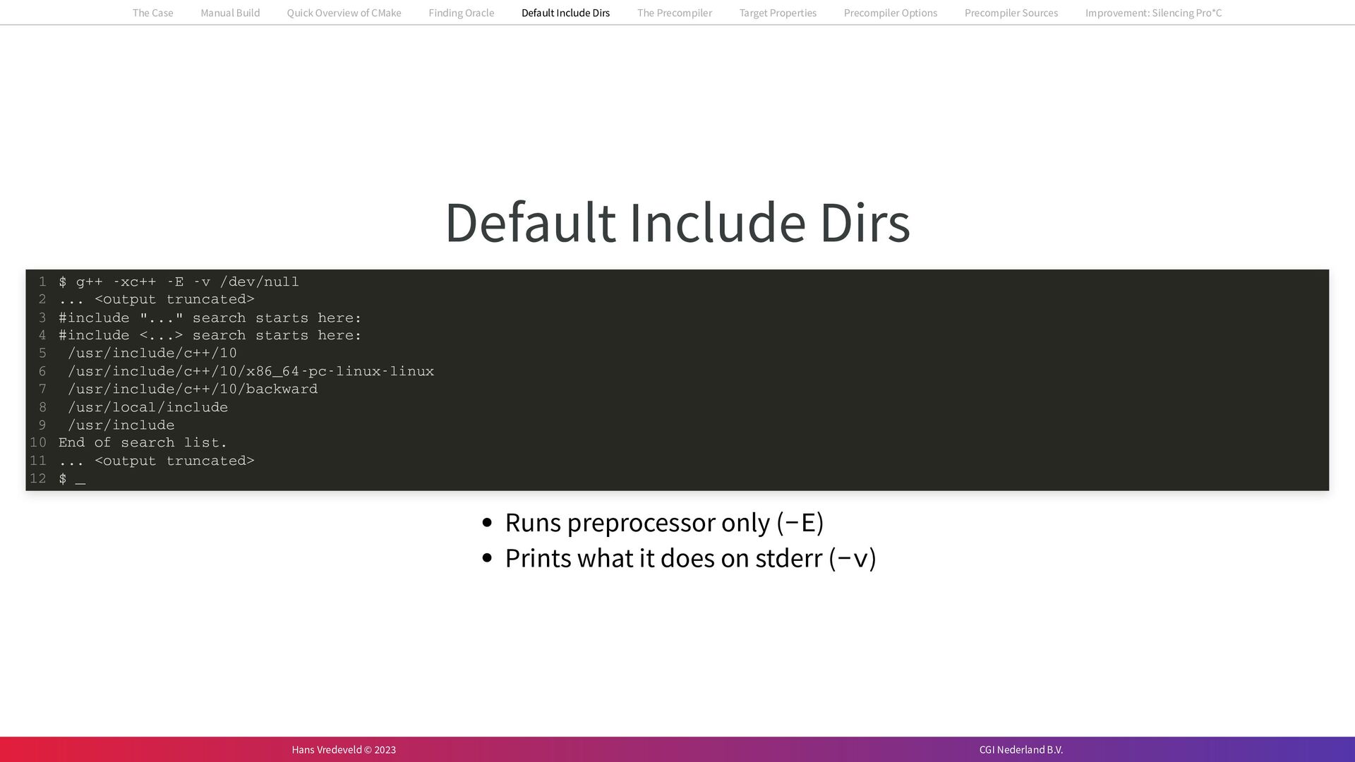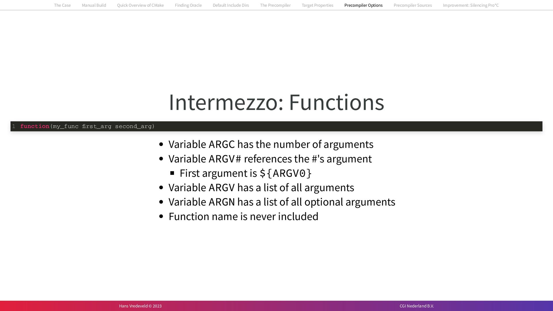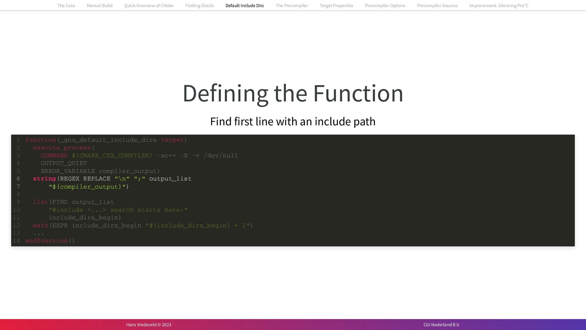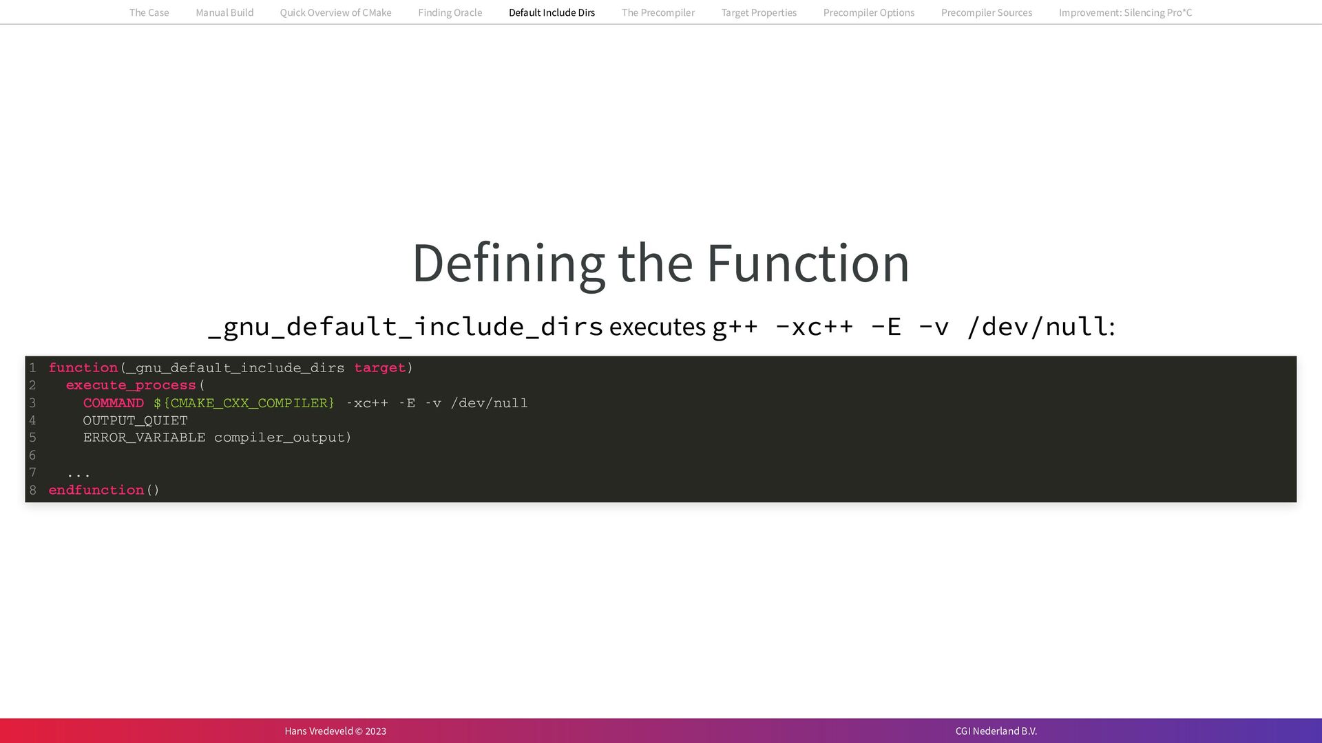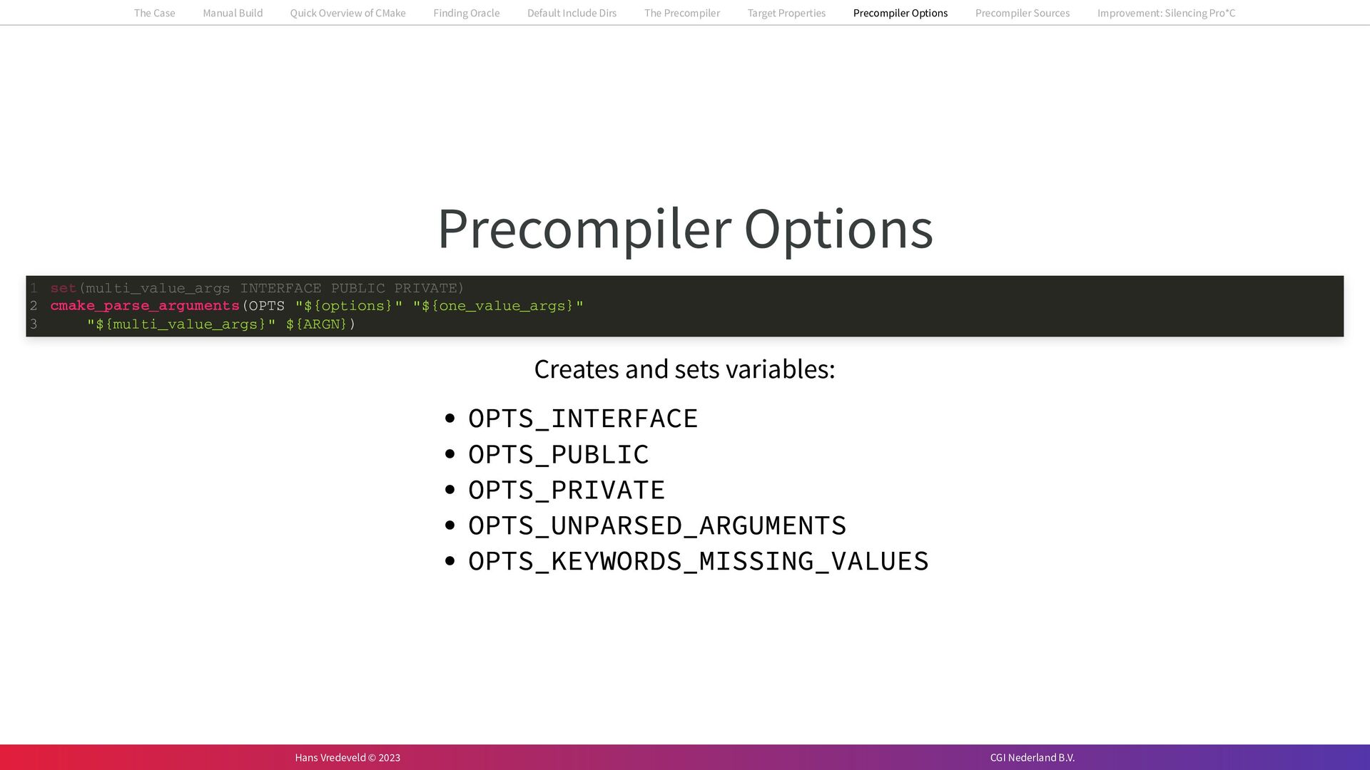 In the case study, we will look at a C++-application that uses embedded SQL to talk to an Oracle SQL-database. To build the application, it needs to link against Oracle’s client library and the files with embedded SQL need to be converted to pure C++ before they can be compiled. How can we find that library when there is no CMake module for it yet? (We write our own!) How can we execute Oracle’s preprocessor to convert files with embedded SQL in a structured way when there are tens, or hundreds, of those files, possibly spread over different CMake targets? Come to my talk and I will tell you.
