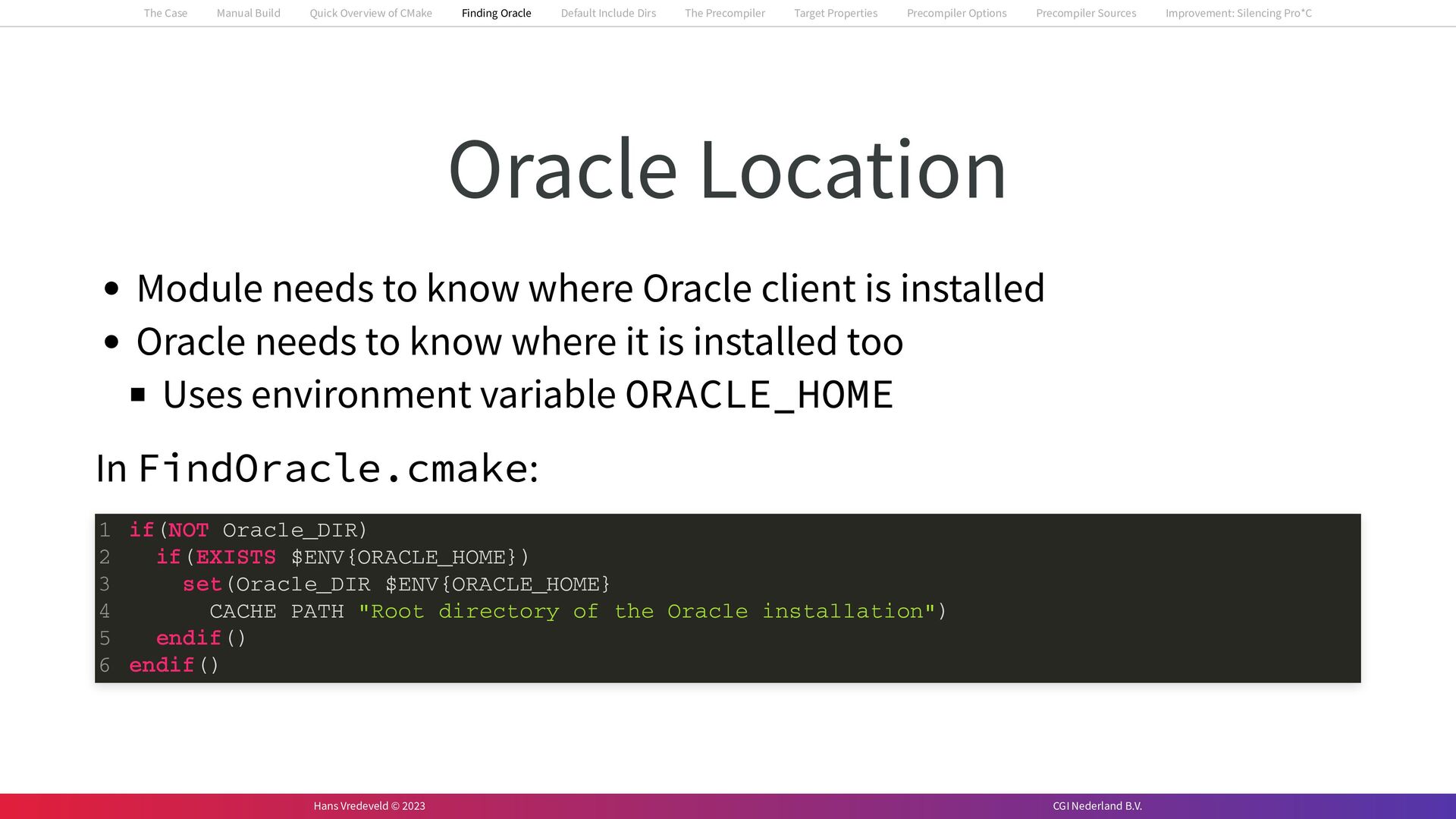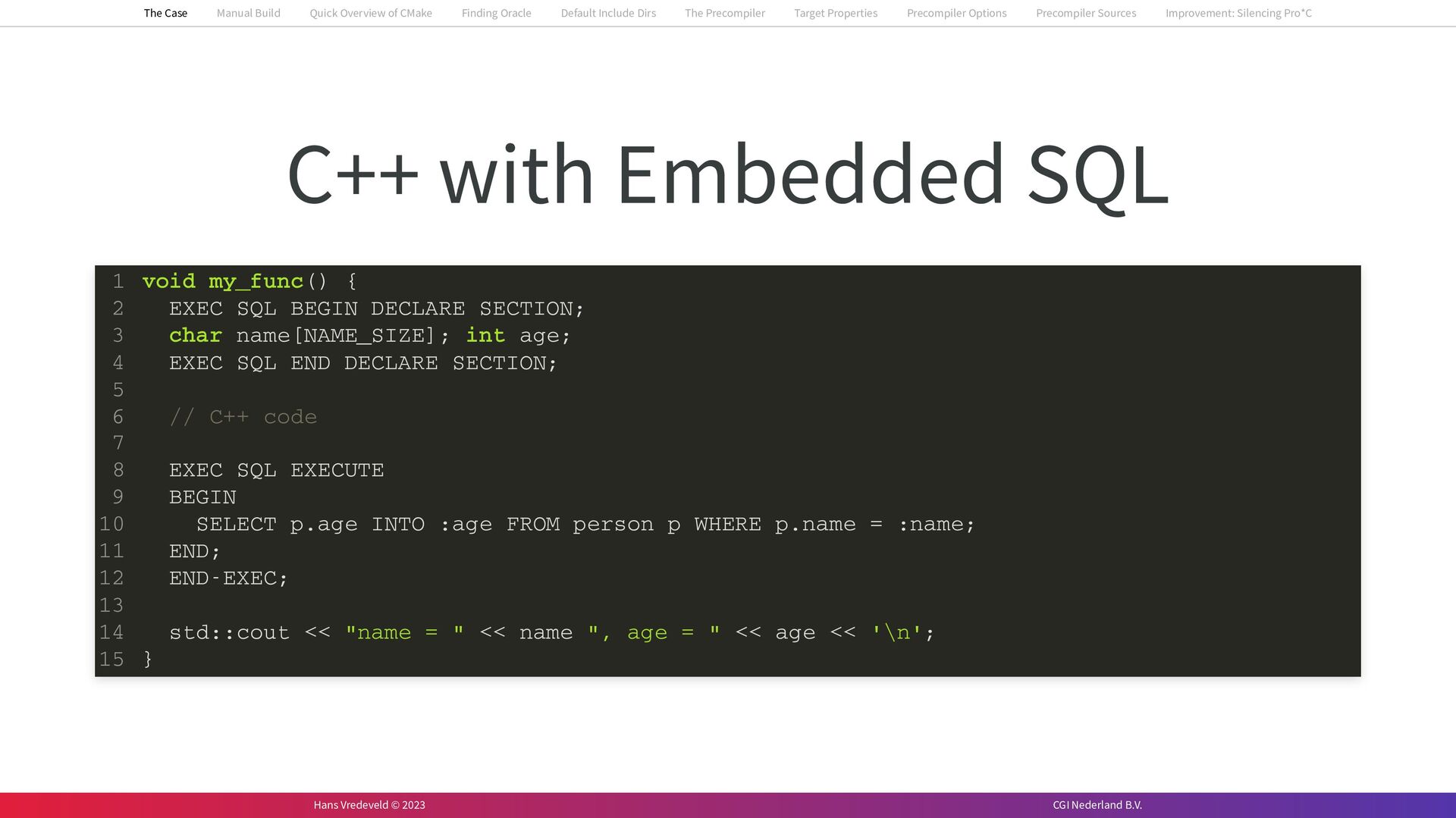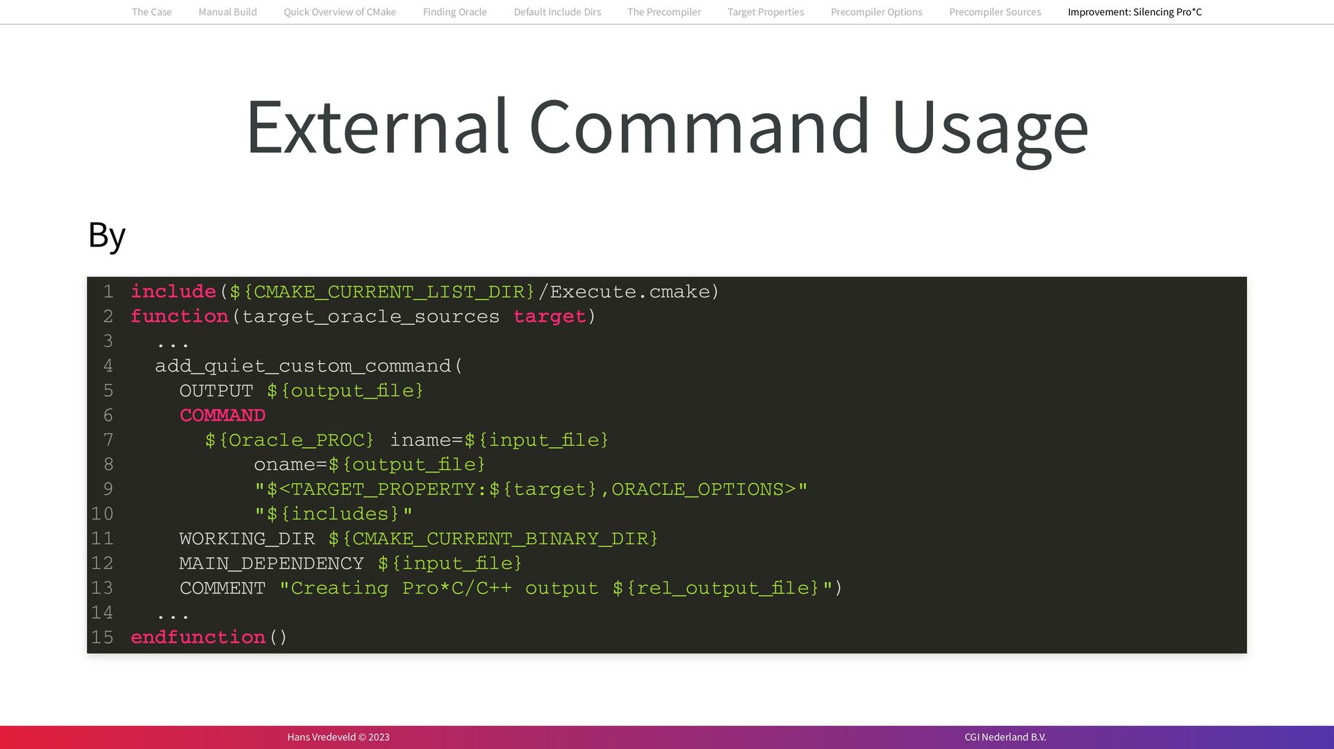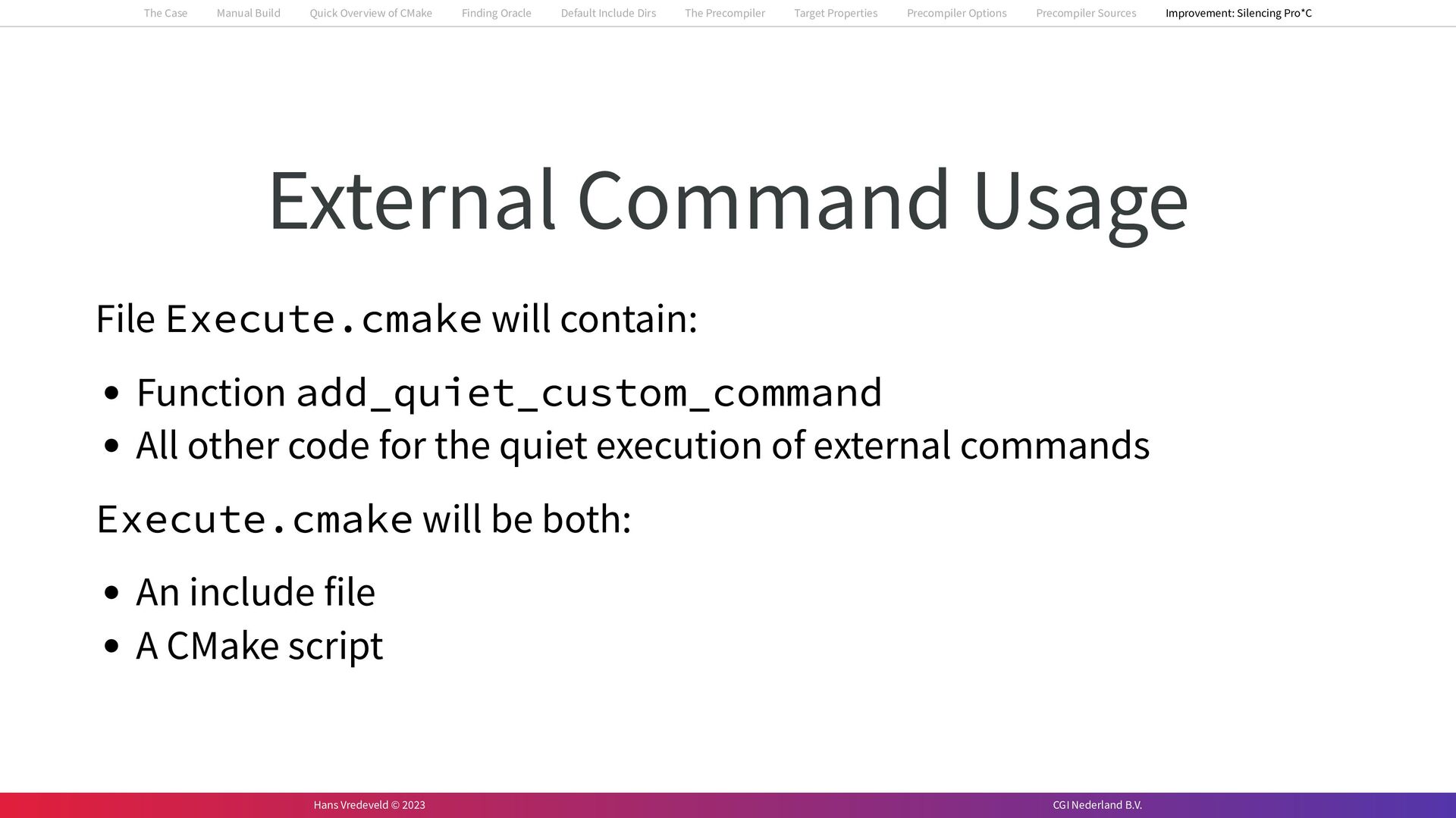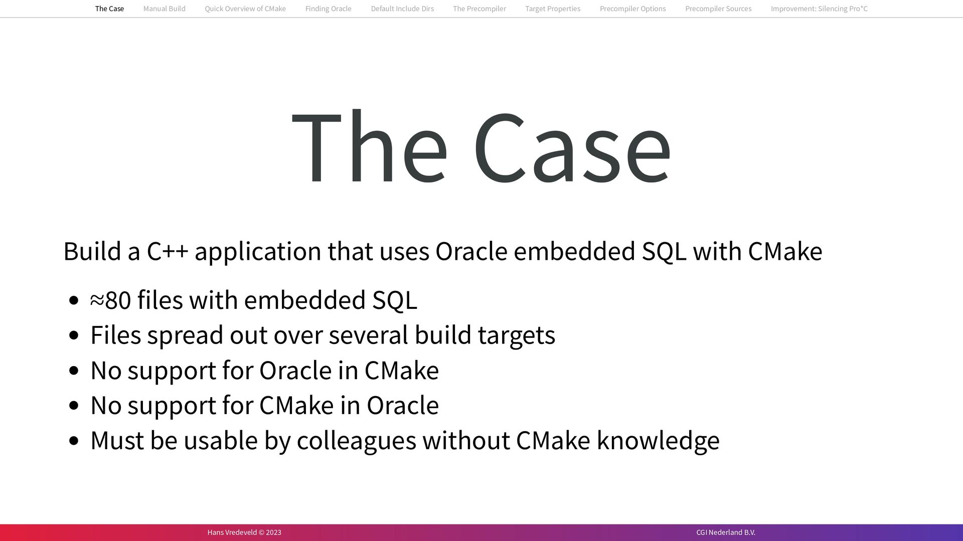In the case study, we will look at a C++-application that uses embedded SQL to talk to an Oracle SQL-database. To build the application, it needs to link against Oracle’s client library, and the files with embedded SQL need to be converted to pure C++ before they can be compiled. How can we find that library when there is no CMake module for it yet? (We write our own!) How can we execute Oracle’s preprocessor to convert files with embedded SQL in a structured way when there are tens, or hundreds, of those files, possibly spread over different CMake targets? Come to my talk and I will tell you.