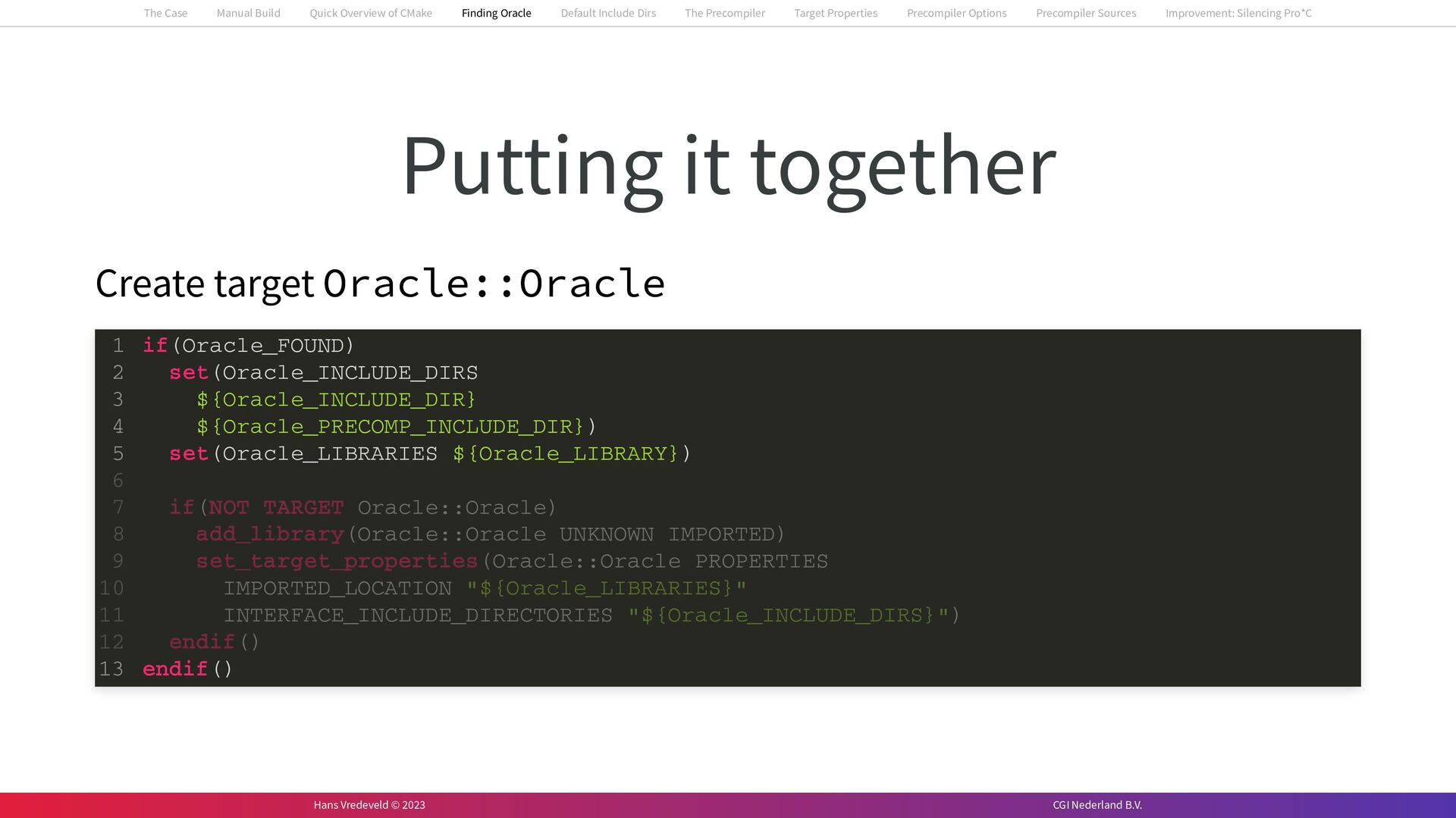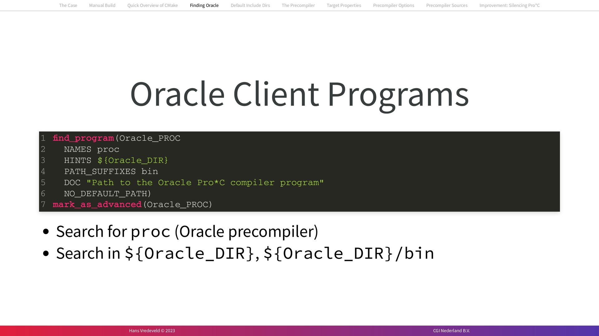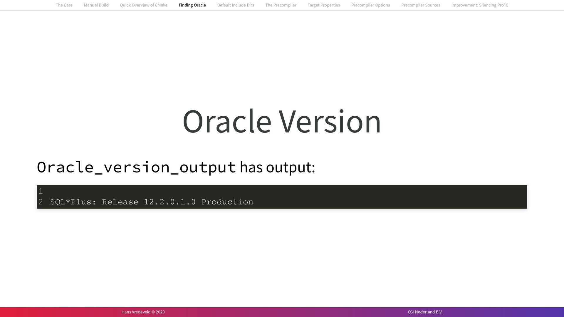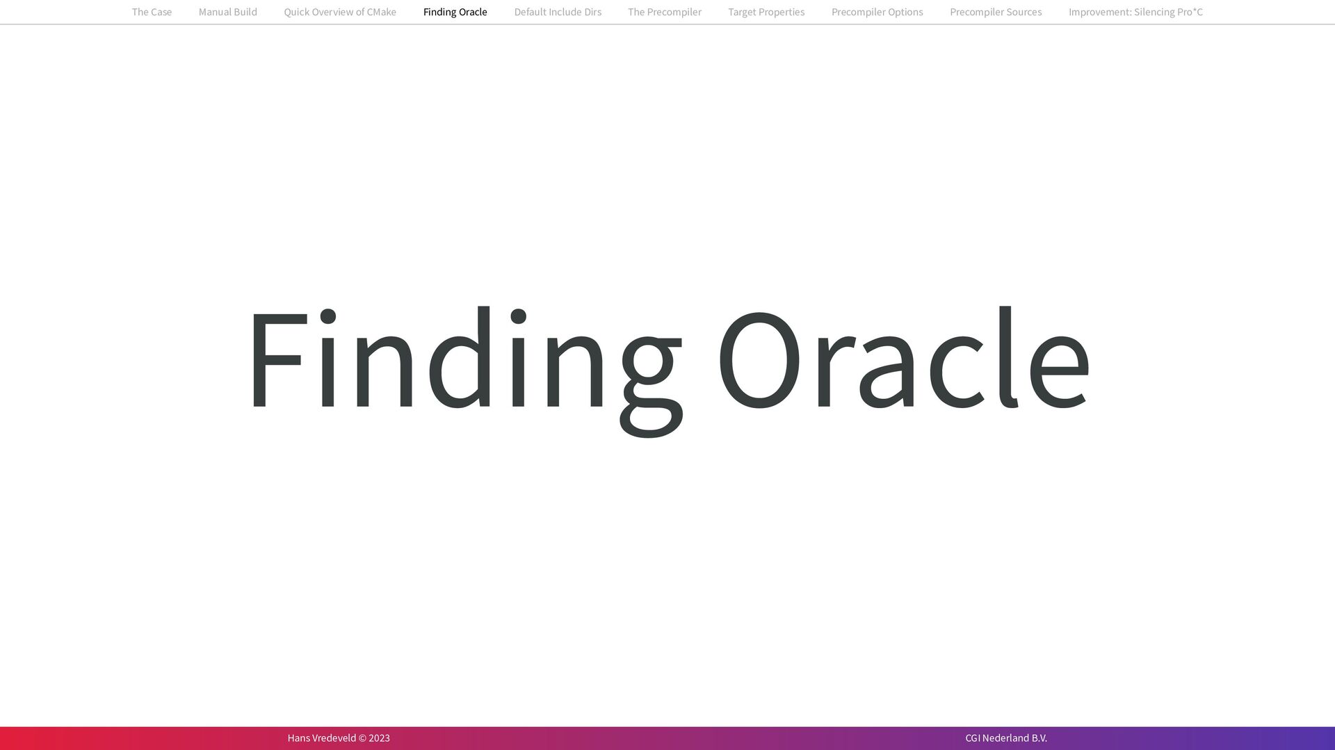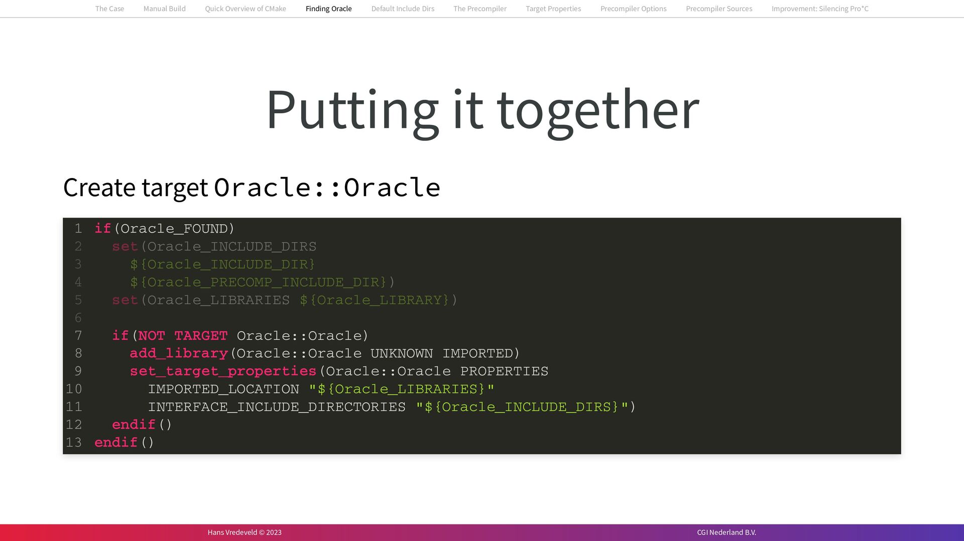 In the case study, we will look at a C++-application that uses embedded SQL to talk to an Oracle SQL-database. To build the application, it needs to link against Oracle’s client library, and the files with embedded SQL need to be converted to pure C++ before they can be compiled. How can we find that library when there is no CMake module for it yet? (We write our own!) How can we execute Oracle’s preprocessor to convert files with embedded SQL in a structured way when there are tens, or hundreds, of those files, possibly spread over different CMake targets? Come to my talk and I will tell you.