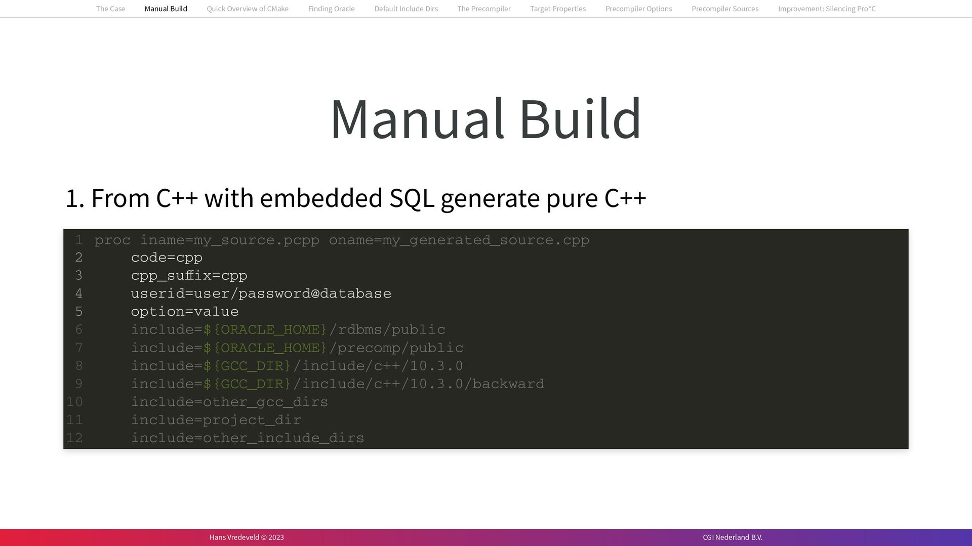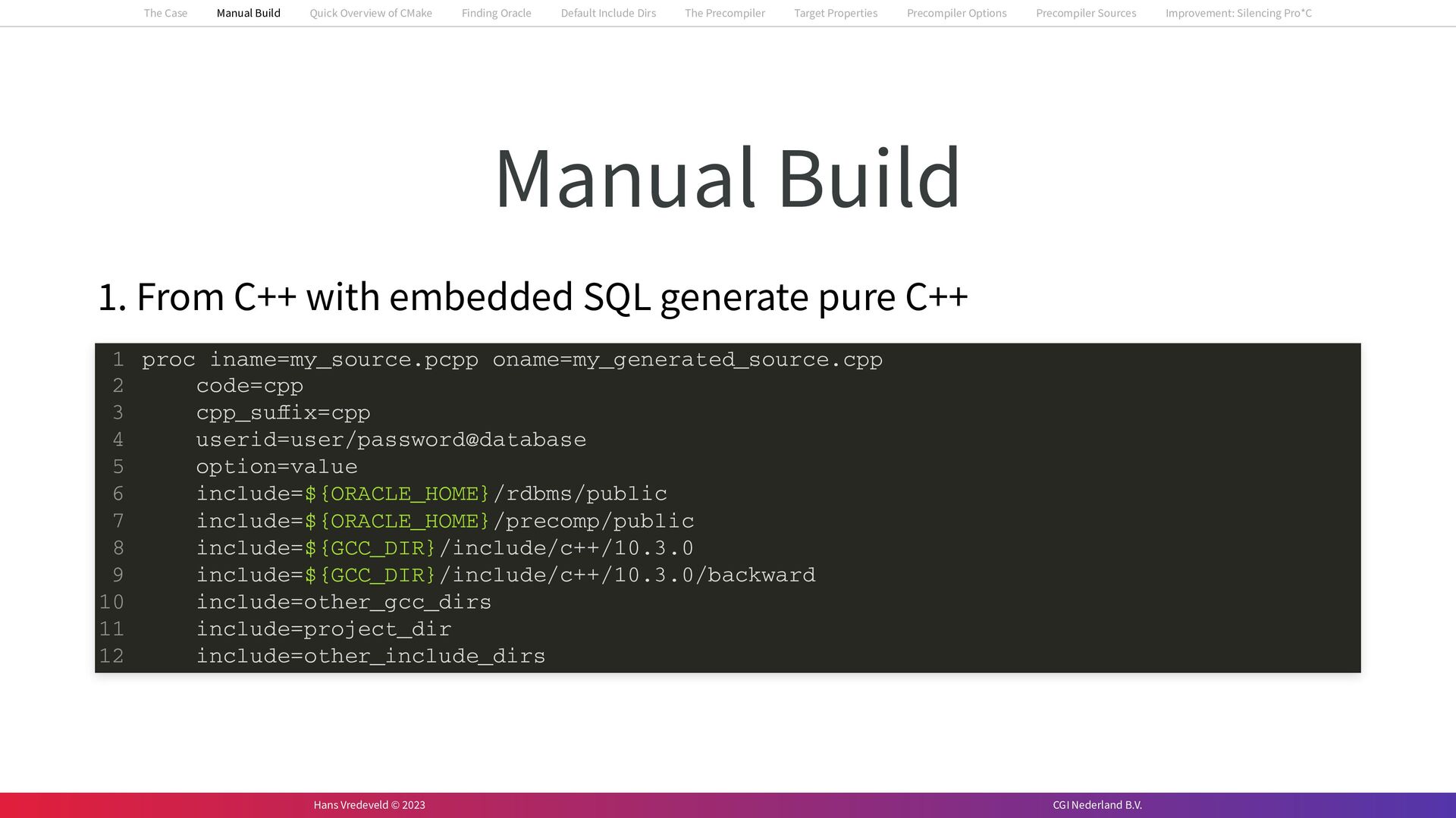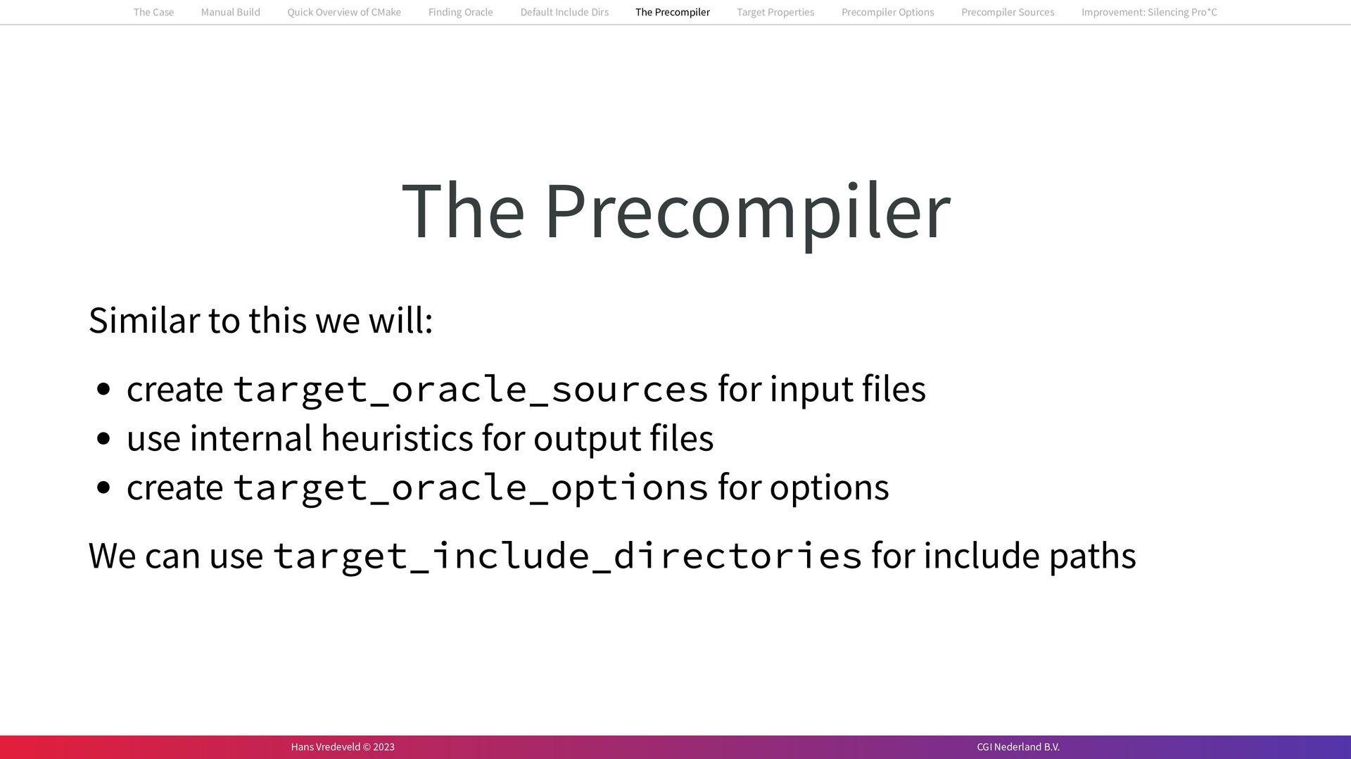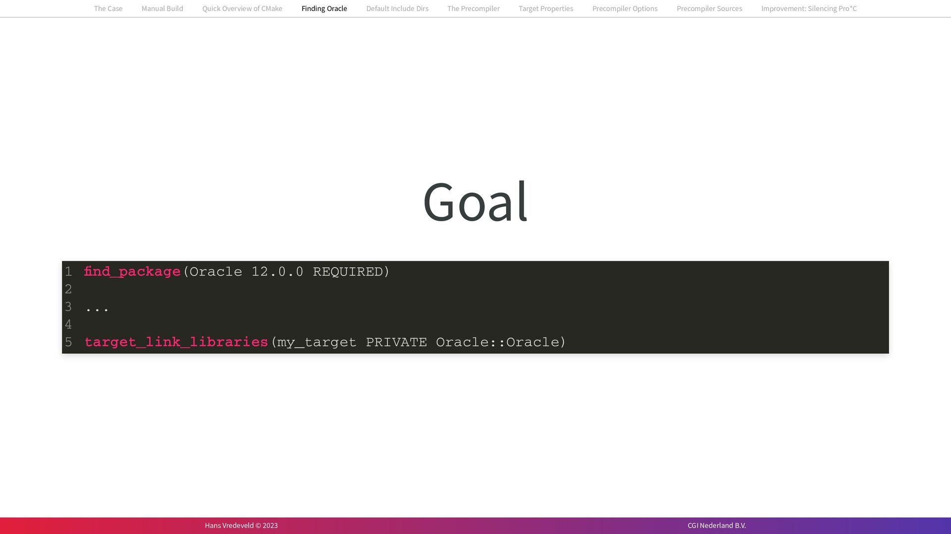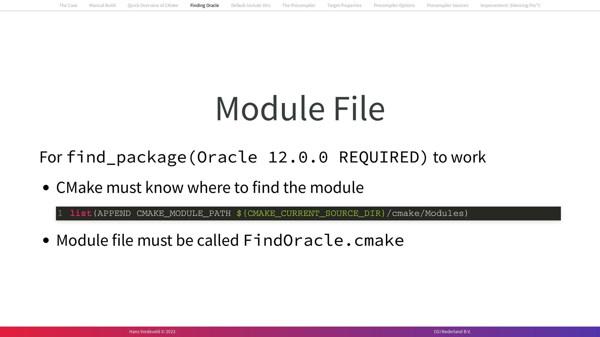 In the case study, we will look at a C++-application that uses embedded SQL to talk to an Oracle SQL-database. To build the application, it needs to link against Oracle’s client library, and the files with embedded SQL need to be converted to pure C++ before they can be compiled. How can we find that library when there is no CMake module for it yet? (We write our own!) How can we execute Oracle’s preprocessor to convert files with embedded SQL in a structured way when there are tens, or hundreds, of those files, possibly spread over different CMake targets? Come to my talk and I will tell you.